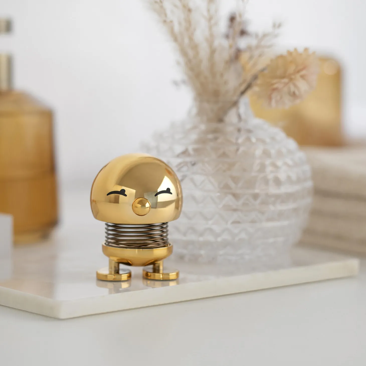 En Hoptimist står for glæde, håb og optimisme. Men også for klassisk design. Den klassiske Hoptimist fås også i en eksklusiv, skinnende guld-variant, der skaber blikfang i alle rum. Med sin reflekterende overflade genspejler den omgivelserne, præcis ligesom smil spejles fra person til person.