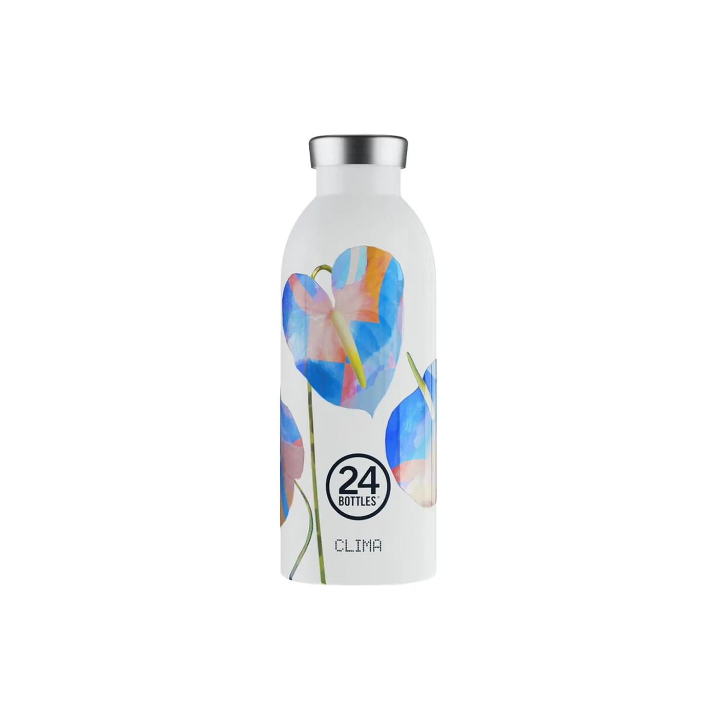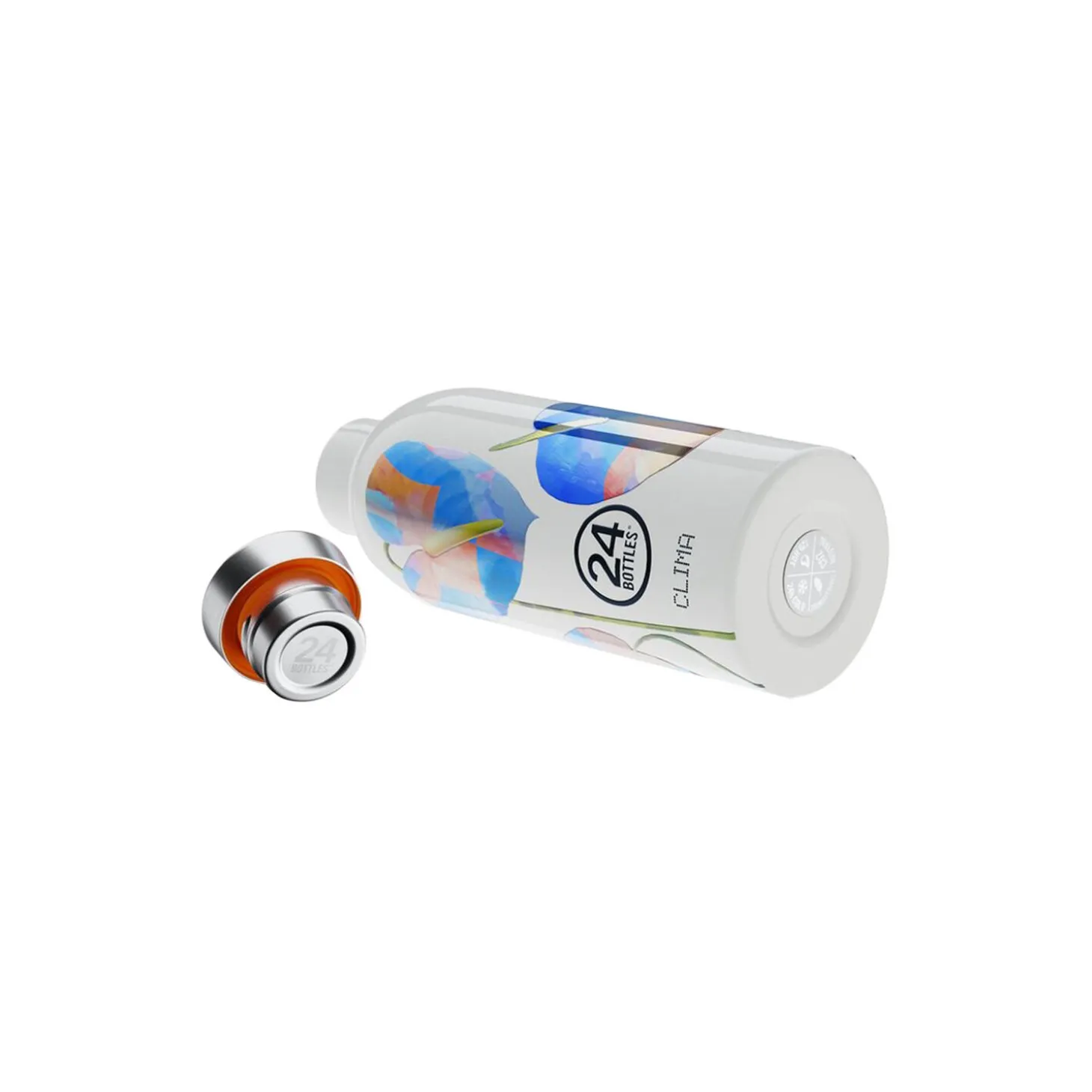 Clima termoflaske i rustfrit stål fra 24Bottles. Farve: cosmic flowers. Mål: H: 20,4 x Ø 7,3 cm. Indeholder: 500 ml.