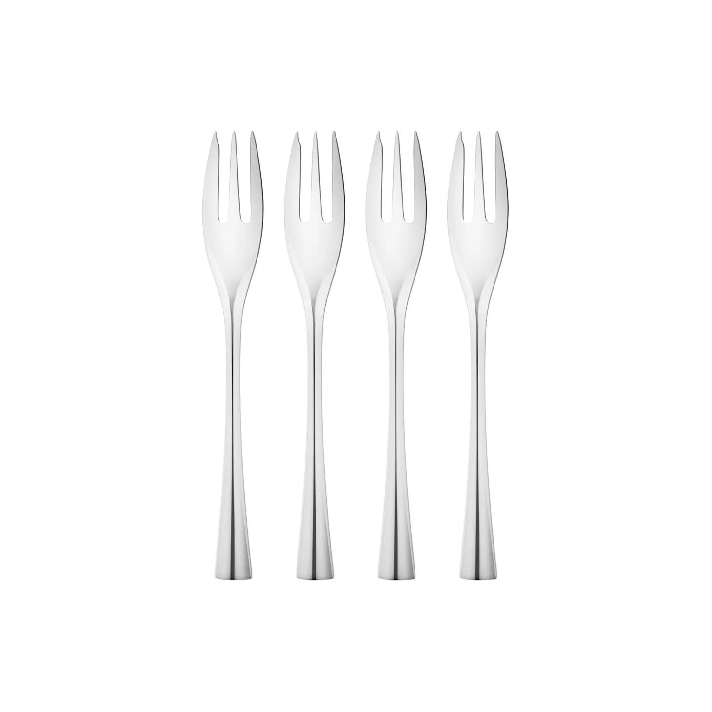 Dette sæt består af fire Cobra kagegafler fra Georg Jensen. Kagegaflerne er fremstillet i blankt rustfrit stål. Produktet tåler ikke opvaskemaskine.
