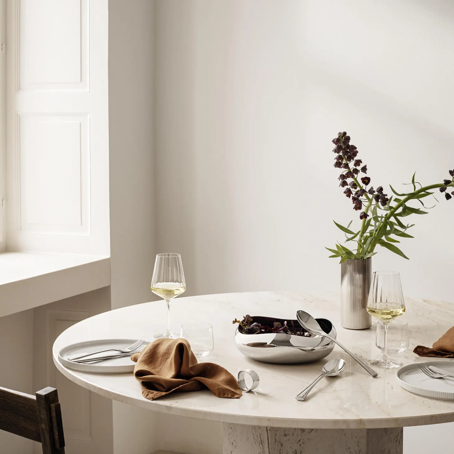 Dette elegante salatsæt fra Georg Jensen består af en serveringsgaffel og en serveringsske. Salatsættet er fremstillet i blankt rustfrit stål. Produktet tåler ikke opvaskemaskine.