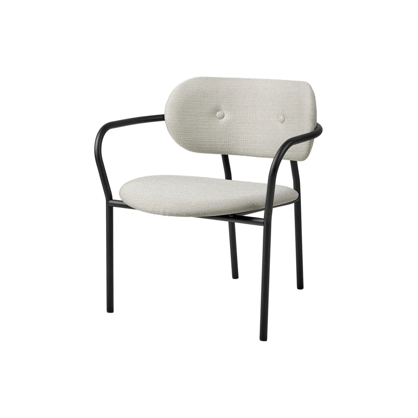 Coco Lounge Chair fuldpolstret i Eero Special 106 tekstil af Dedar og stel i lakeret stål fra GUBI. Farve: Eero Special 106/black matt. Mål: H: 71,5 x B: 68 x D: 67 cm. Siddehøjde: 41 cm. Design: OEO Studio.