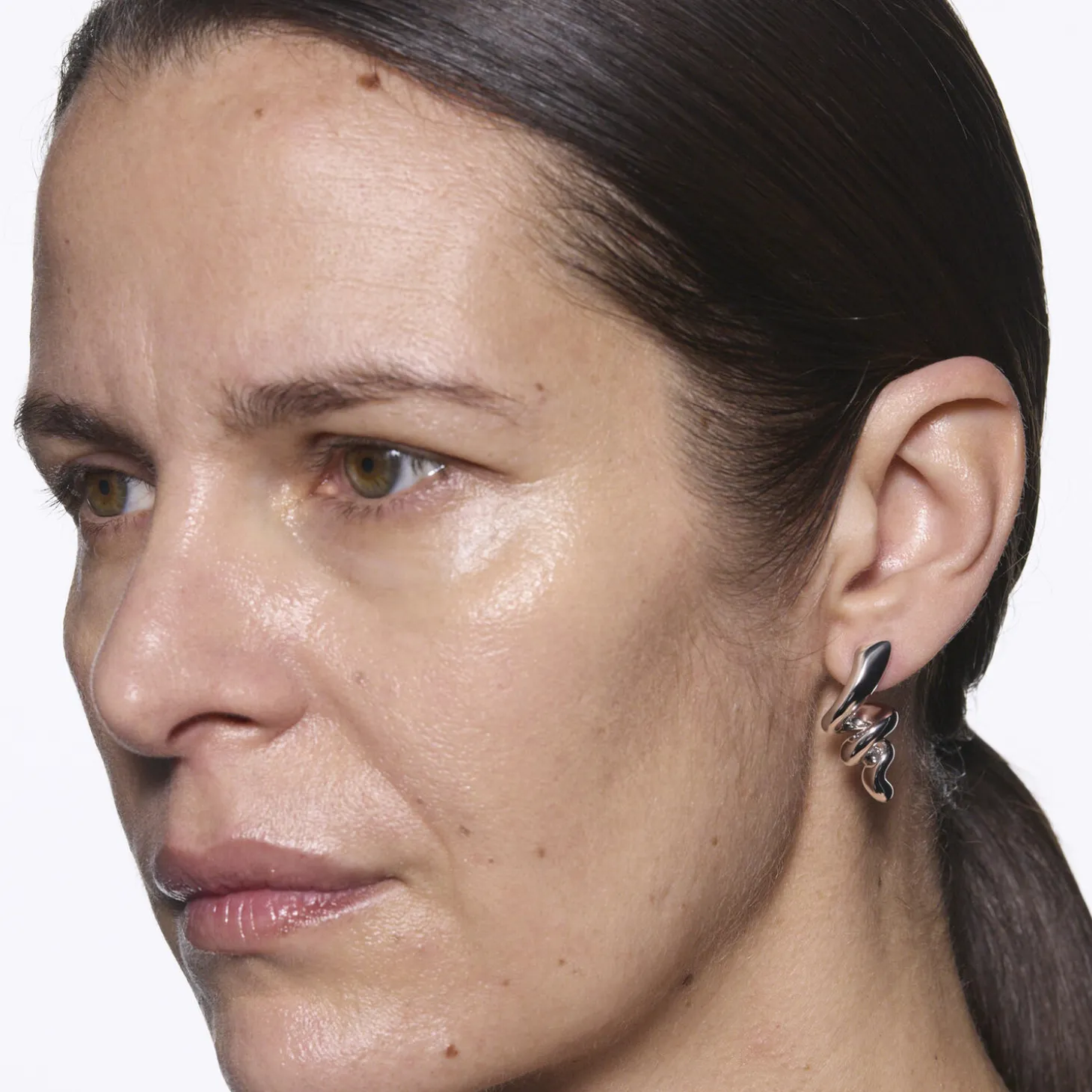 En spole hvirvler lodret nedad og vrider sig i form og form. En futuristisk elegant ørering, der indrammer ansigtet. Nikkelfri og allergivenlig. Hulformet til let slid. Stor bulletback øreringe lukning for sikker og behagelig brug. Designet i Danmark.