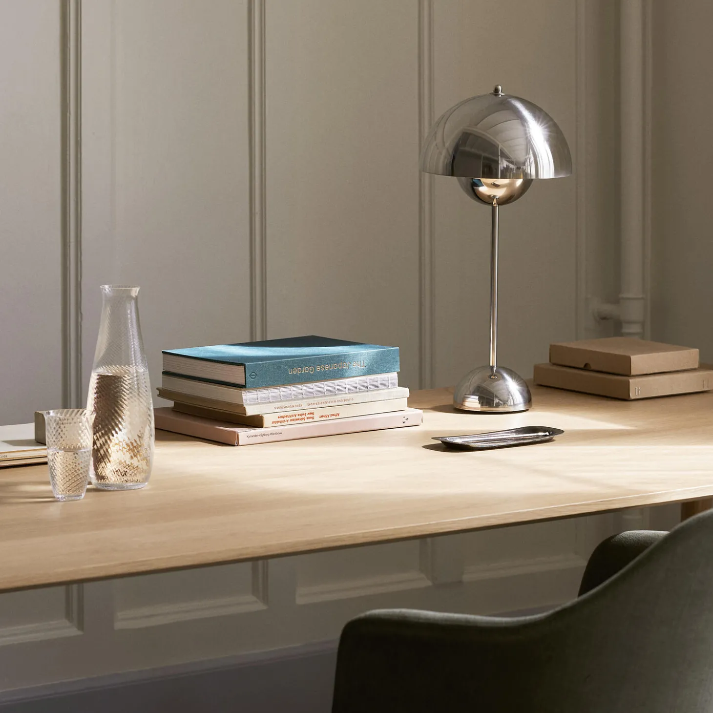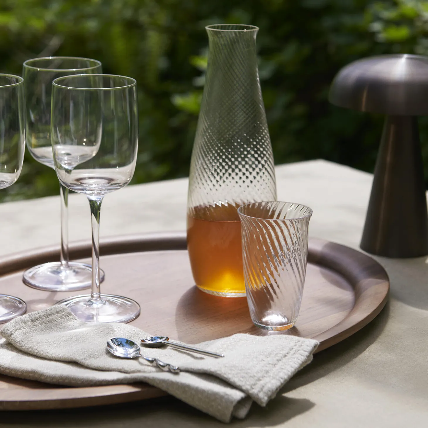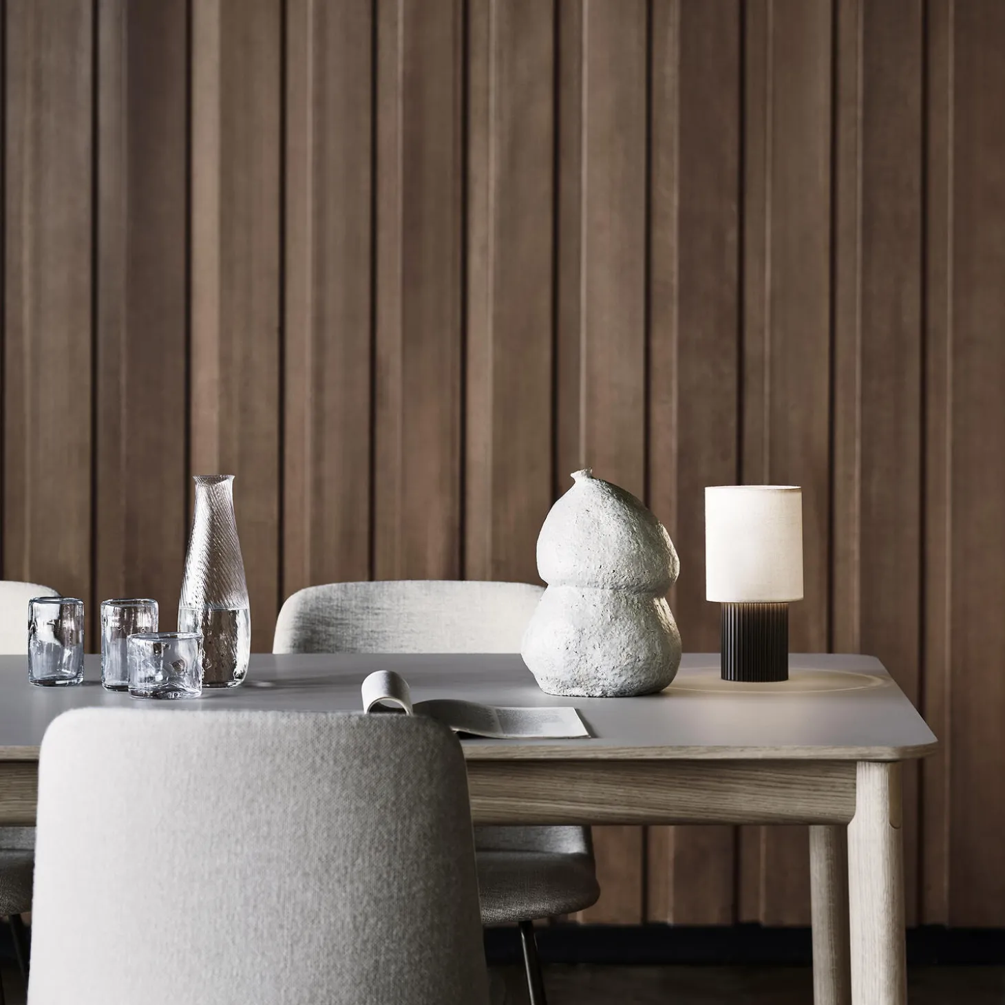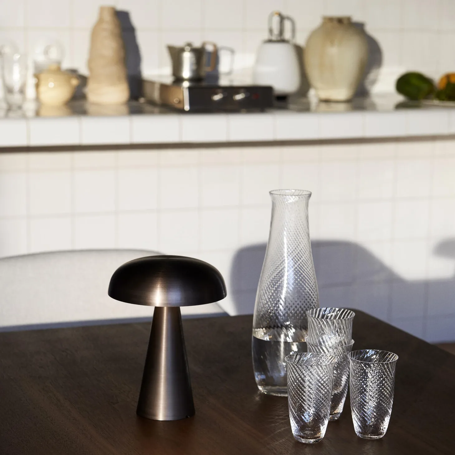 Simple and decidedly modern in appearance, this glass and carafe set boast a subtle whirlpool motif that mirrors the swirling nature of water. Nodding to a common feature in Asian design, the glasses include a small lip on their edge that creates a natural place for the lip to rest. They are part of Collect, a curated line of beautifully crafted soft furnishings and home objects designed by Space Copenhagen. Both pieces are available as small or large.
