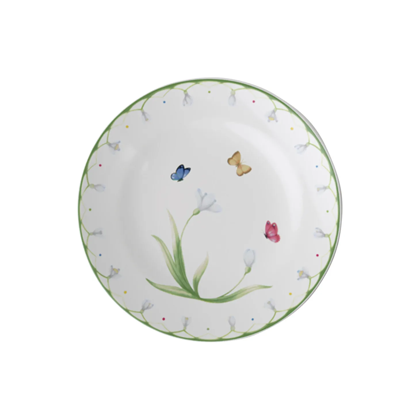 Our timelessly beautiful Colourful Spring collection will delight you all year round. The main actors on the beautifully shaped pieces are delicate snowdrops and colourful butterflies. They give the collection cheerful splashes of colour and brighten up every dull moment. This small plate is the ideal addition for your large Sunday dinner or festive meal. But you can also serve bread or butter on it every day. Enjoy this spring design every day anew.