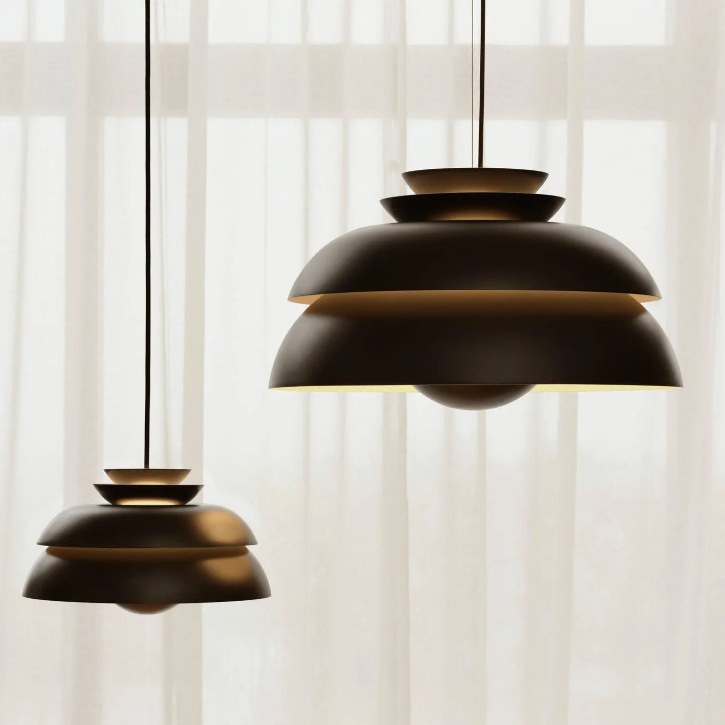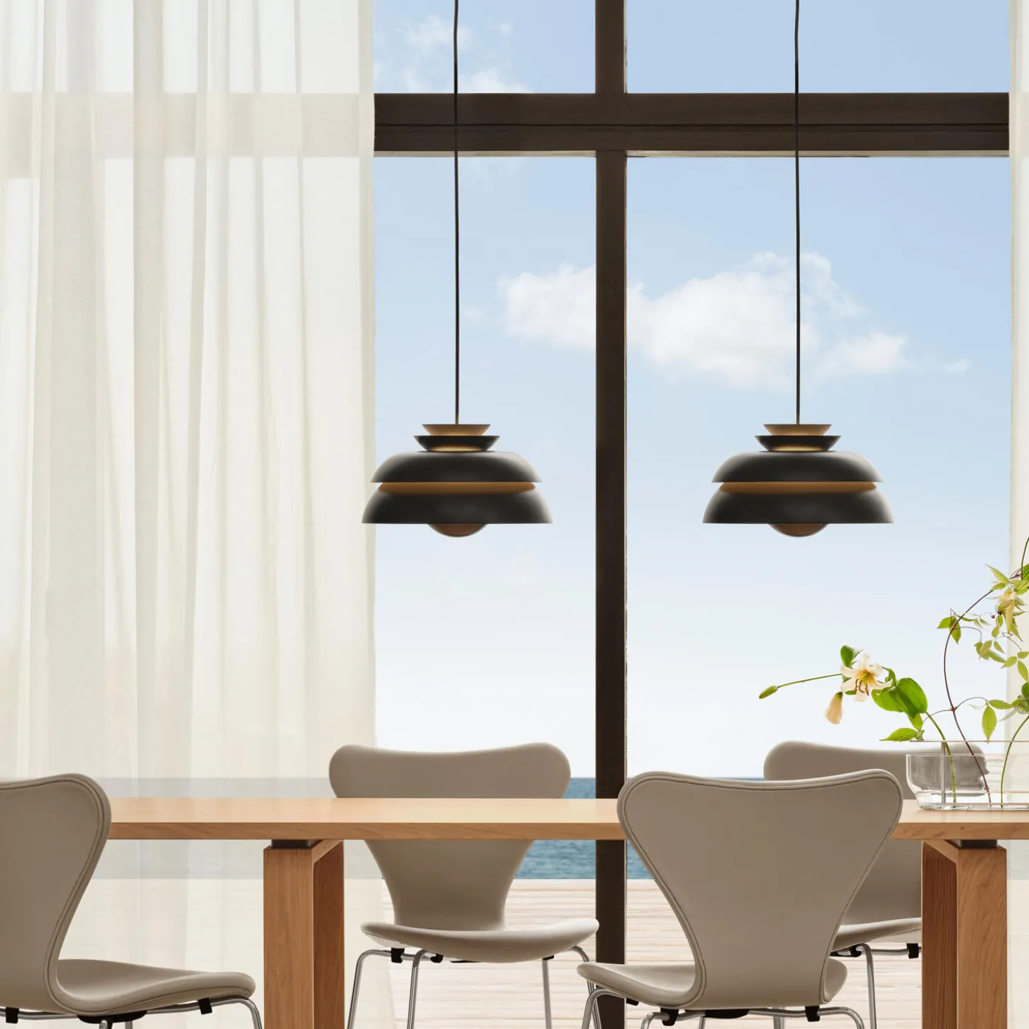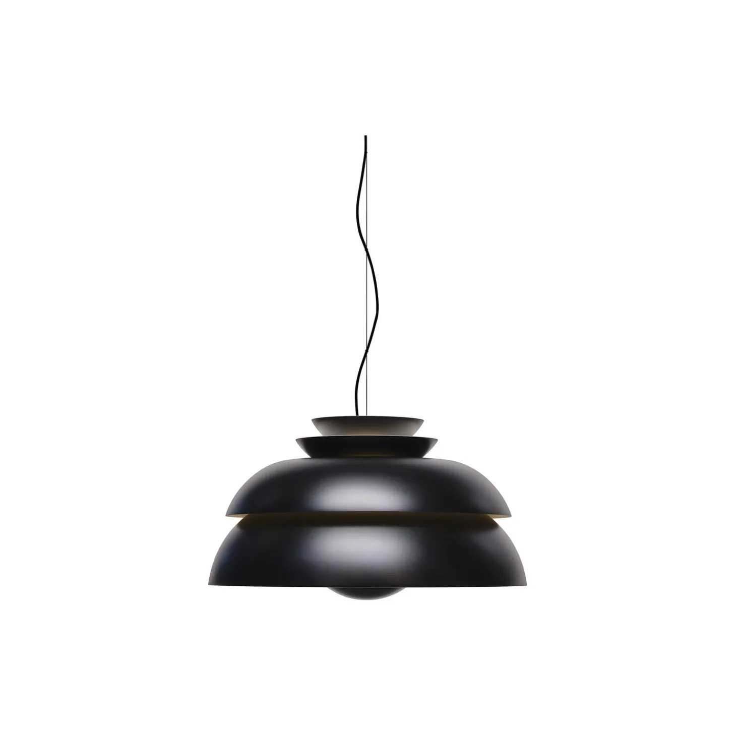 Concert P3 pendel i pulverlakeret stål fra Fritz Hansen. Farve: sort. Mål: H: 32 x Ø 55 cm. Lyskilde: 150W E27. Design: Jørn Utzon.