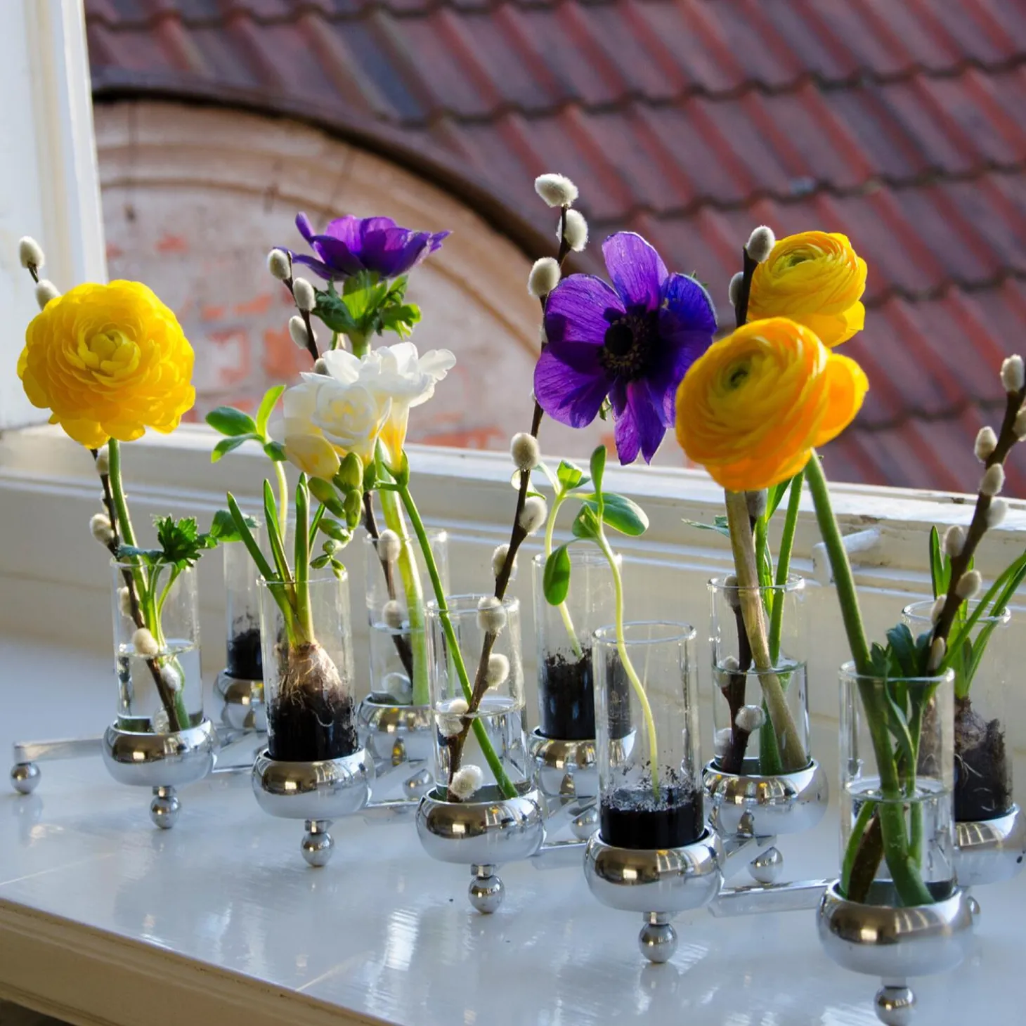 A pleasant source of light for tealights, where you can choose your own shape, a straight line, a circle, a star, a zig-zag or the shape of your choice. CONSTELLA comes in two sizes; with five or ten tealight holders. Other attachments can be added, special fittings for conventional candles, glass insert that works as a small vase for floral decorations, black metal holders for candles and brass star for decoration.