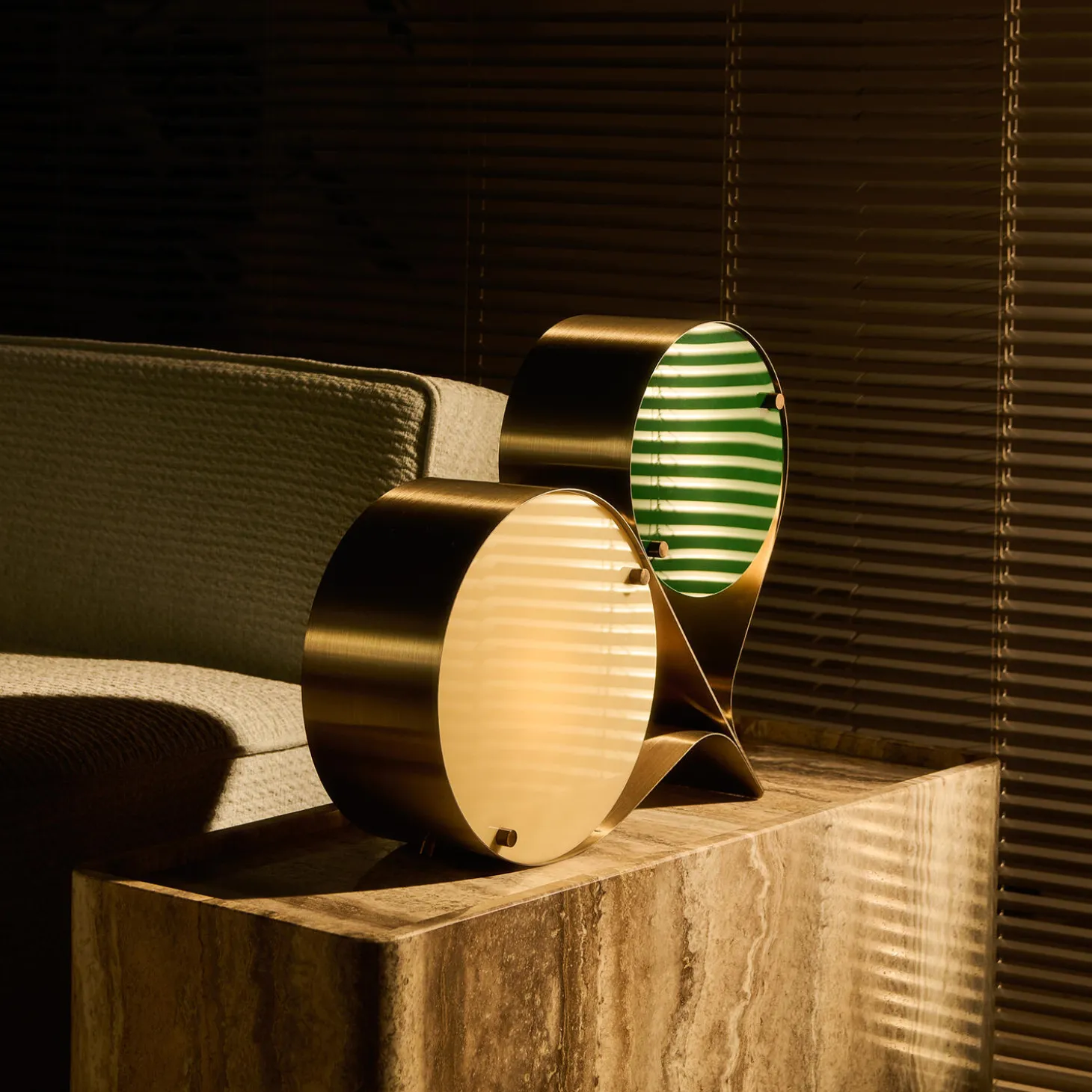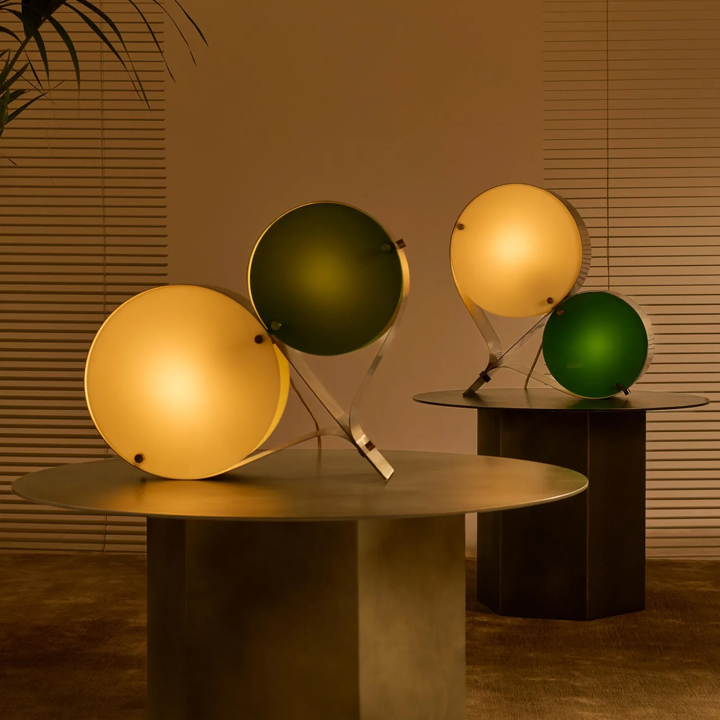 The Coppia Table Lamp is a new sculptural twin-bulb table lamp designed for GUBI by Vibeke Fonnesberg Schmidt. Featuring two discs of Fonnesberg Schmidt’s signature plexiglass housed in a curving metal case, the elegantly industrial design represents both a new material and a new designer for GUBI. The fluid yet geometric design is sturdy enough to be used as either a table or floor lamp, moving easily from desktop to bedside, shelf to windowsill as desired.