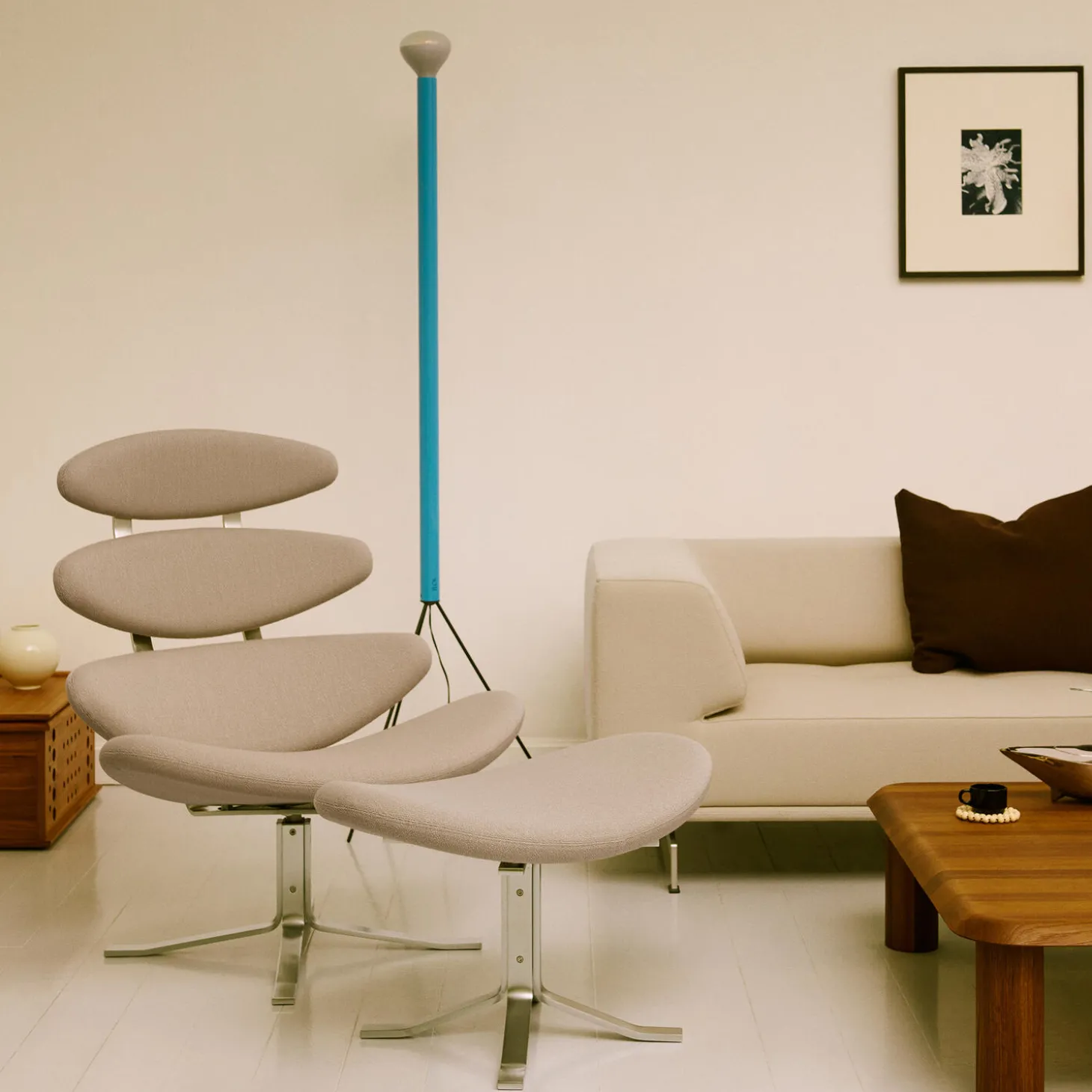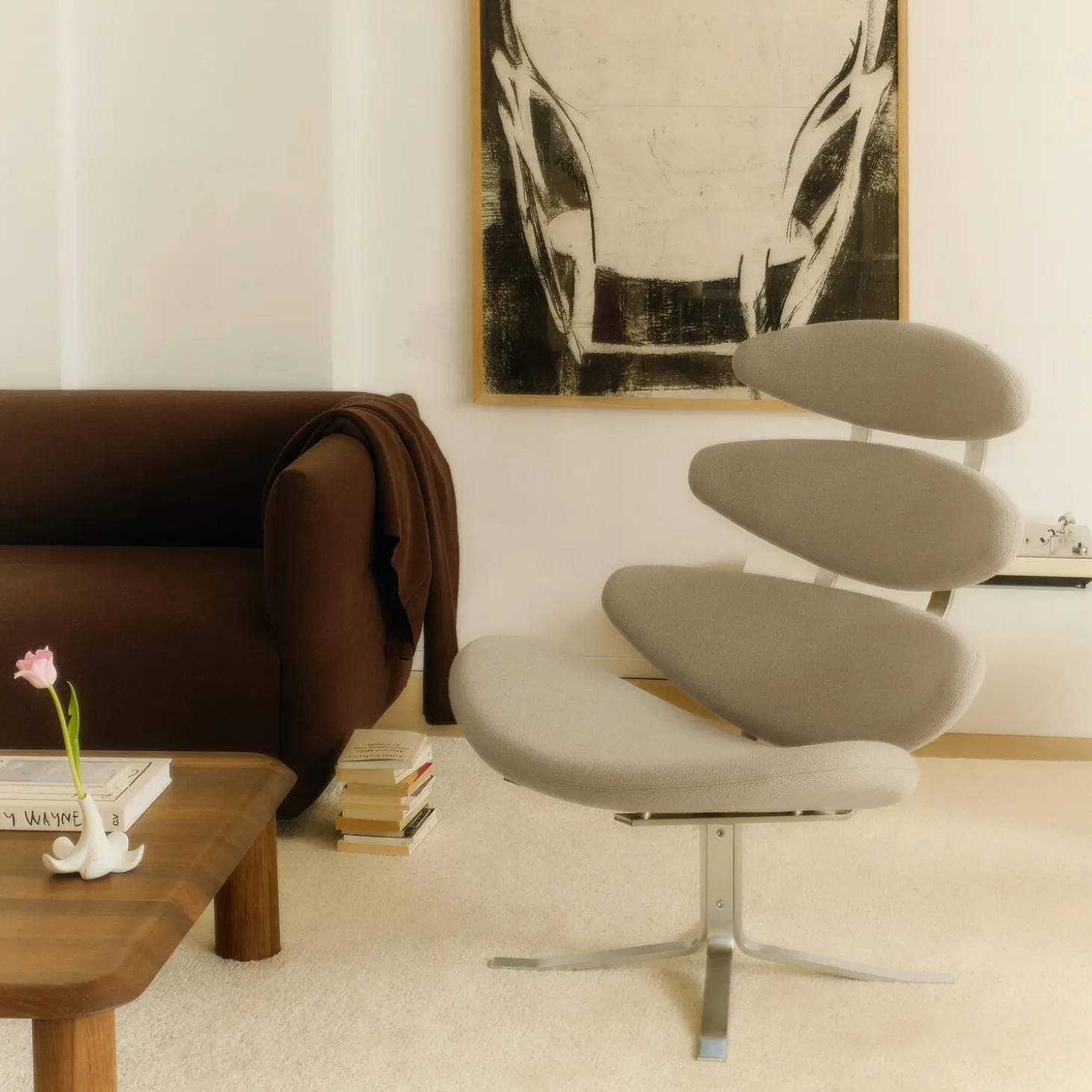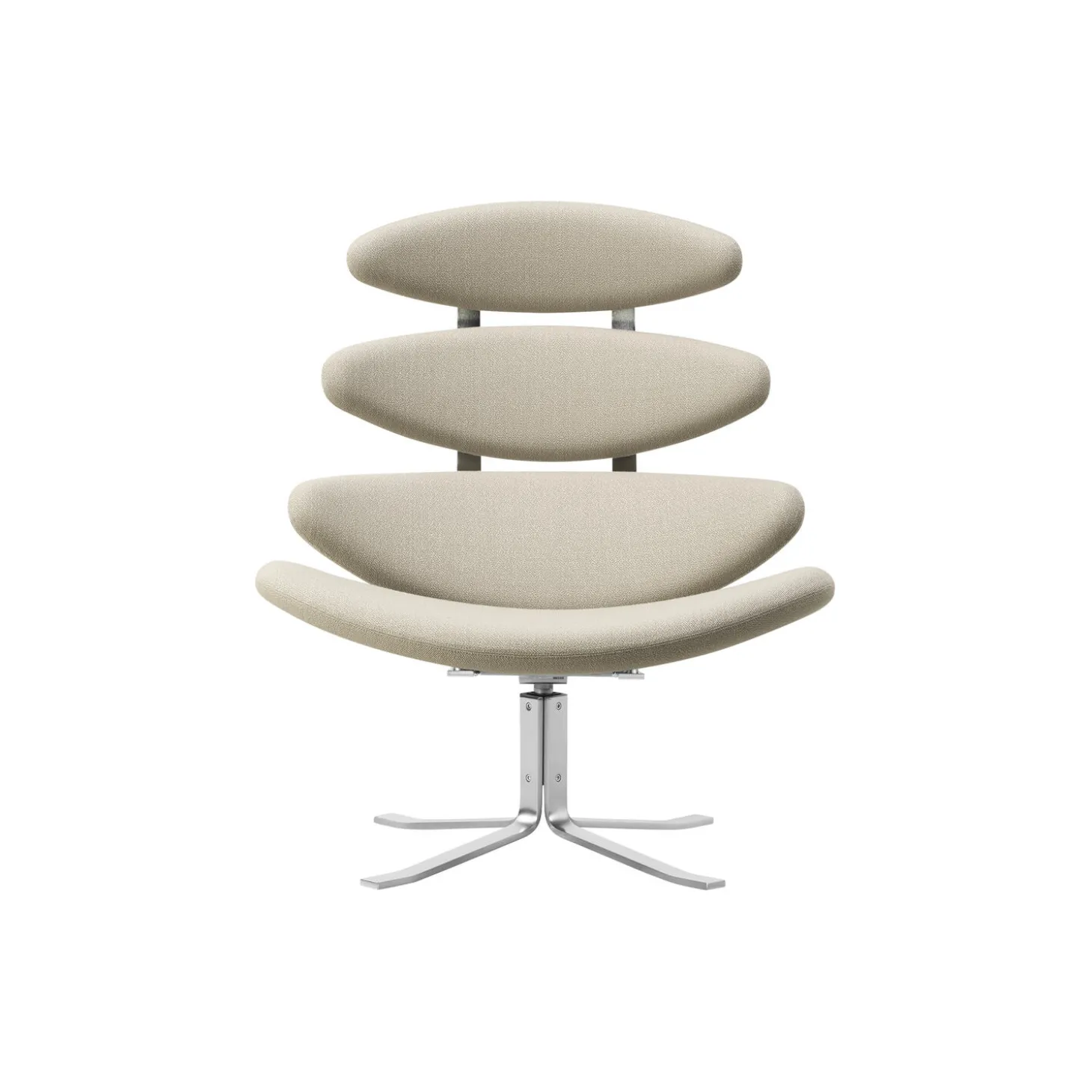 Corona stolen er en iøjnefaldende og eksperimenterende ener i dansk design. Stolen er kendt for sin ikoniske silhuet med ellipseformede, polstrede sædepuder, der gradvist øges i størrelse. Corona har et drejestel og en fleksibel ryg, der gør stolen yderst komfortabel og velegnet til private hjem såvel som lobbyer og kontormiljøer.