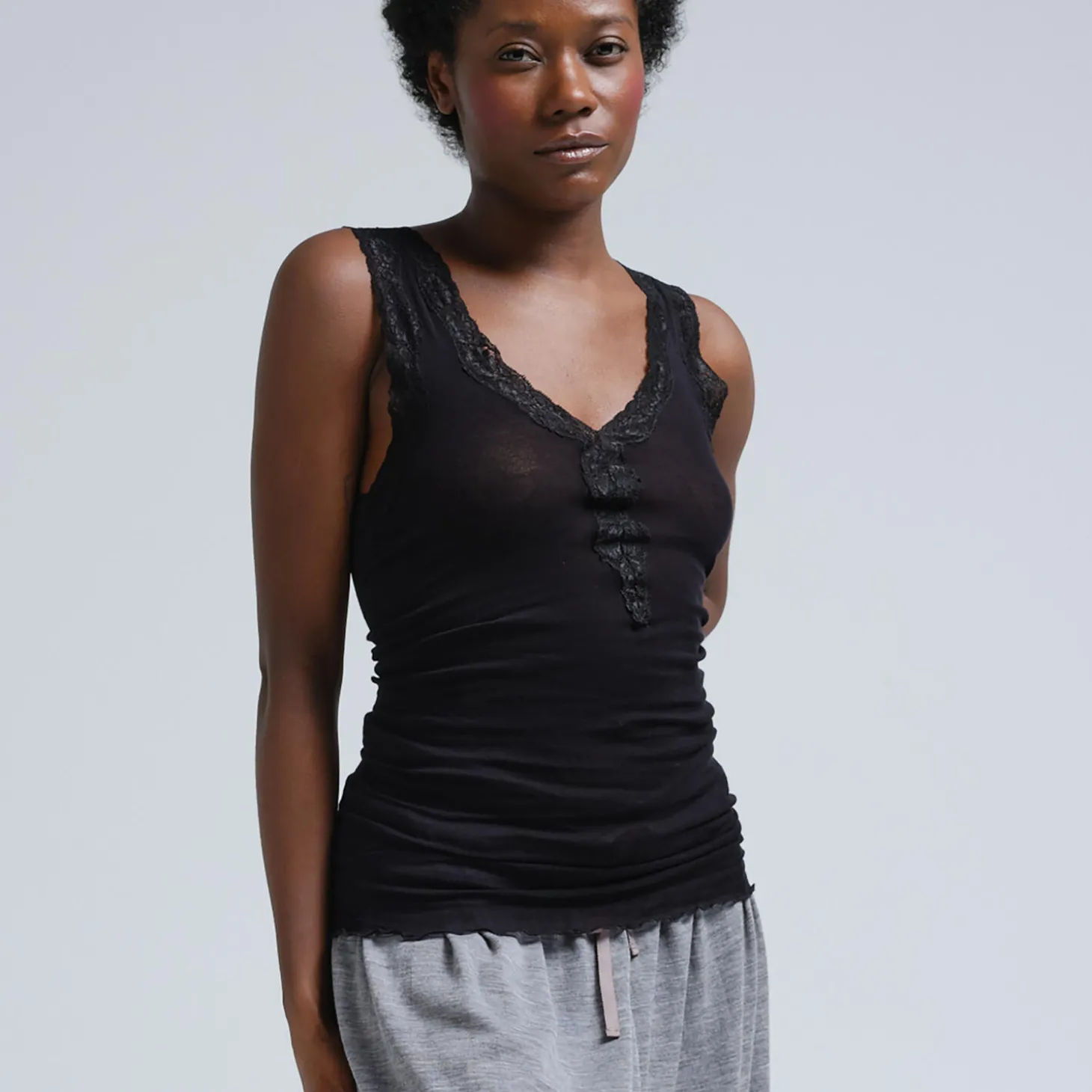 Tank top med dyp V-hals for og bag. Blondekant i halsudskæring og ærmegab. Toppen har overlockede kanter i bunden. Produceret i let og blød bomuld.