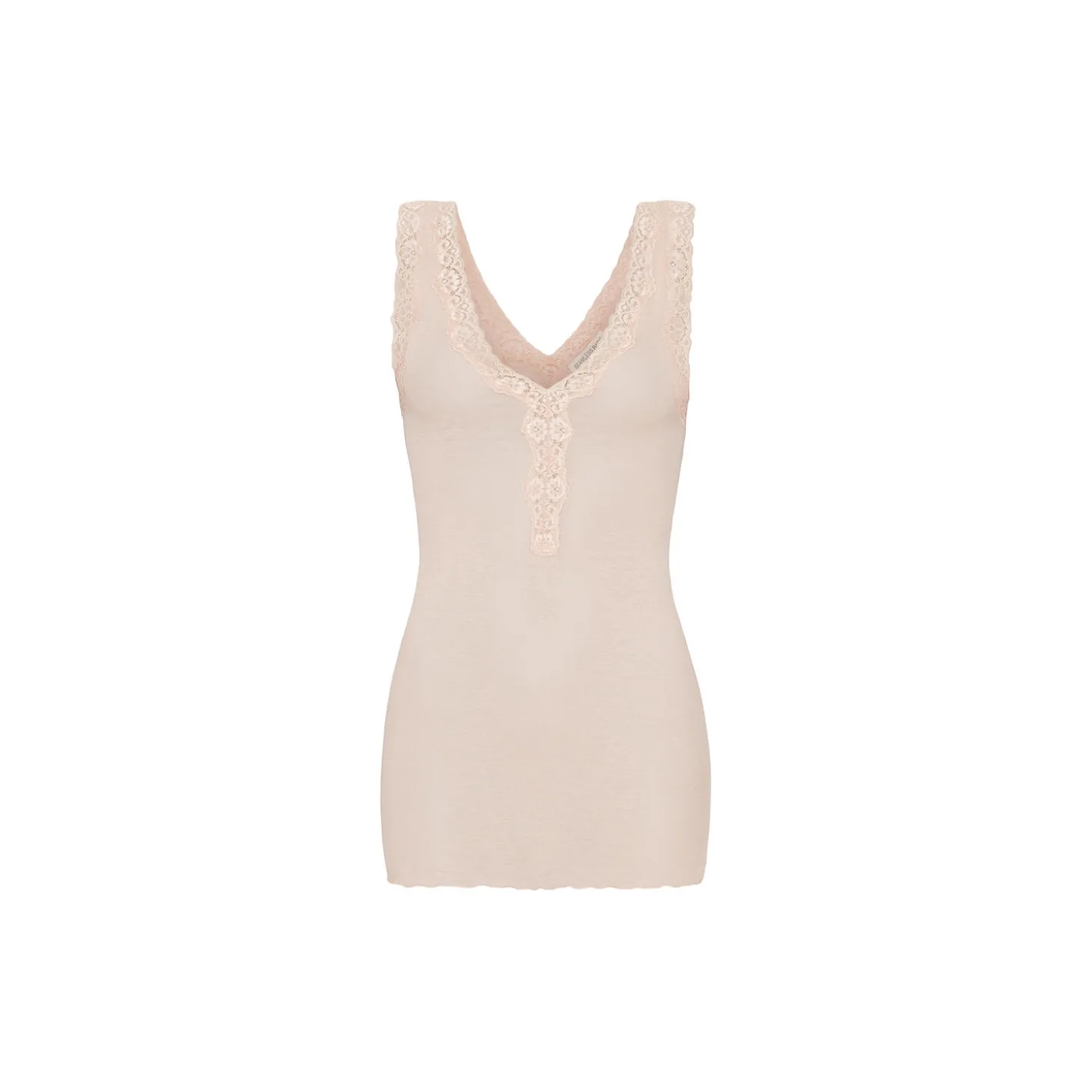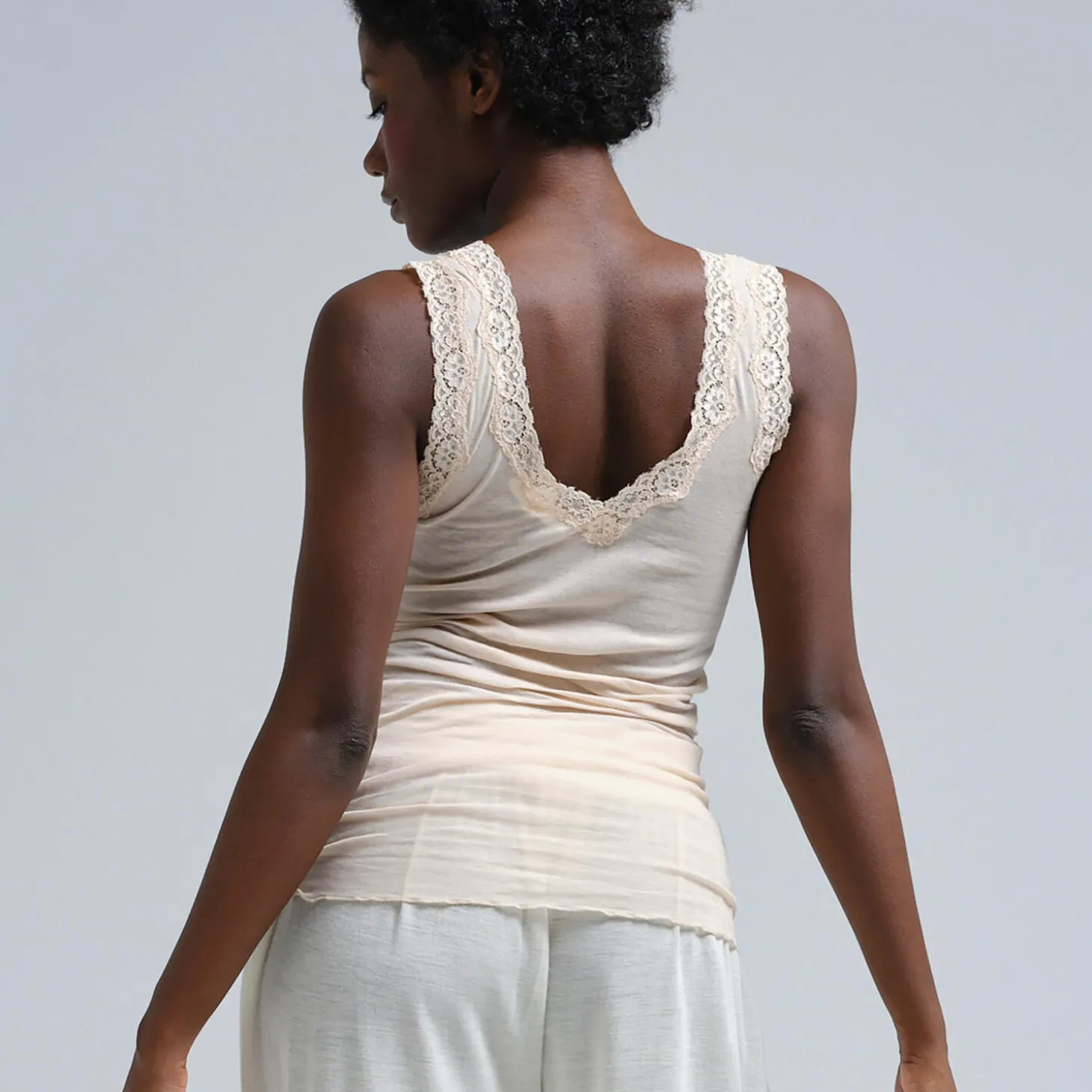 Tank top med dyp V-hals for og bag. Blondekant i halsudskæring og ærmegab. Toppen har overlockede kanter i bunden. Produceret i let og blød bomuld.