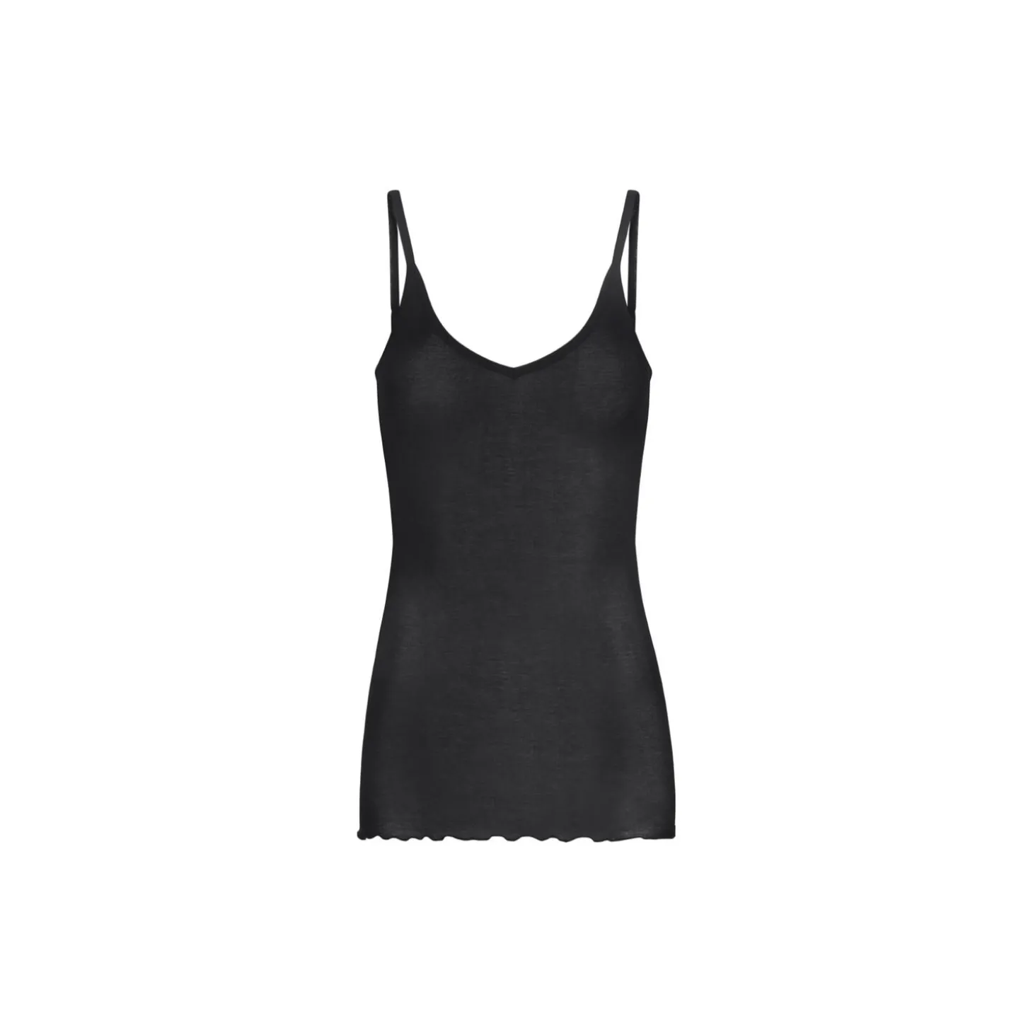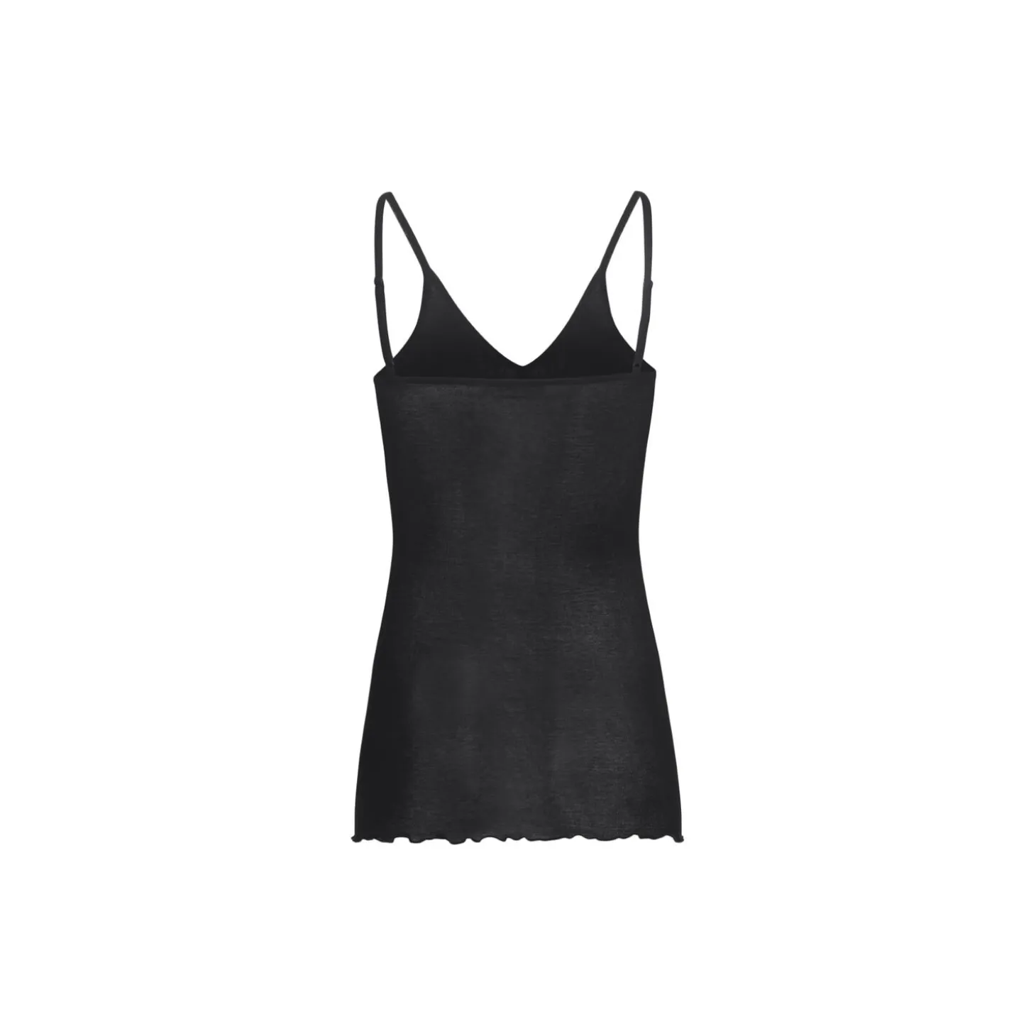 Cami top med dyp V-hals foran og lige overskæring bagpå. Justerbare skulderstropper. Toppen har overlockede kanter i bunden. Produceret i let og blød bomuld.