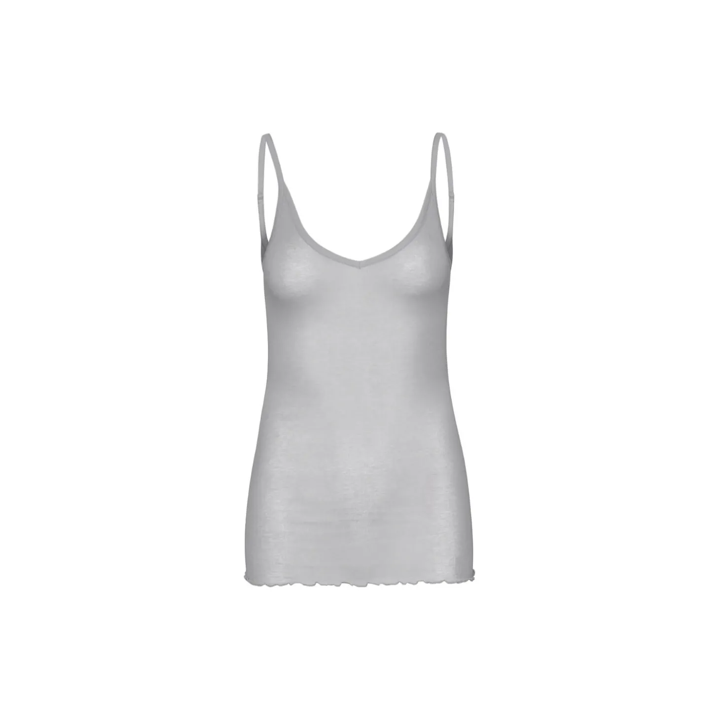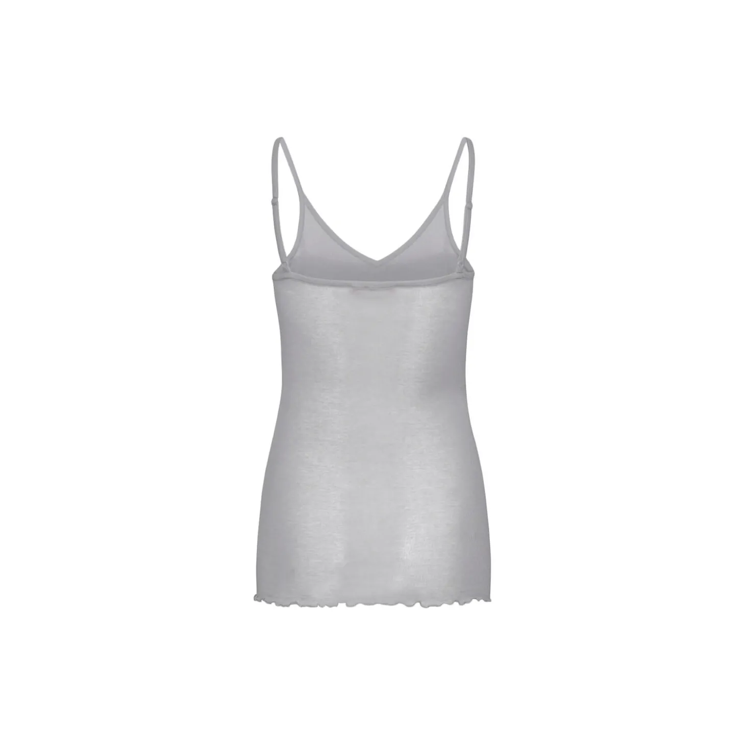 Cami top med dyp V-hals foran og lige overskæring bagpå. Justerbare skulderstropper. Toppen har overlockede kanter i bunden. Produceret i let og blød bomuld.
