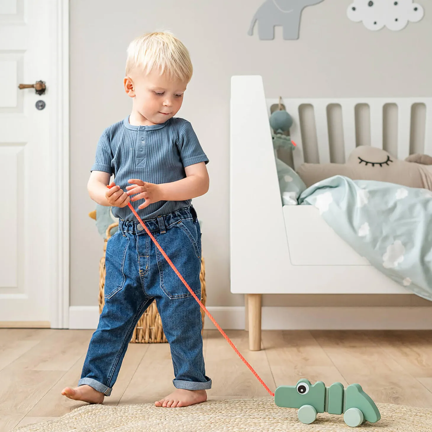 • Croco trækdyr i grøn • Anbefales fra 12+ måneder, eller når dit barn kan gå sikkert selv • Motiverer dit barn til at gå og lege med Croco • Crocos krop bevæger sig, når den bliver trukket afsted • Bløde hjul der er skånsomme mod gulve • Fremstillet af ansvarligt produceret træ og malet med vandbaseret maling, der er fri for skadelige stoffer – hvilket gør den sikker for dit barn at lege med