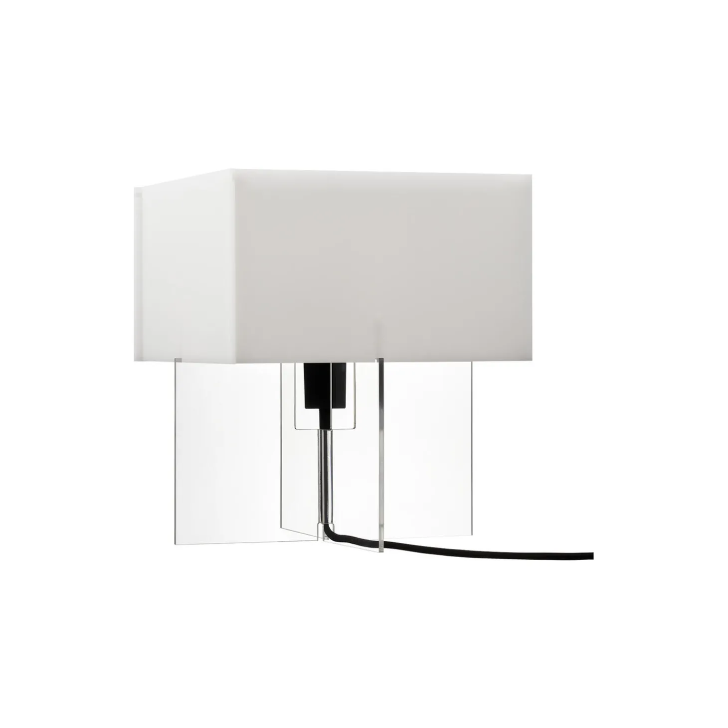 Cross-Plex™ T-300 bordlampe med skærm og base i akryl fra Fritz Hansen. Farve: klar/hvid. Mål: 30×40 cm. Lyskilde: maks. 70W E27. Design: Bodil Kjær.