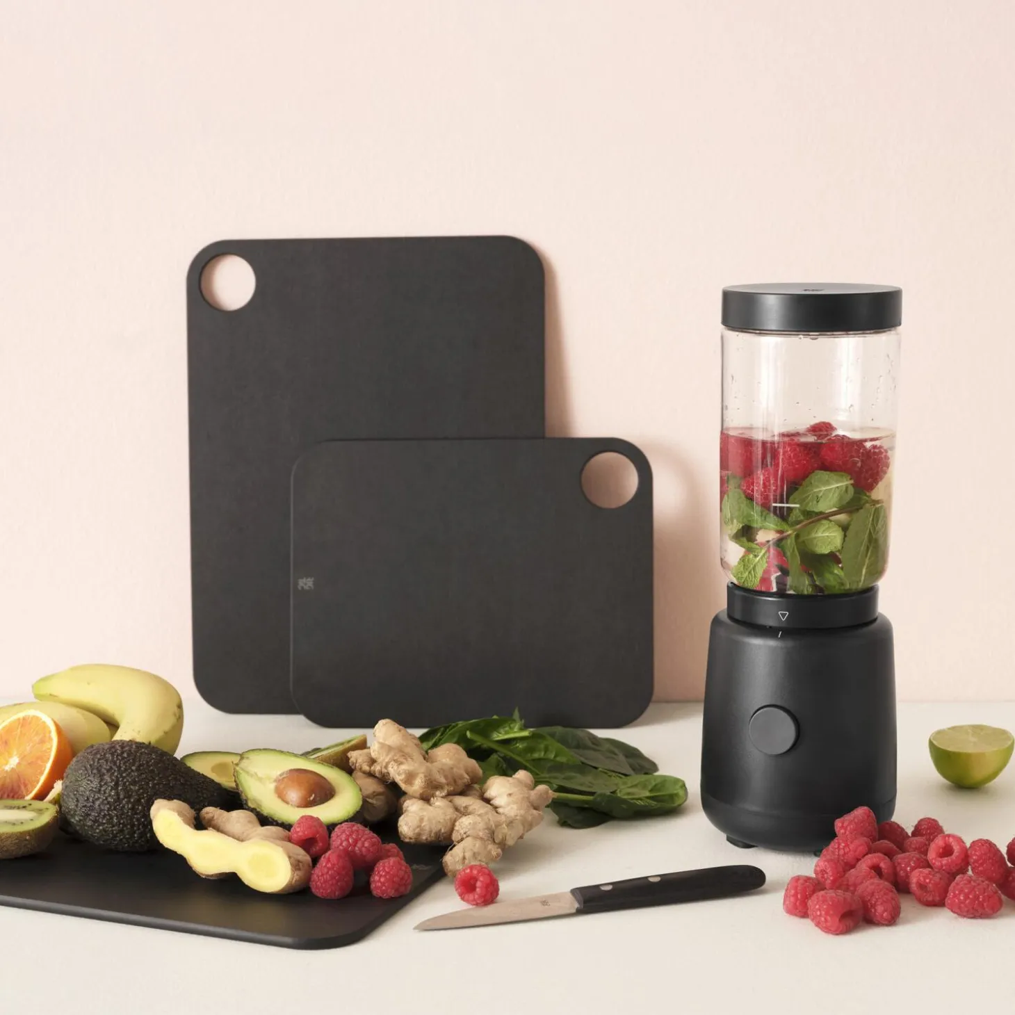 Smukt og funktionelt skærebræt til køkkenet udført i praktisk fibertræ designet af Søren Refsgaard. Fibertræ er et materiale med mange fordele – det er antibakterielt, sløver ikke dine knive, tåler at blive sat i opvaskemaskinen, og så kan det slibes og olieres, hvis det med tiden bliver slidt og gråligt i sit udseende. Ydermere er det varmebestandigt op til 170 °C. CUT-IT skærebrættet kommer i to anvendelige størrelse. De afrundede hjørner tilføjer en blød form til det ellers stramme design, og de karakteristiske huller giver både skærebrættet et markant udtryk, men gør det også let at at hænge brættet på en krog eller lignende. CUT-IT skærebræt er funktionelt design til køkkenet.