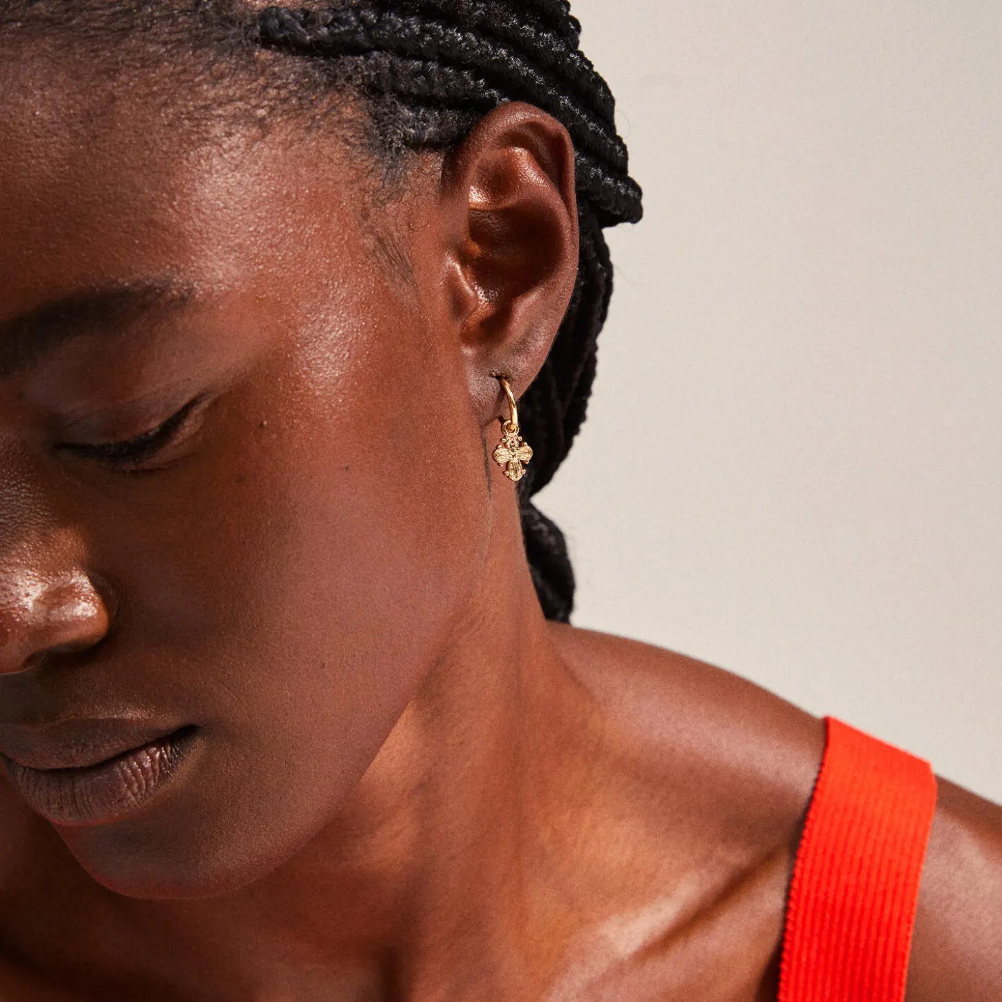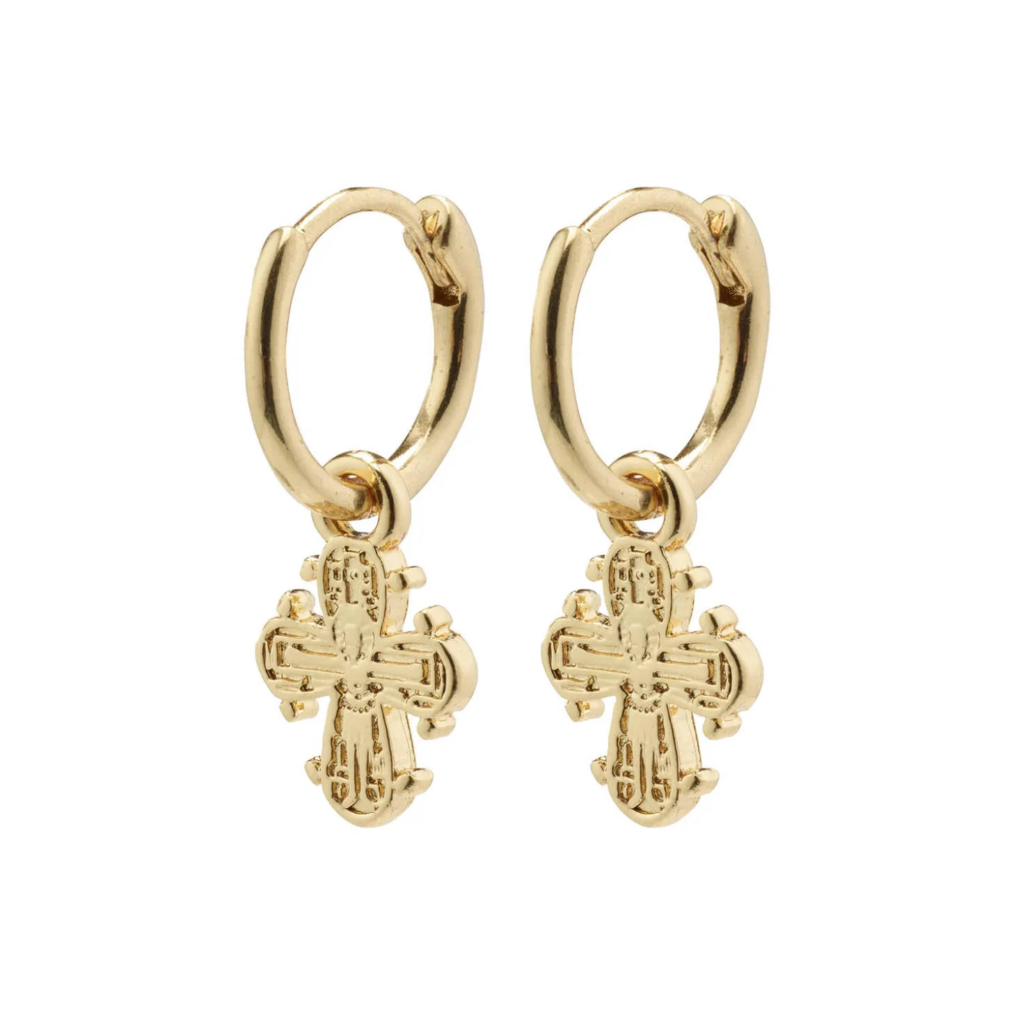 Små guldbelagte huggie hoops med mini-Dagmarkors. Lavet af 99% genanvendt materiale. Pilgrim har nytænkt det klassiske vedhæng og kombineret det med et par små guldbelagte huggie hoops i et opdateret cute look. Kombiner de små Dagmarkors-creoler med flere øreringe op langs øret, eller lad dem shine alene i et klassisk romantisk look. Dagmarkorset regnes for at være et af Danmarks største nationalklenodier, og er det tætteste man kommer på et nationalsmykke. I Danmark er der tradition for at give Dagmarkorset i barnedåbsgave eller konfirmationsgave, – det smukke symbol kan bruges i alle sammenhænge.
