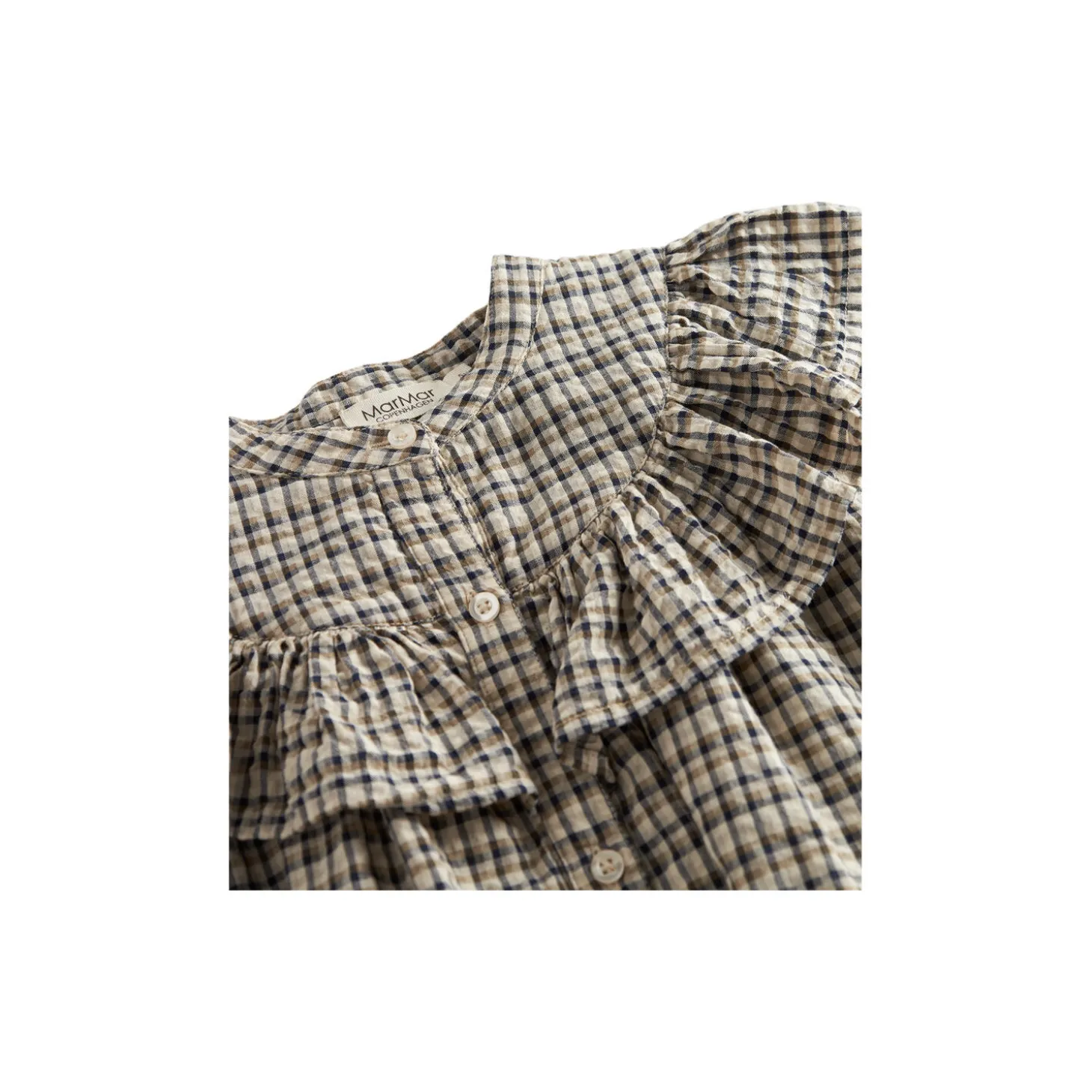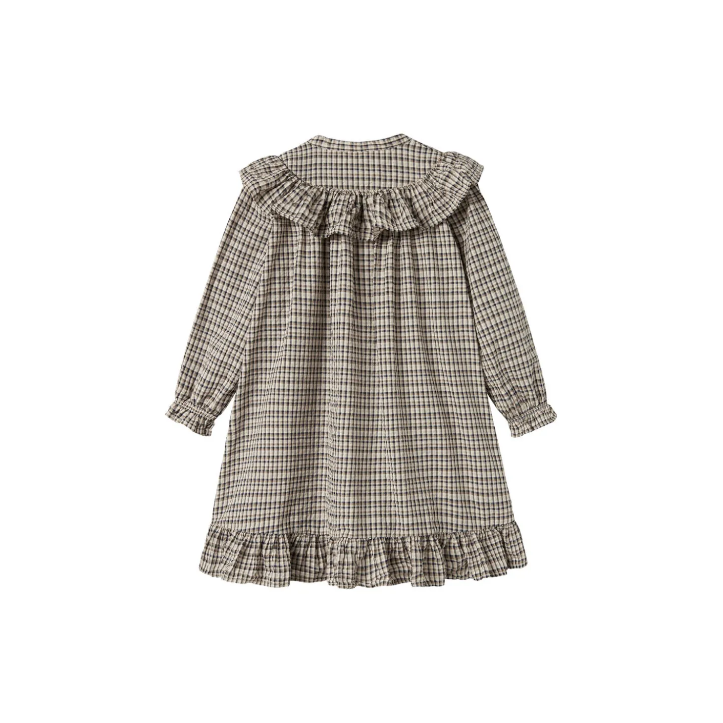 Behagelig langærmet kjole med god pasform, krave der går hele vejen rundt med bølgede kanter og bølgebånd forneden samt på ærmer. Kjolen lukkes med knapper foran og længden går til over knæene.