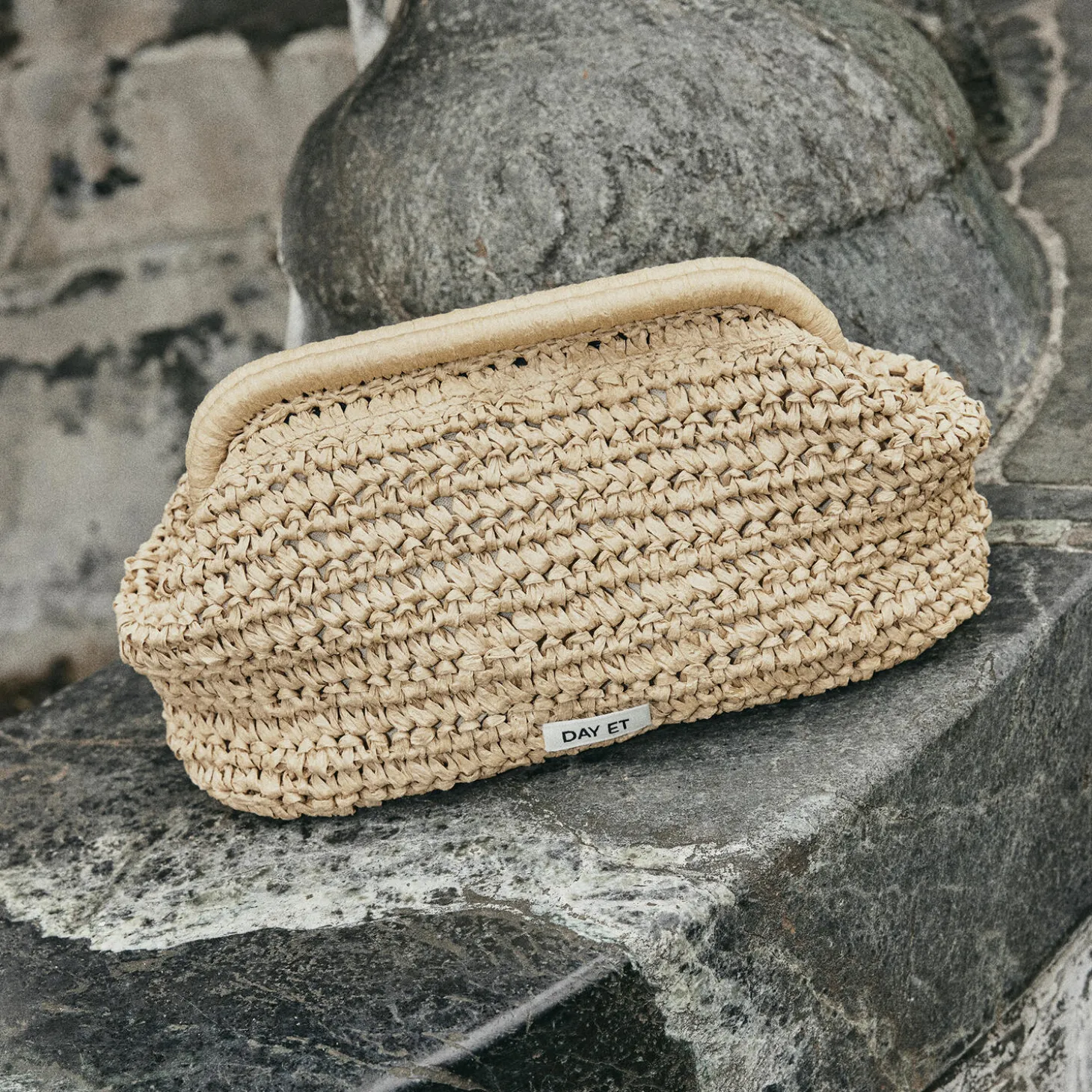 Denne hæklede clutch er lavet af let og luftigt stråmateriale, som giver et elegant og naturligt udseende. Indvendigt er den foret med beige hørstof og har med en åben sidelomme til opbevaring af småting. Den lukkes med en clutch frame, der er let at bruge, og den justerbare strop i snor giver mulighed for at bære tasken som skuldertaske eller crossbody.