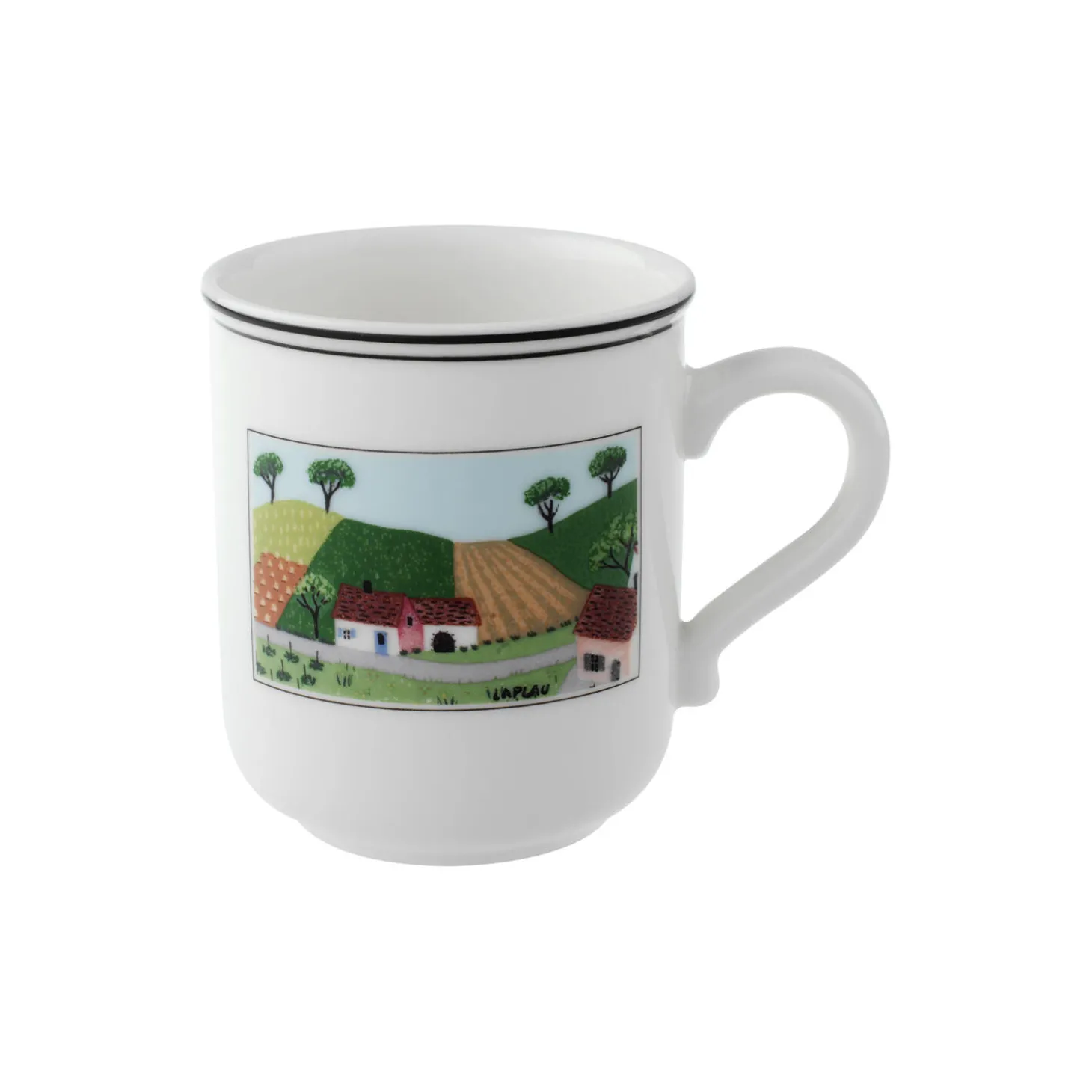 This mug forms part of Villeroy & Boch’s folk art design collection Design Naif and shows one out of six different mug designs. The rustic scenes featured on the individual items of this collection will add a touch of charm and atmosphere to any table. Designed by the Corsican artist Gérard Laplau, the decor has made an important contribution to establishing Design Naif as an art form all over the world. This premium porcelain is ideal for everyday use on the breakfast table or for an afternoon coffee break. Dishwasher safe and microwave safe.