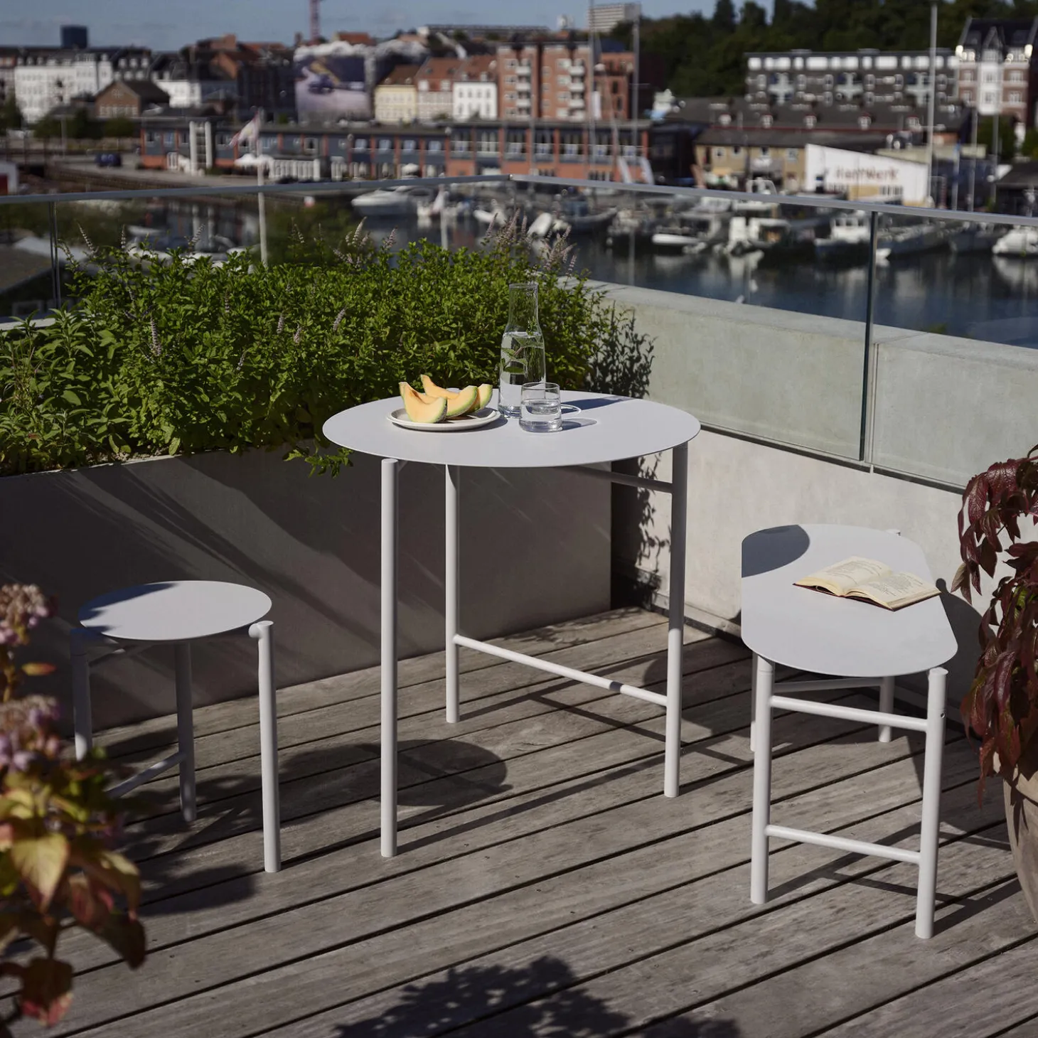 Disc-bænken er med sine 90 cm siddebredde perfekt til to. På trods af sit lette udtryk er den solid i brug. Den er udført i pulverlakeret stål og kan derfor tåle at stå ude. Den passer perfekt på altaner i byen eller små sommerhusterrasser. Præcis som resten af Disc-serien kan bænken foldes sammen, så den er let at flytte med eller pakke væk for vinteren. En anden mulighed er at invitere den ind i entreen eller stuen og bruge den til små stillebens og planter.