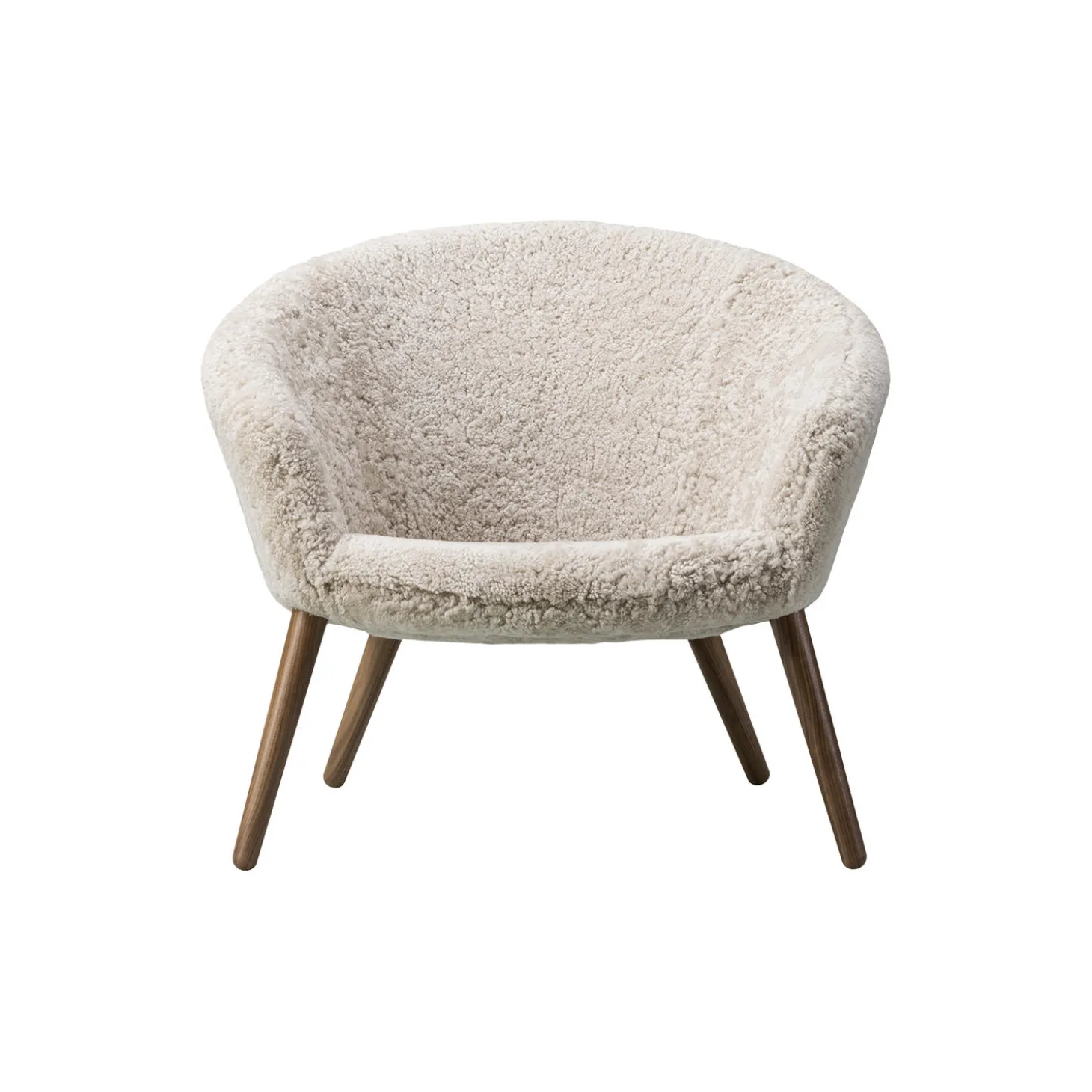 Ditzel loungestol med polstring i bouclé sheepskin og stel i lakeret valnød fra Fredericia. Farve: hvid/lakeret valnød. Mål: H: 72 x B: 81 x D: 73 cm. Siddehøjde: 37 cm. Design: Nanna Ditzel.