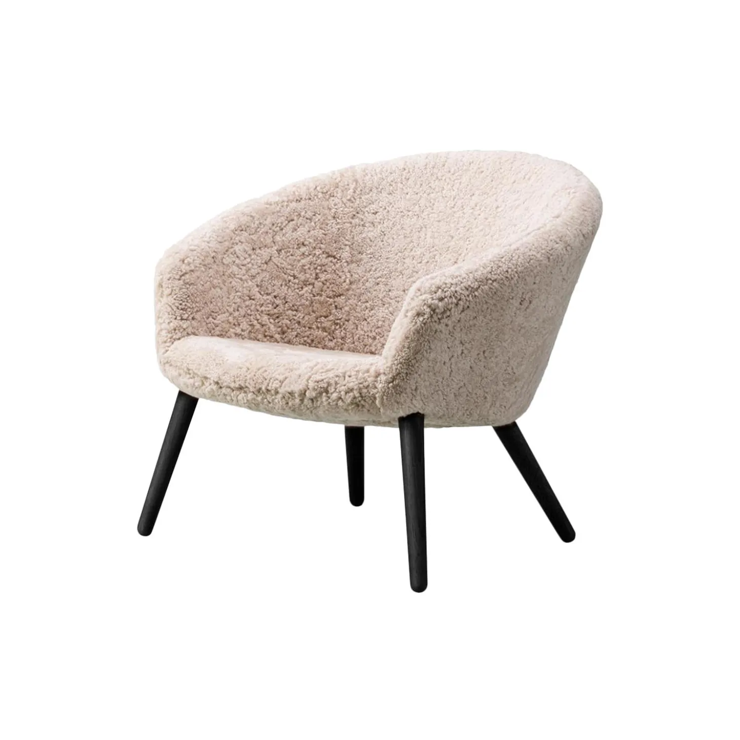 Ditzel loungestol med polstring i bouclé sheepskin og stel i sortlakeret eg fra Fredericia. Farve: hvid/sortlakeret eg. Mål: H: 72 x B: 81 x D: 73 cm. Siddehøjde: 37 cm. Design: Nanna Ditzel.