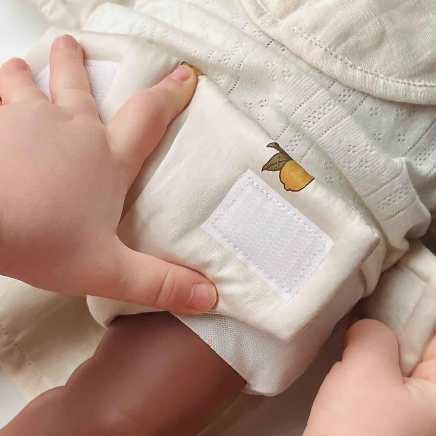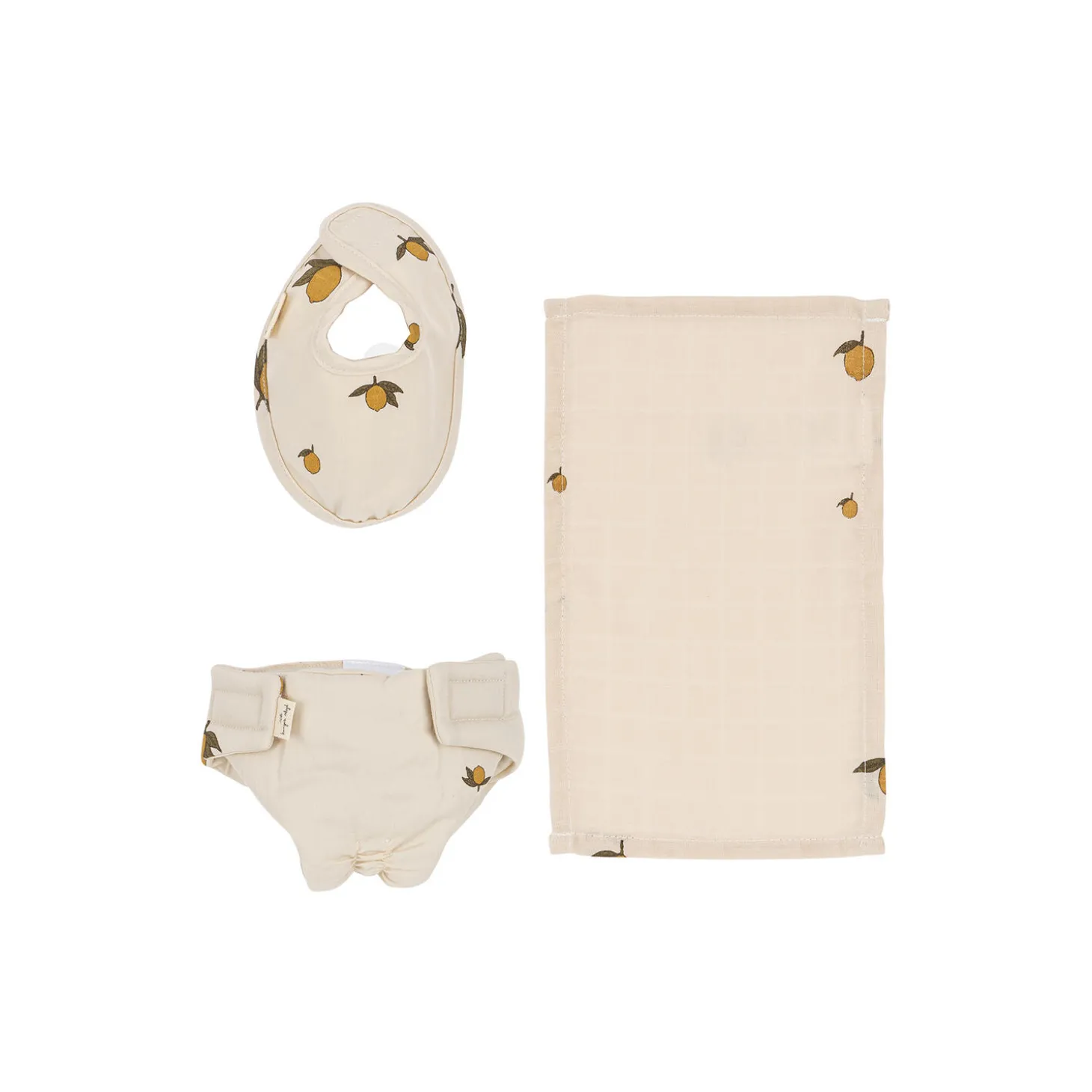 Bib, diaper with velcro closure and muslin cloth for the doll made in 100 percent organic cotton.