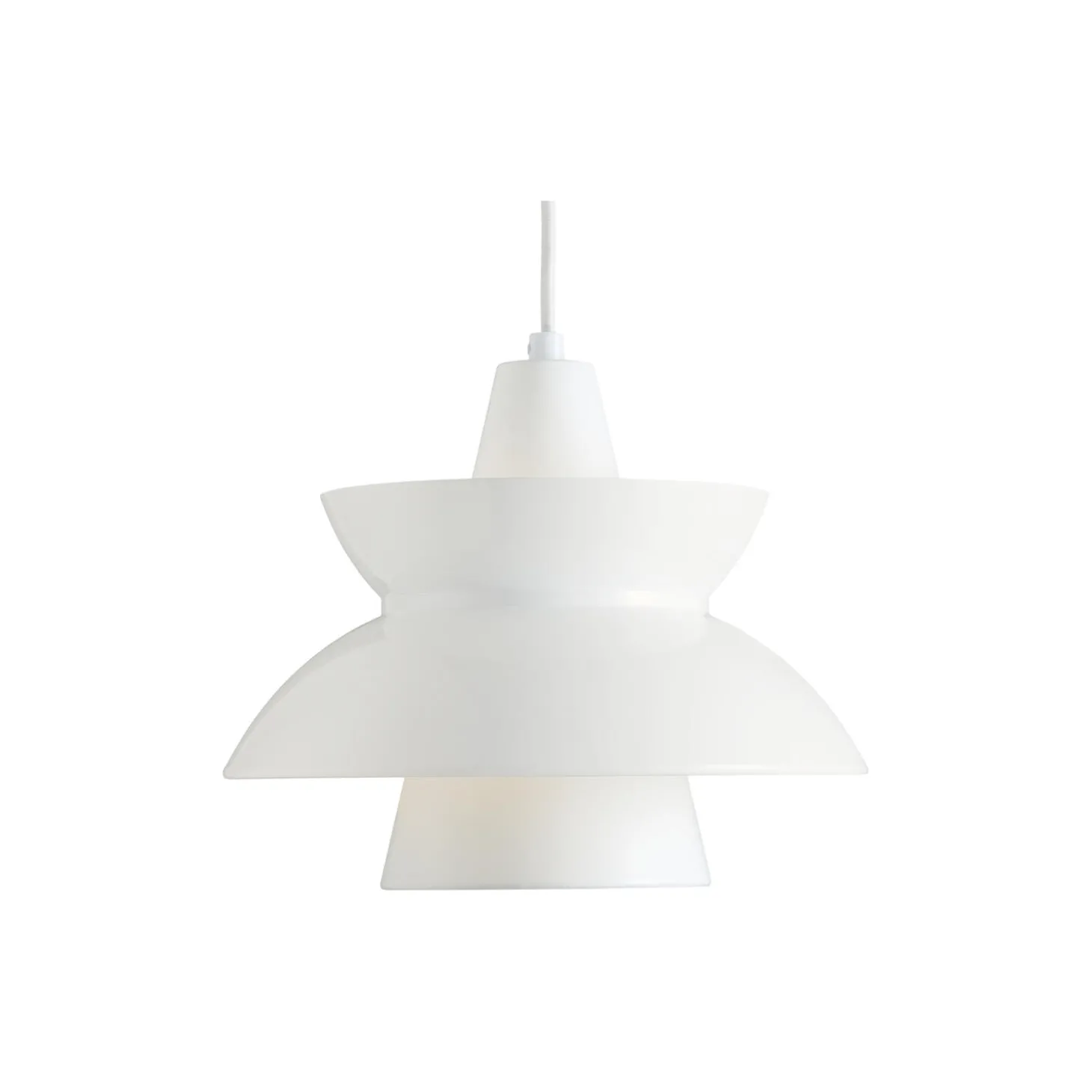Doo-Wop pendel i pulverlakeret optrukket aluminium med ophæng i optrykt aluminium fra Louis Poulsen. Farve: hvid. Mål: H: 24,5 x Ø 28,3 cm. Lyskilde: 60W E27. Design: Louis Poulsen A/S.
