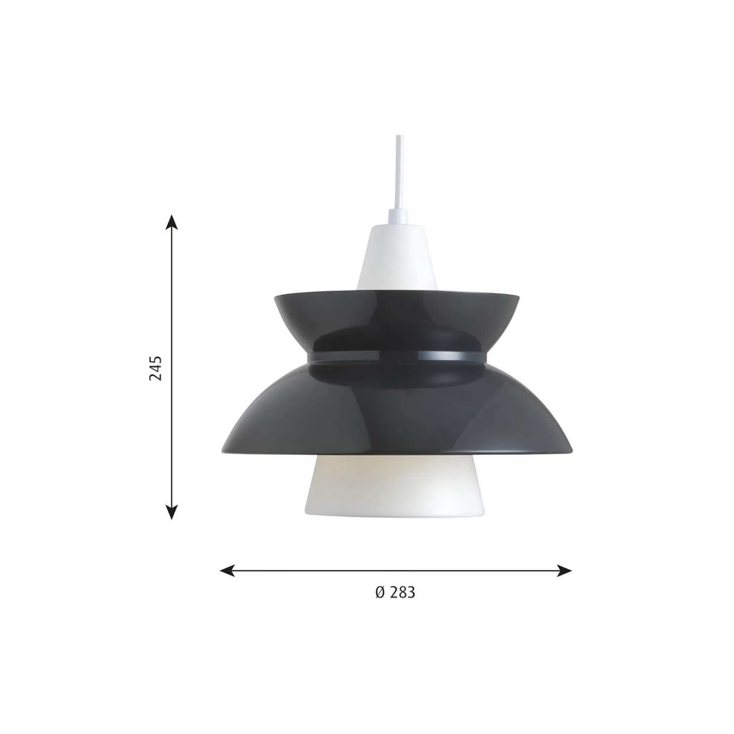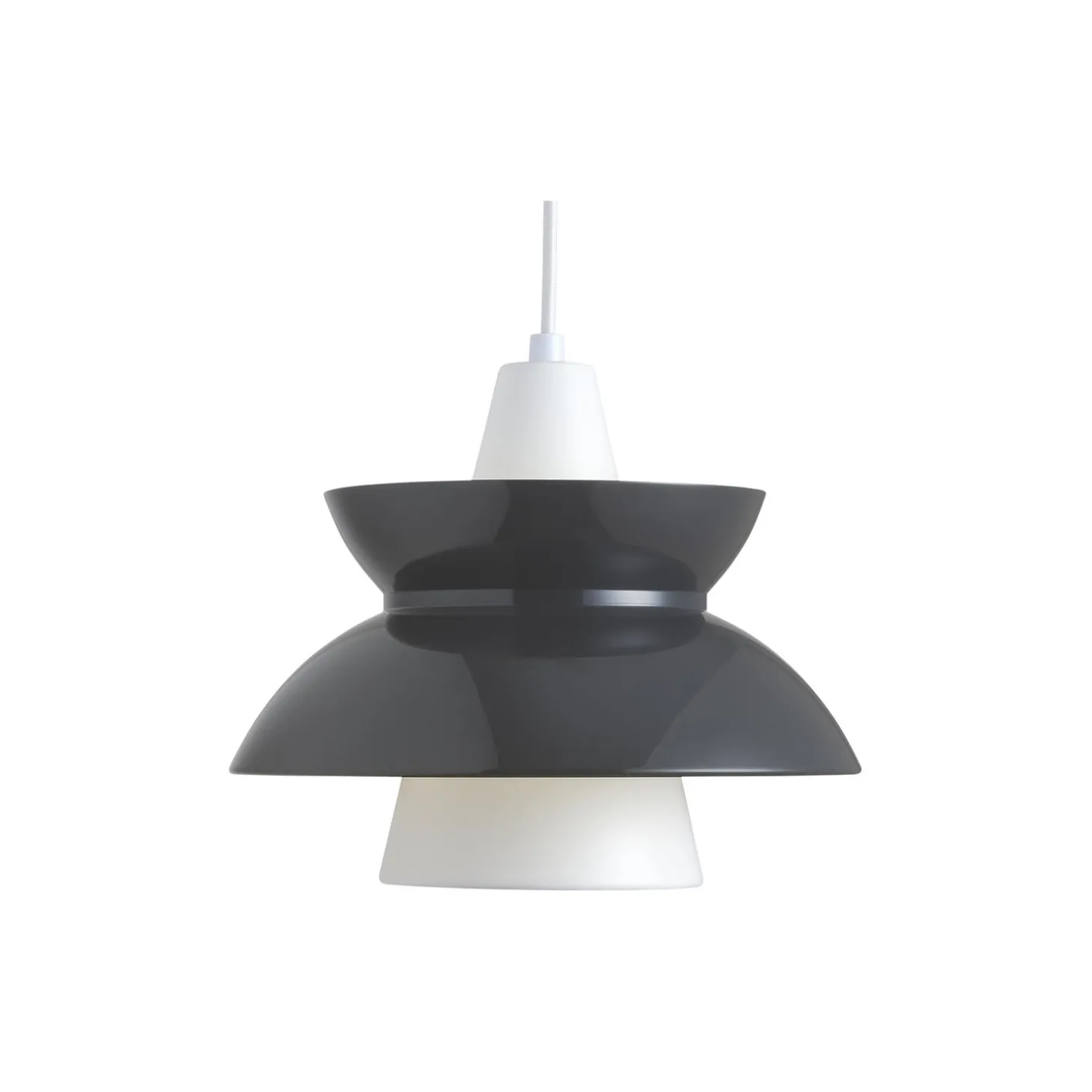 Doo-Wop pendel i pulverlakeret optrukket aluminium med ophæng i optrykt aluminium fra Louis Poulsen. Farve: mørkegrå. Mål: H: 24,5 x Ø 28,3 cm. Lyskilde: 60W E27. Design: Louis Poulsen A/S.