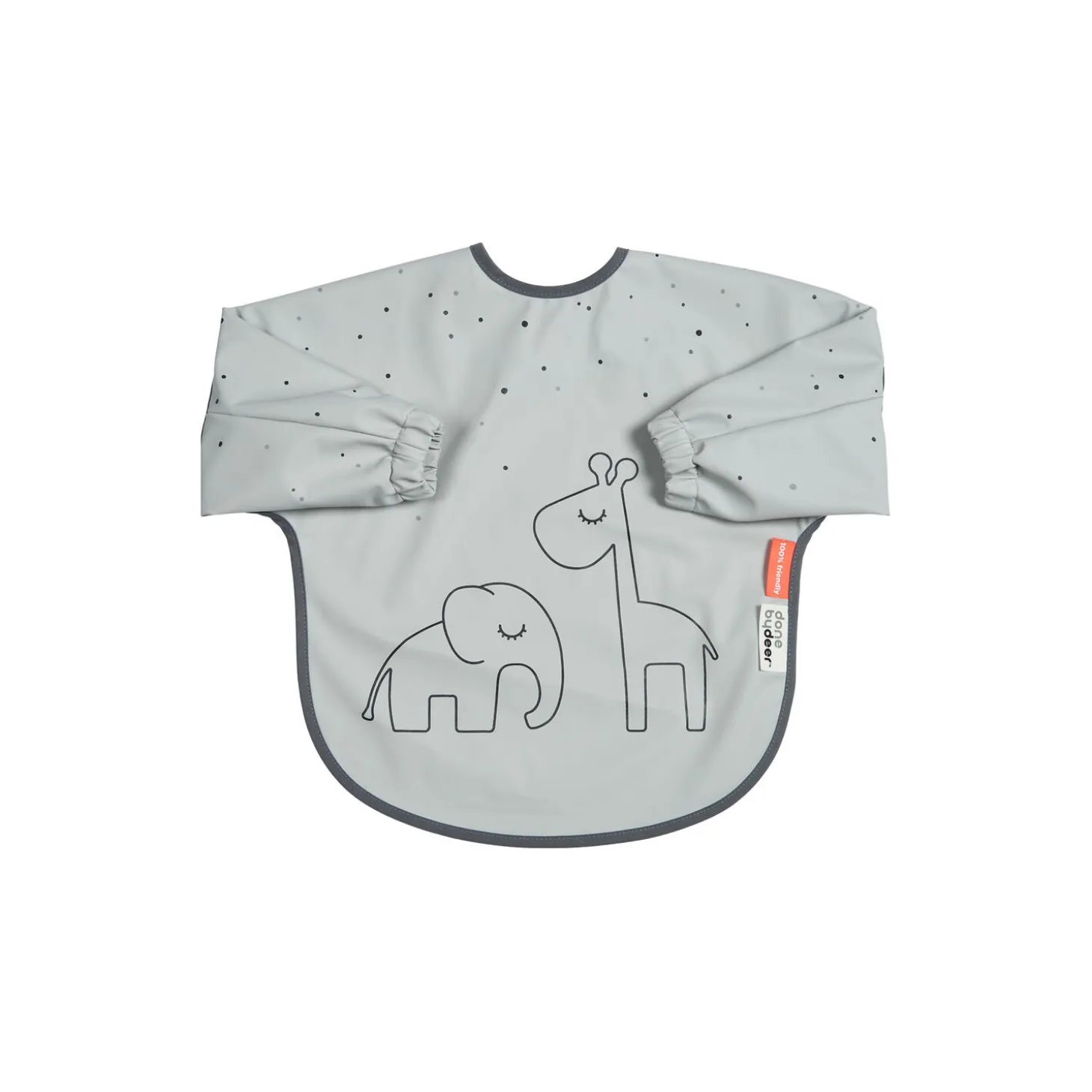 Dreamy Dots hagesmæk med ærmer i 100% polyurethan og polyester fra Done by Deer. OEKO-TEX®-certificeret. Farve: grå. Mål: 35×72 cm. Alder: 6-18 måneder.
