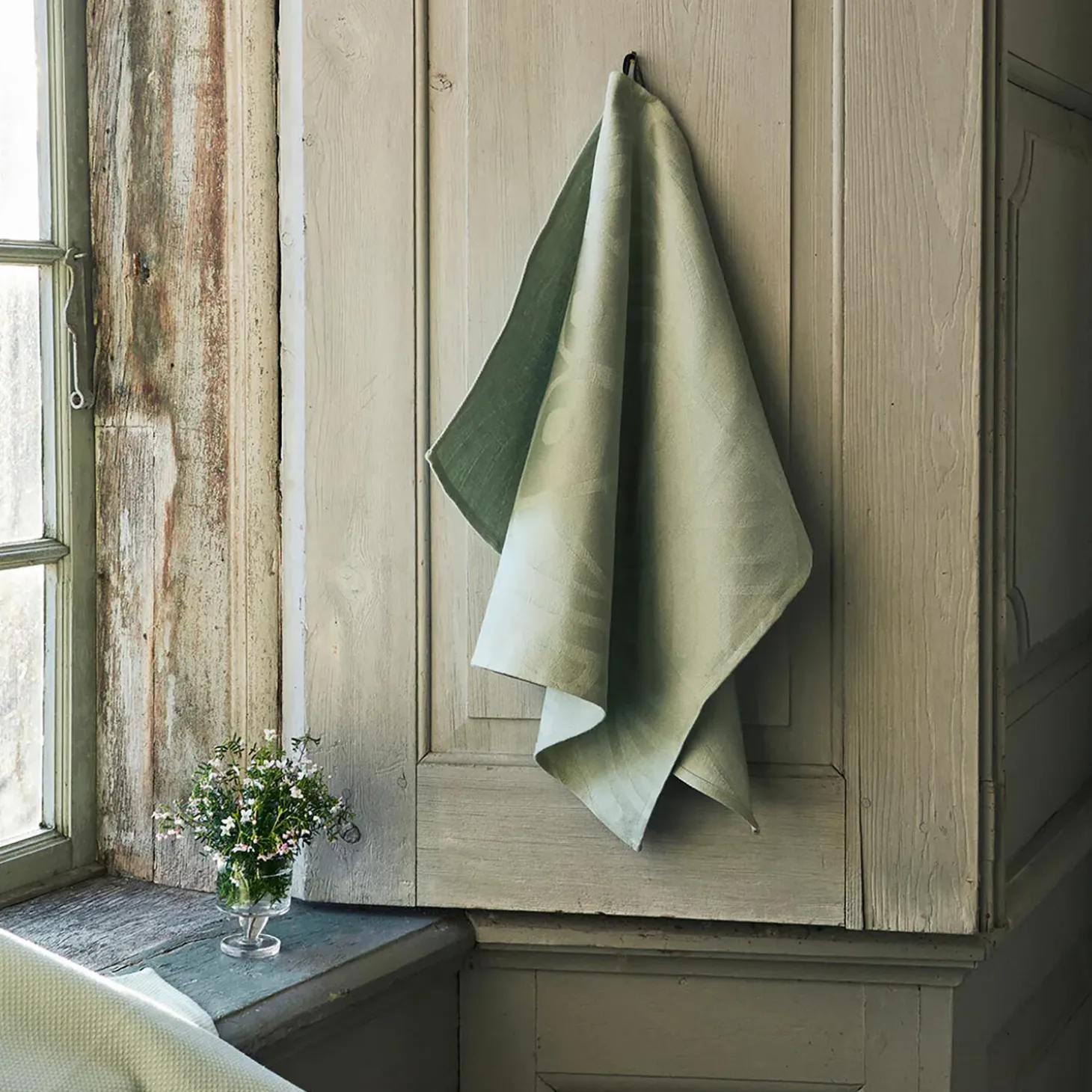 Påskeviskestykket er en del af vores kollektion af klassiske påsketekstiler. Viskestykket er lavet af hør og bomuld og har perfekte tørreegenskaber. I farven Light Green skaber viskestykket en hyggelig påskestemning i køkkenet. Den lysegrønne farve er en ægte forårsbebuder, der bringer årstidens spirende følelser indendørs. Det enkle og tidløse påskemotiv med stiliserede høns og æg er designet af Bodil Bødtker-Næss, som var en del af inderkredsen af tekstilkunstnere omkring Georg Jensen Damask i 1970’erne, og som også er ansvarlig for det klassiske julehjertemotiv, som er et signaturmotiv i kollektionen.