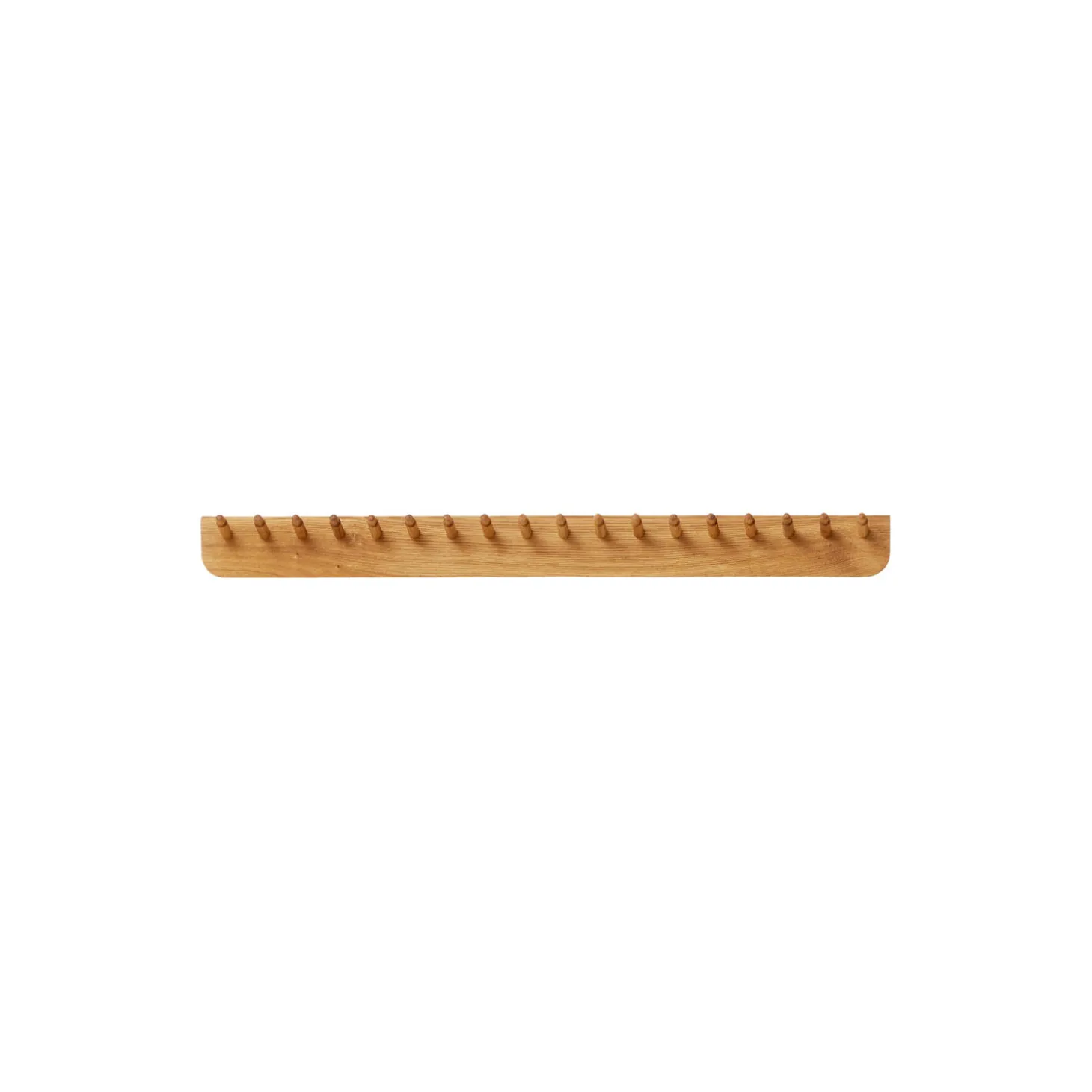 En fleksibel og alsidig knagerække i et enkelt, funktionelt design, hvor du kan hænge din jakke, din hat eller dit halstørklæde i entreen. Den smukke ramme og knagernes formation skaber et struktureret design baseret på rytmisk repetition. Knagerne kombinerer fine detaljer og kurver med en solid forankring. Det stærke og solide bagstykke giver knagerækken lang levetid og gør, at den kan klare store belastninger. Knagerækken har plads til op til 18 jakker, men kan sagtens klare det dobbelte, hvis du hænger to ting på hver knage. Fremstillet af certificeret lokalt europæisk massivt træ.