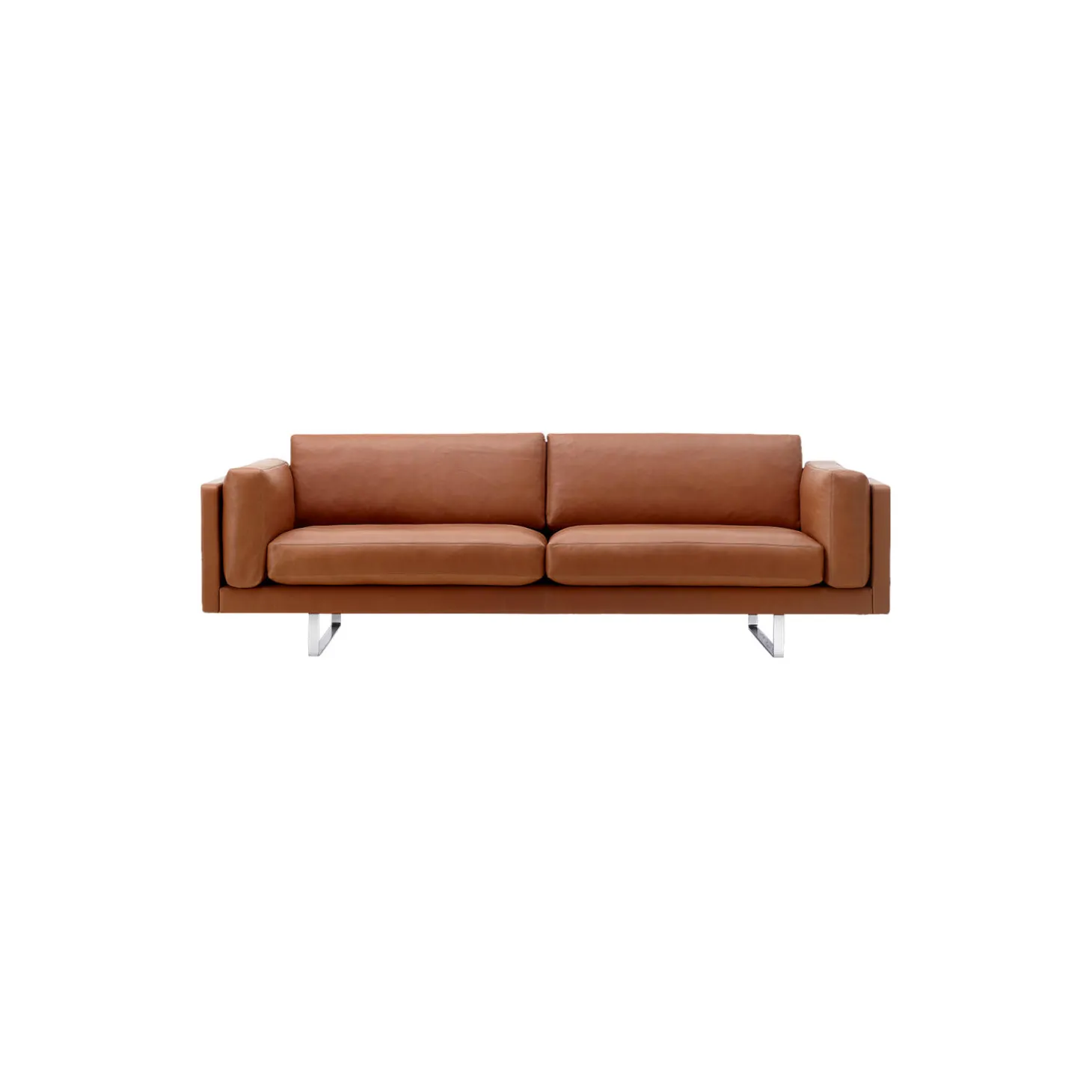 EJ280 2-pers. sofa med polstring i Primo 75 Cognac semianilinlæder og stel i børstet krom fra Fredericia. Farve: cognac. Mål: H: 73 x L: 212 x D: 90 cm. Siddehøjde: 42 cm. Design: Erik Jørgensen Studio.