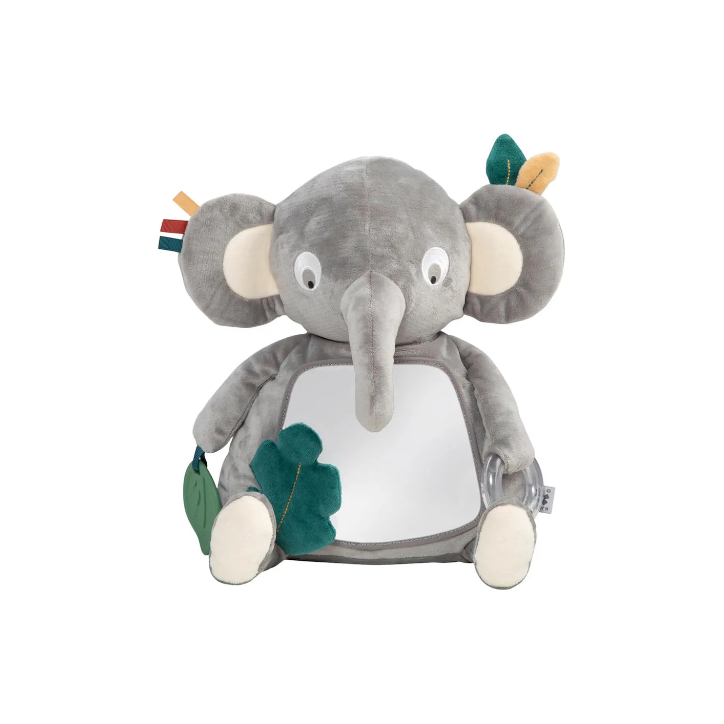 Sød og sjov elefantbamse til baby. Det store babysikre spejl på Finley the elephant’s mave giver baby mulighed for at udforske sine egne ansigtsudtryk og små fingre kan gå på opdagelse i knitre-blade og nulre-tags på elefantbamsen.