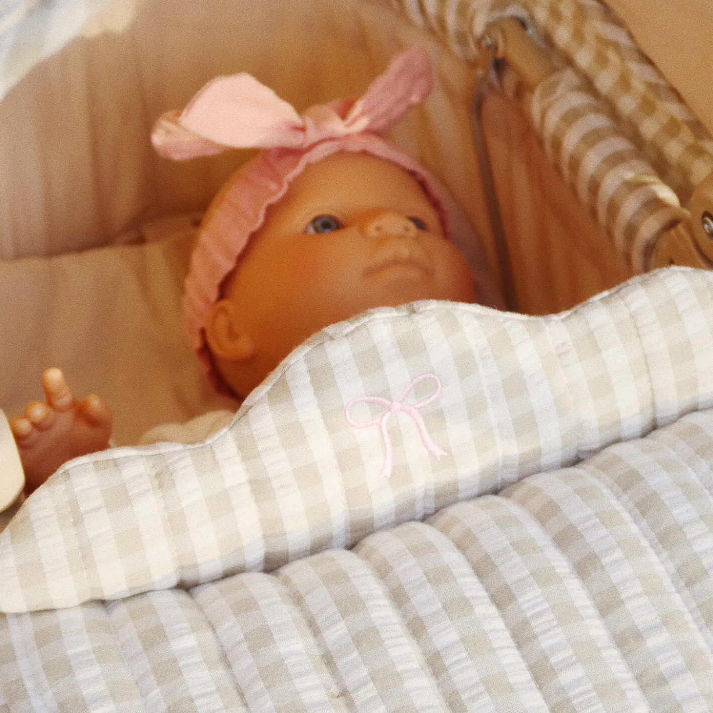 - Materiale: doll in vinyl, body shell in organic cotton with filling in recycled polyester, pacifier in PP and cotton