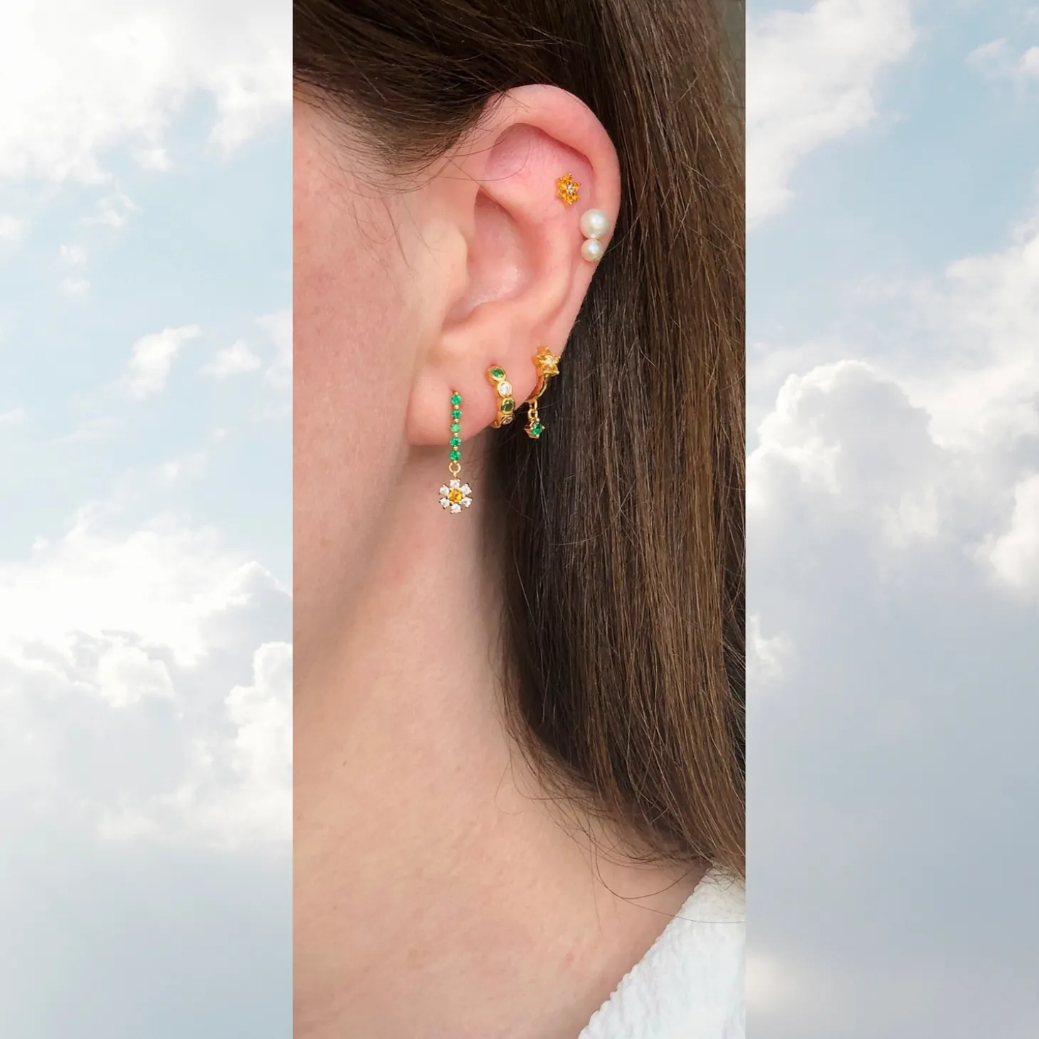 Lille huggie ørering med klare og smaragdfarvede sten. Sælges enkeltvis.