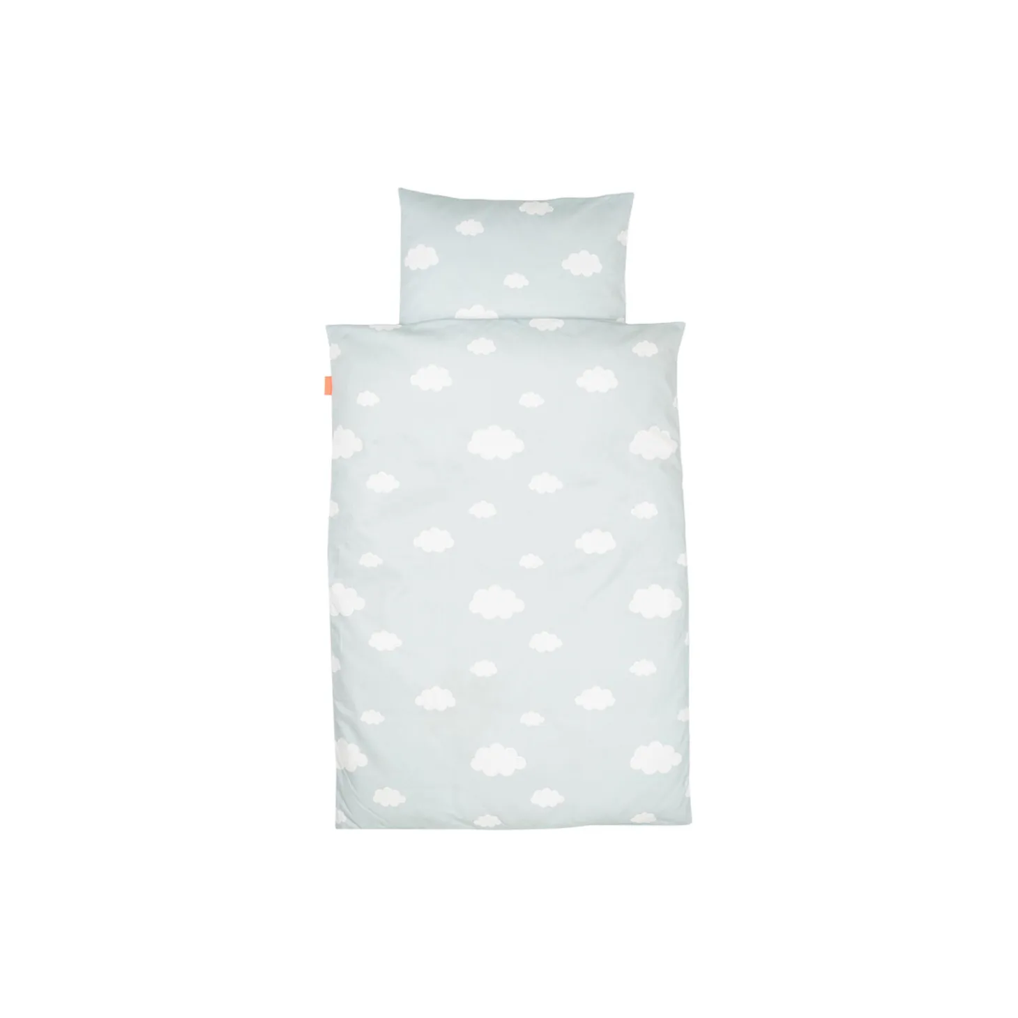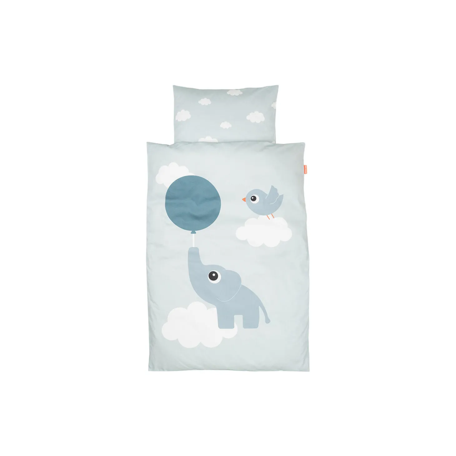 • Fin blåt juniorsengesæt dekoreret med Elphee, Birdee, skyer og en ballon • Pakket i en lille stofpose, der matcher sengetøjet, og som kan bruges til legetøj, et sæt skiftetøj, sko eller andre praktiske formål • Praktisk YKK-sikkerhedslynlås i både pude- og dynebetræk