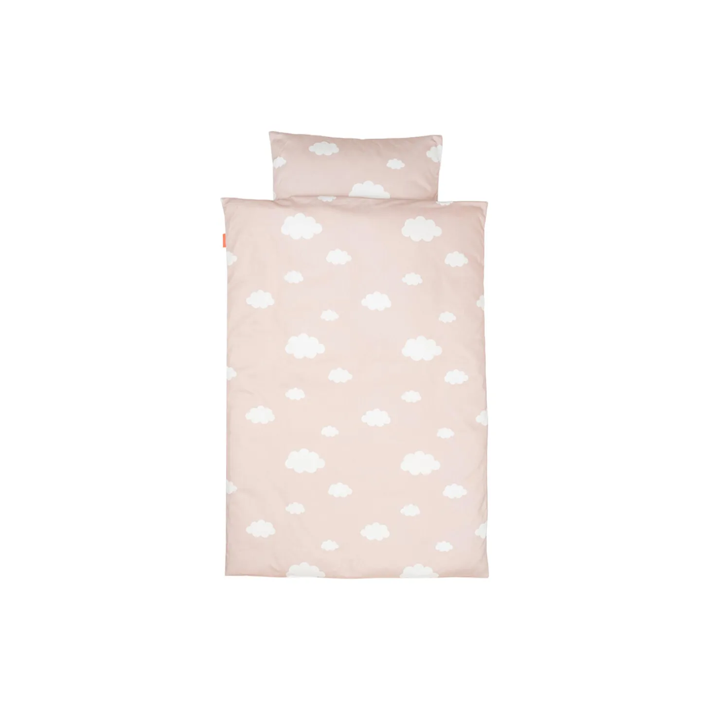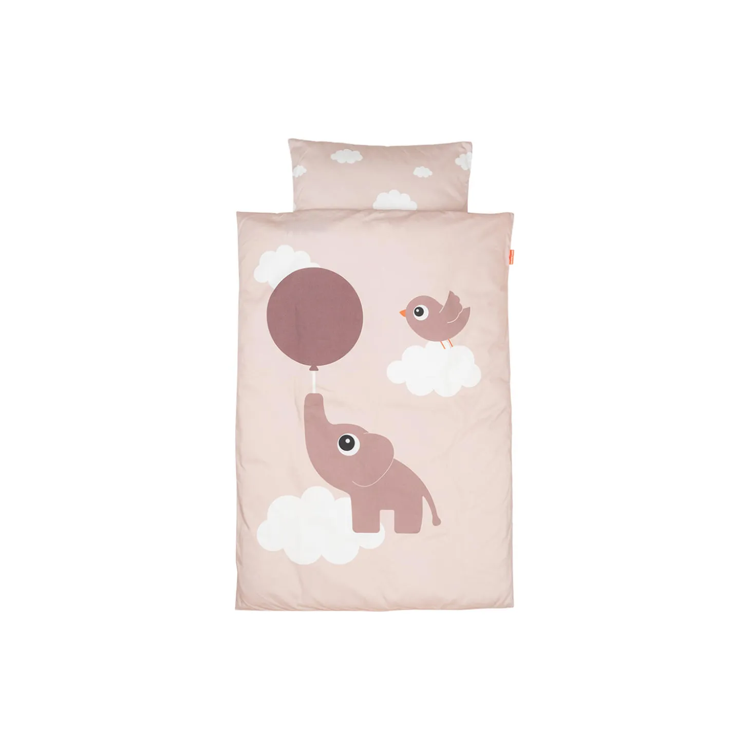 • Sødt pudderfarvet juniorsengesæt dekoreret med Elphee, Birdee, skyer og en ballon • Pakket i en lille stofpose, der matcher sengetøjet, og som kan bruges til legetøj, et sæt skiftetøj, sko eller andre praktiske formål • Praktisk YKK-sikkerhedslynlås i både pude- og dynebetræk