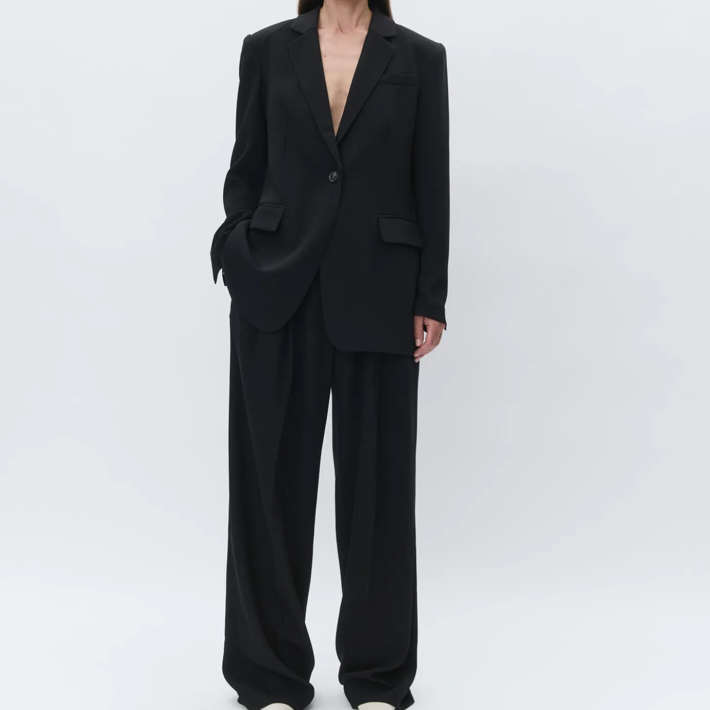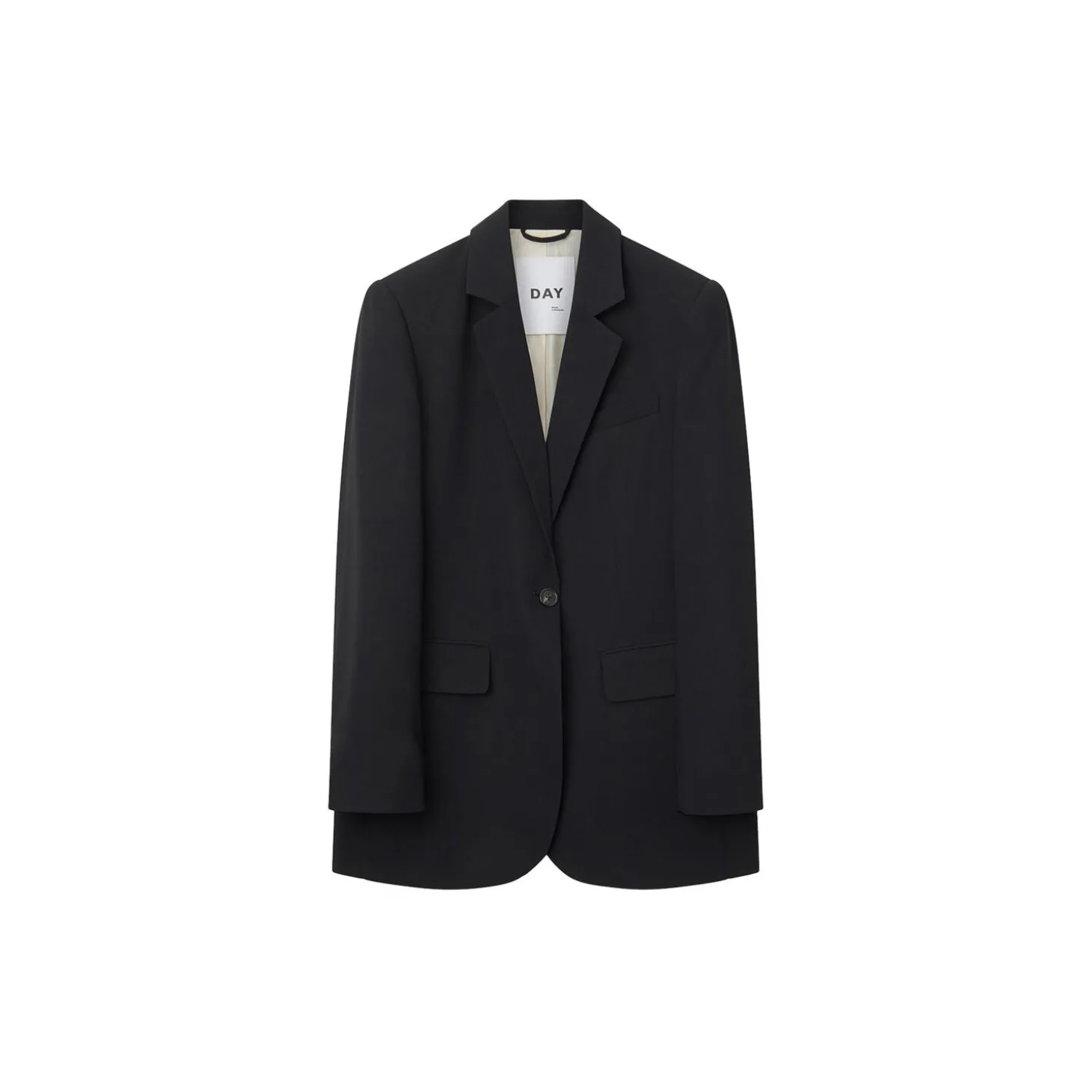A blazer with a single button closure, two pockets in the front, and an interior pocket. It is lined and has shoulder pads. This styles has a regular fit, but is large in size. If you are in doubt we recommend you to go down in size.