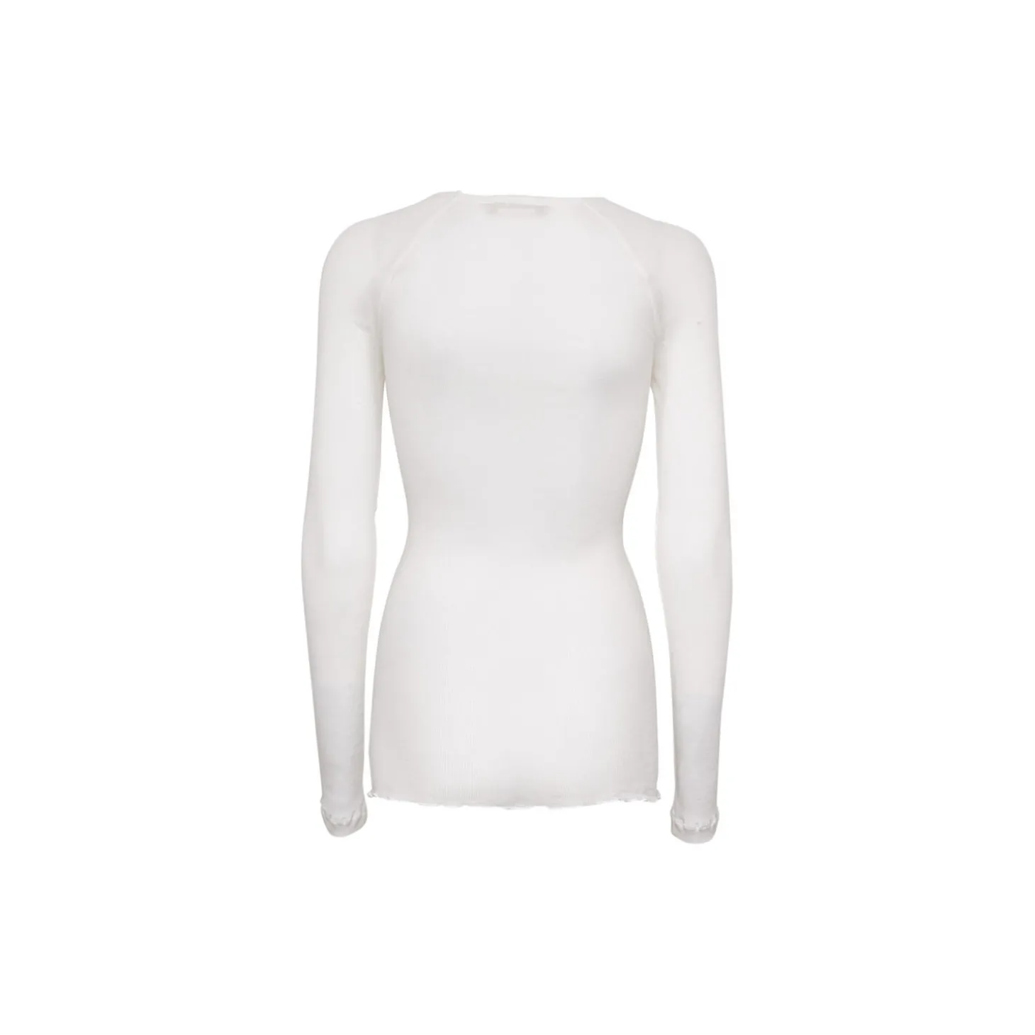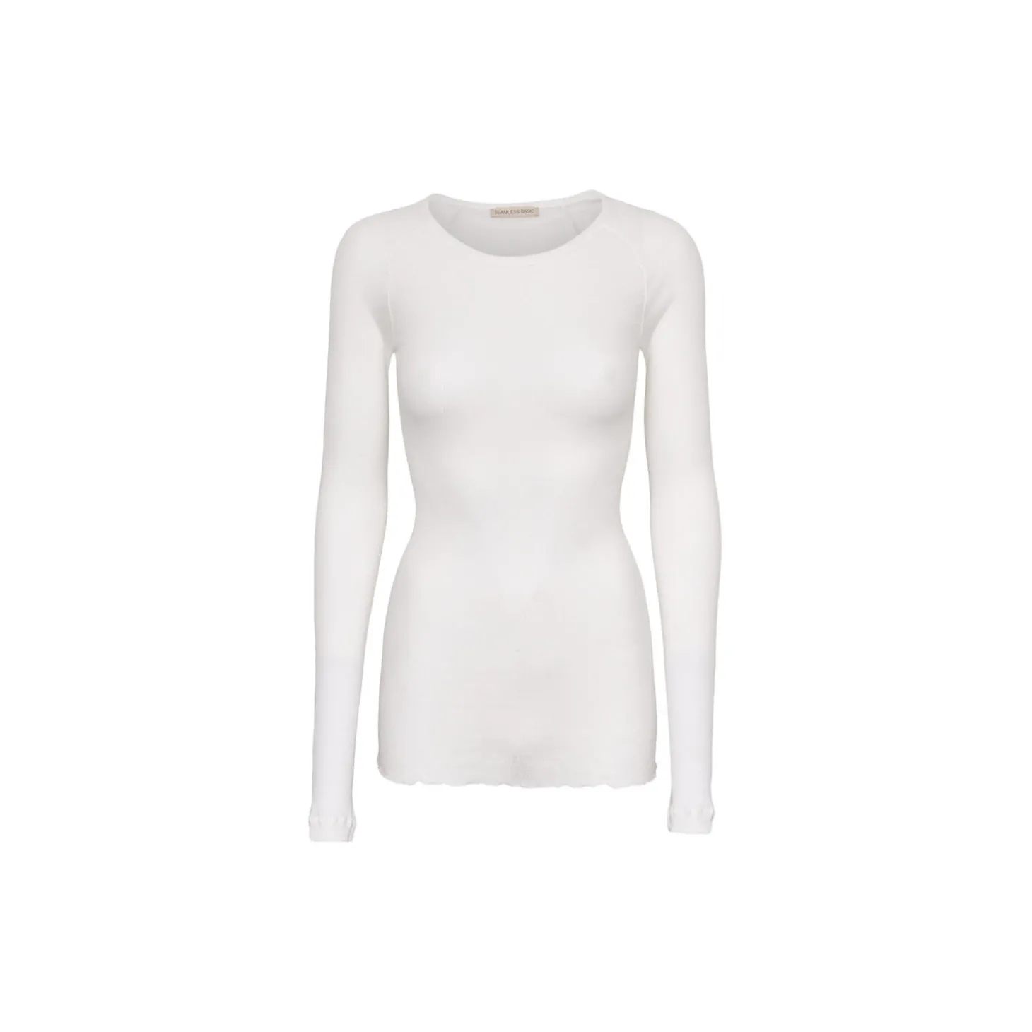 Bluse med semi dyb rund halsudskæring og raglan ærmer. Halsudskæringen er med ribkant. Blusen har overlockede kanter i bunden. Produceret i let og blød bomuld.