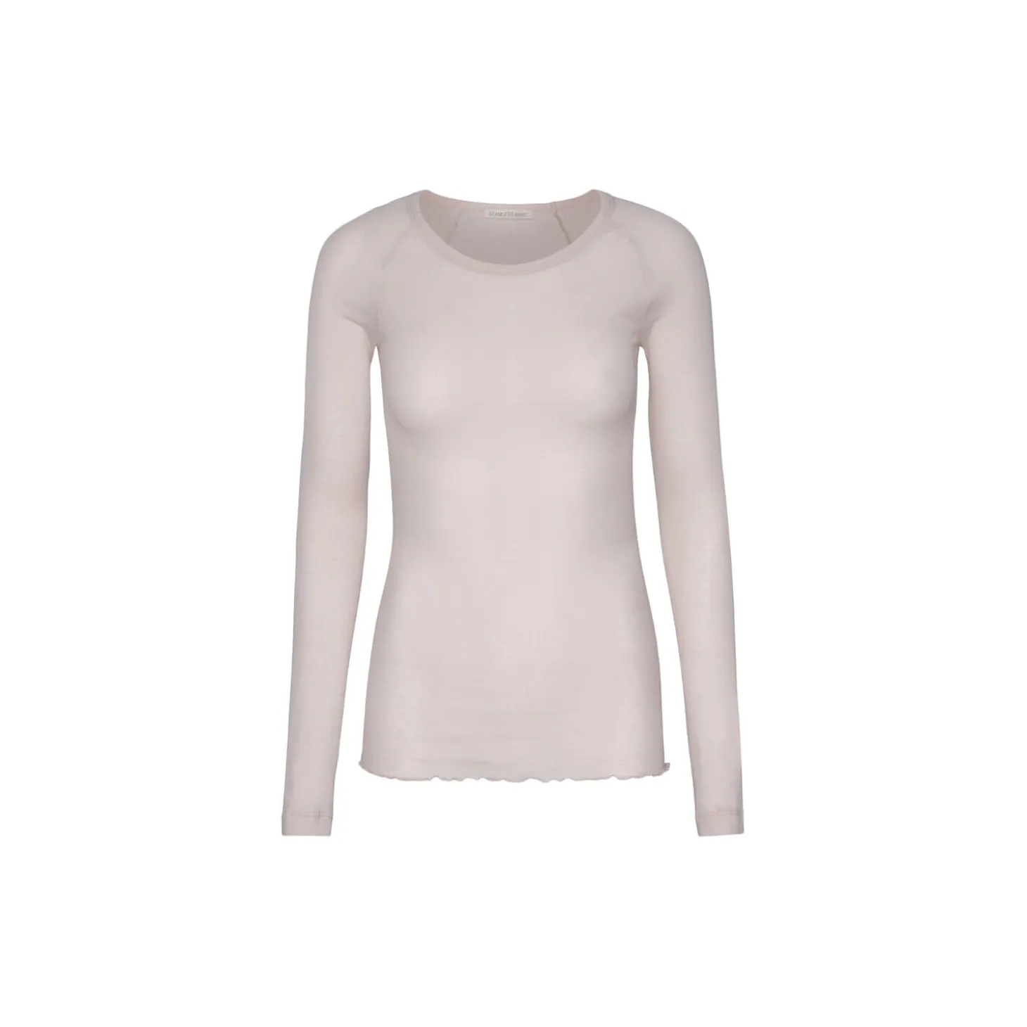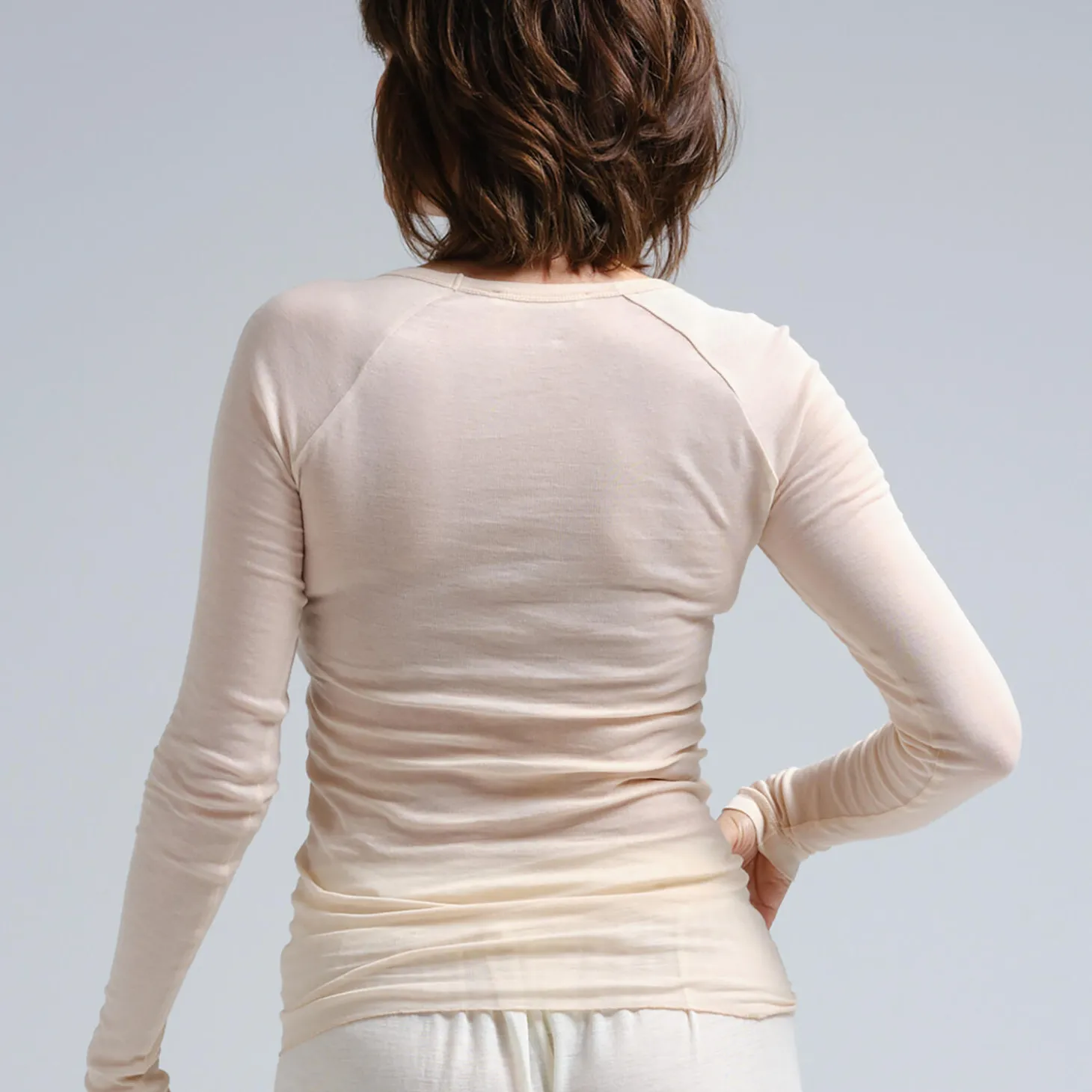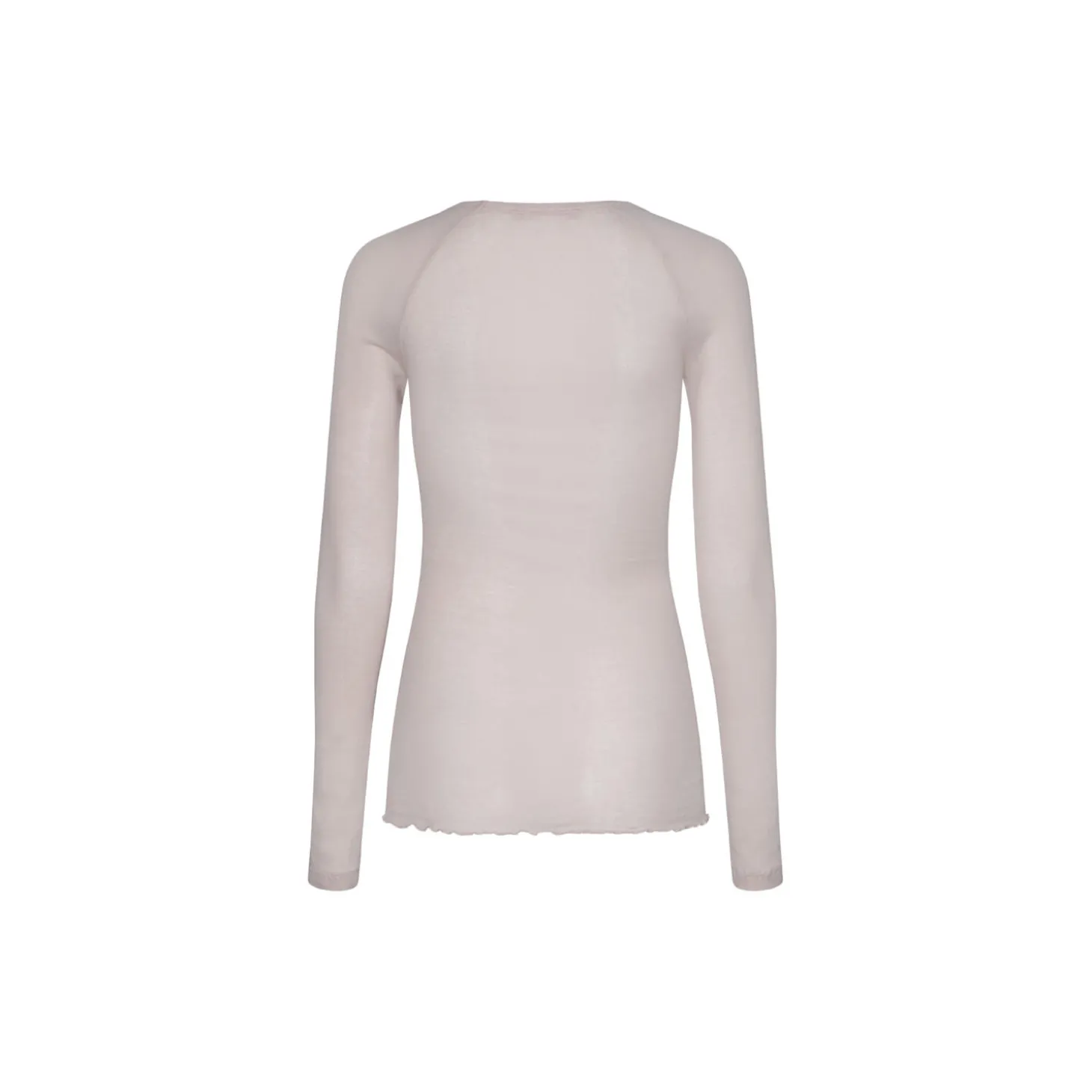 Bluse med semi dyb rund halsudskæring og raglan ærmer. Halsudskæringen er med ribkant. Blusen har overlockede kanter i bunden. Produceret i let og blød bomuld.