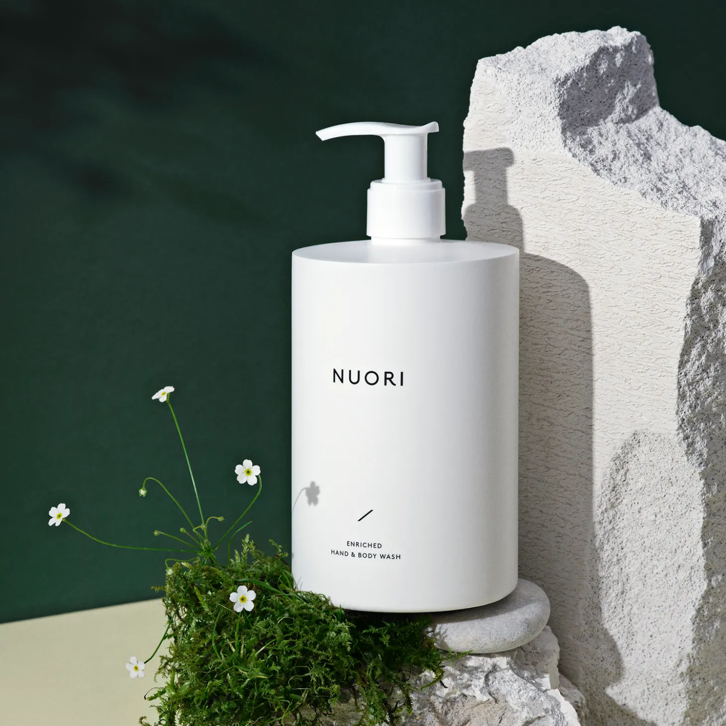 NUORI’s forfriskende Enriched Hand & Body Wash er formuleret med milde, plantebaserede ingredienser. Renser nænsomt men effektivt huden uden at udtørre – 100% naturlig, sulfatfri formel. Nærer og beskytter huden – med vindruekerneolie og naturlig glycerin. Giver antioxidantbeskyttelse – ekstrakt fra hvid te og E-vitamin neutraliserer skadelige frie radikaler. Vegansk – indeholder ikke animalske biprodukter eller ingredienser.