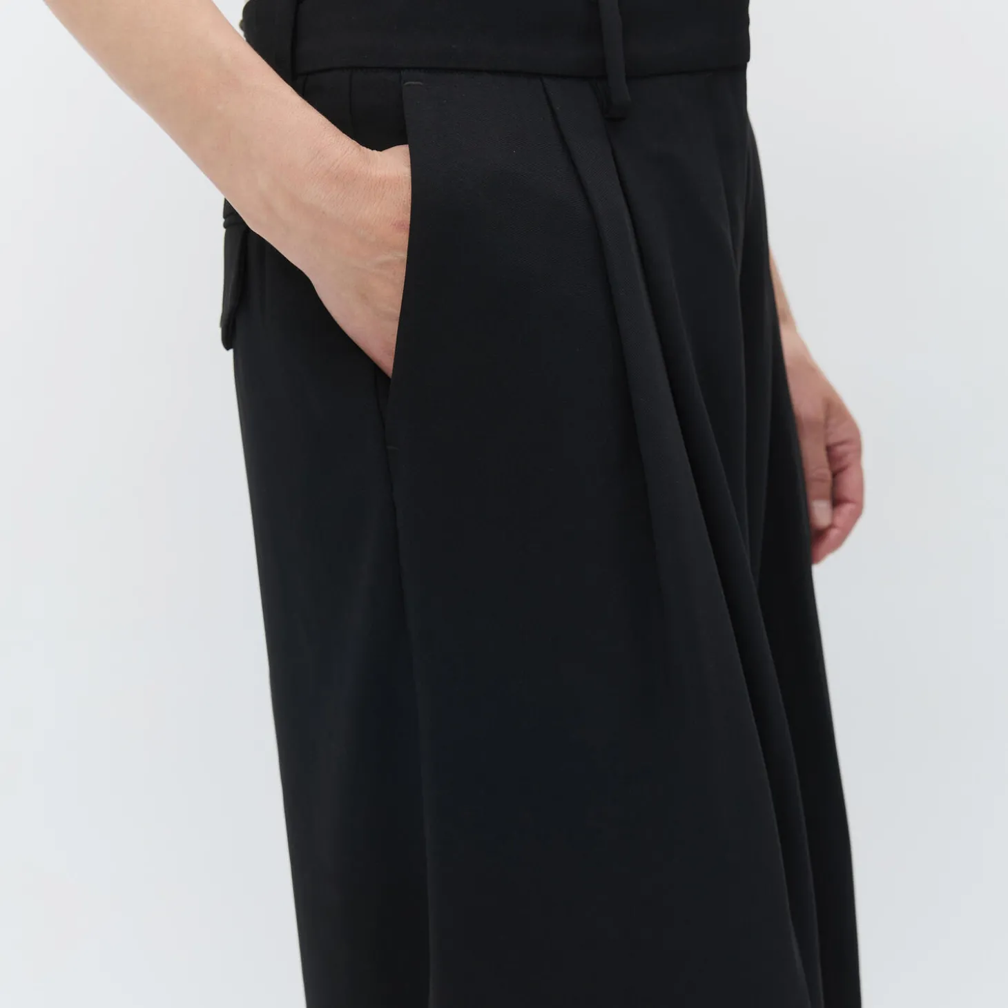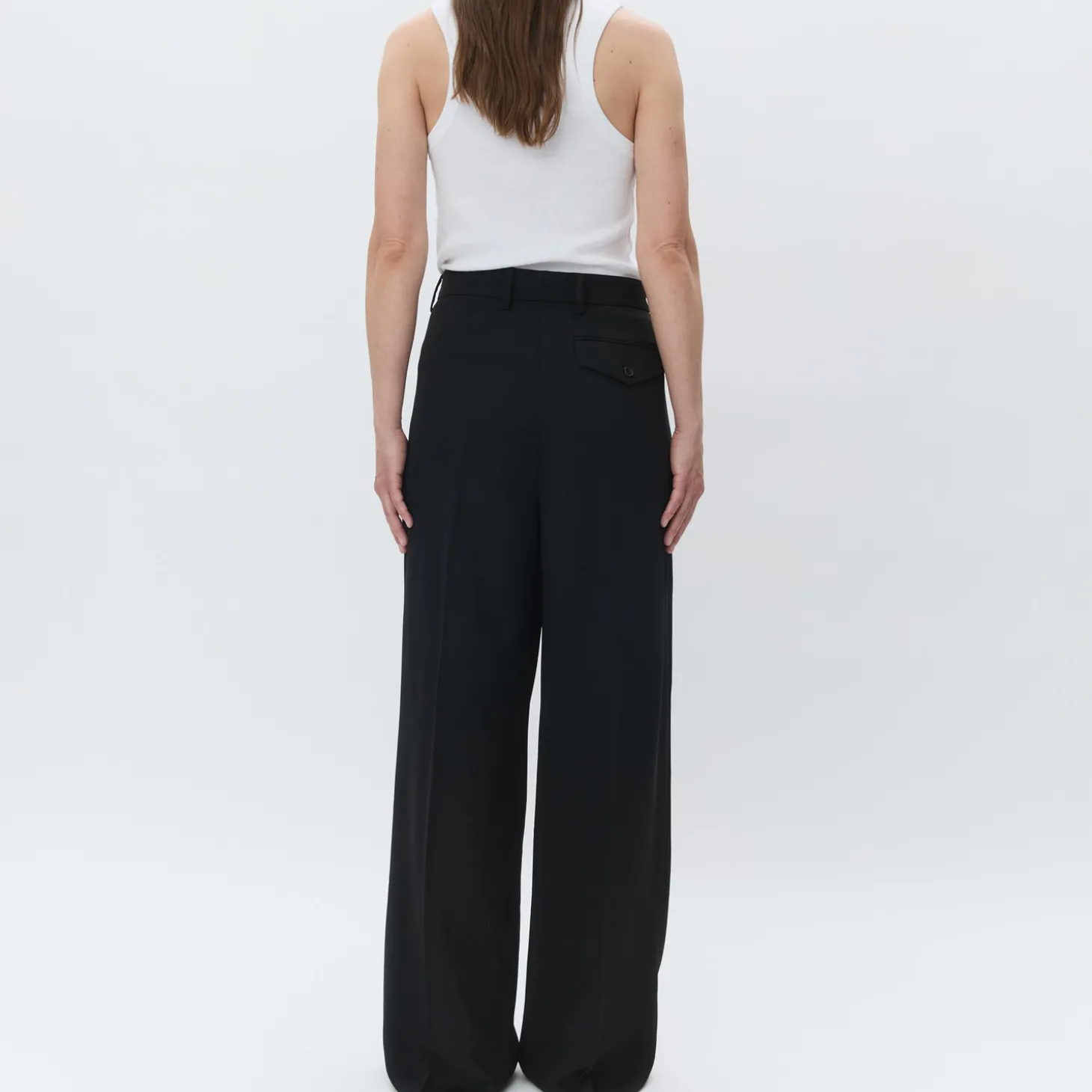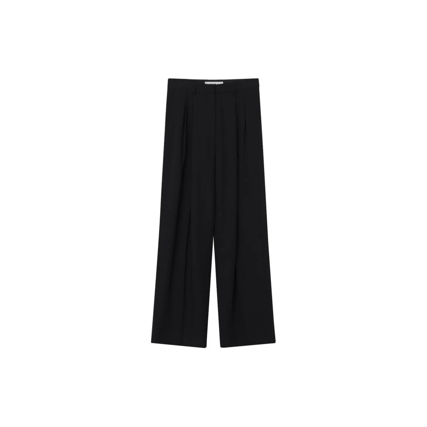These high-rise, wide-leg trousers have pleats at the waist, zip fly with hook closure, and side pockets. There is a single patch pocket in the back. These trousers have a regular fit.