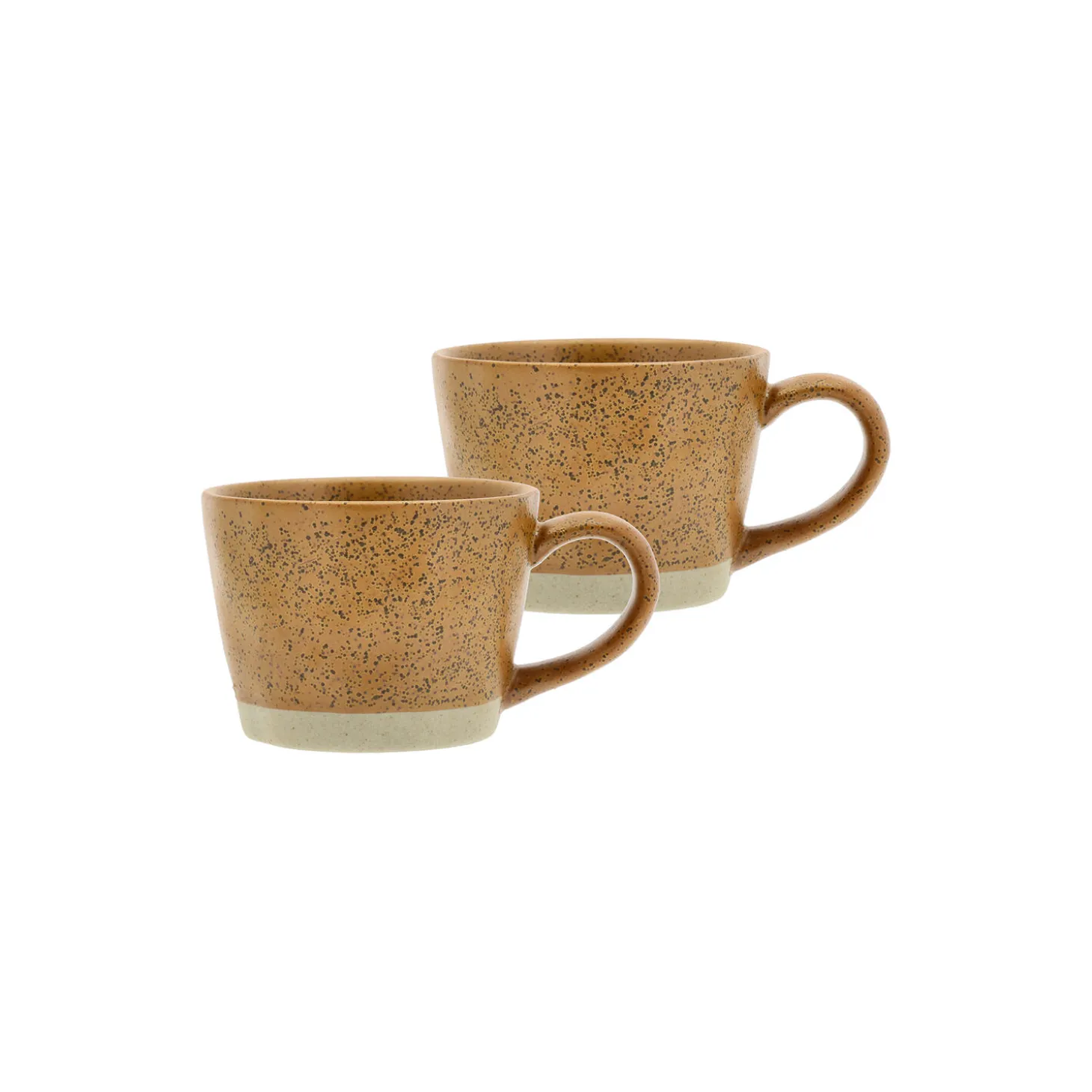 2 porcelænskrus med hank, 30 cl, med en smuk, reaktiv glasur. De har et fantastisk udseende med en unik overflade, da hvert enkelt produkt er hånddekoreret, og derfor kan farve og overflade variere.