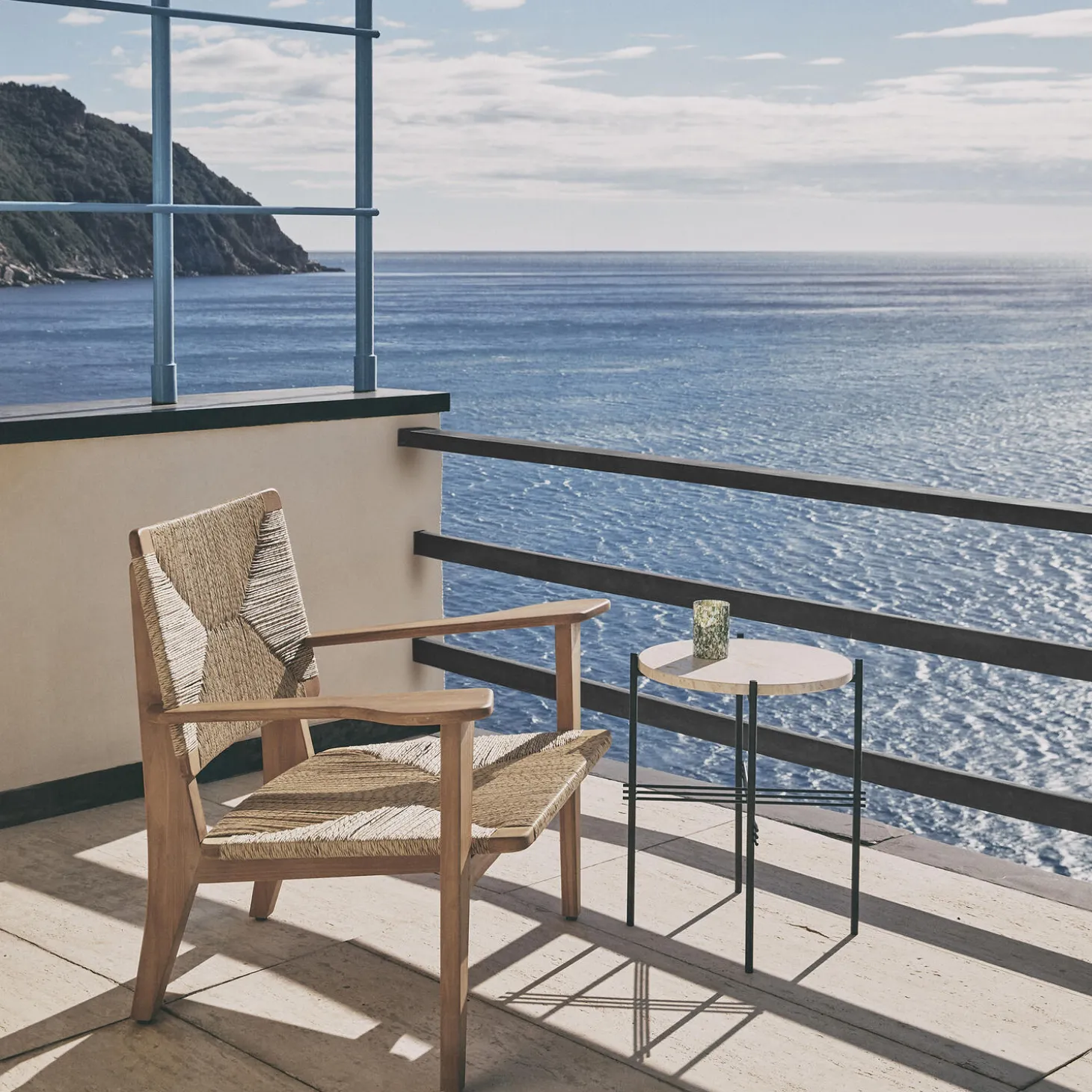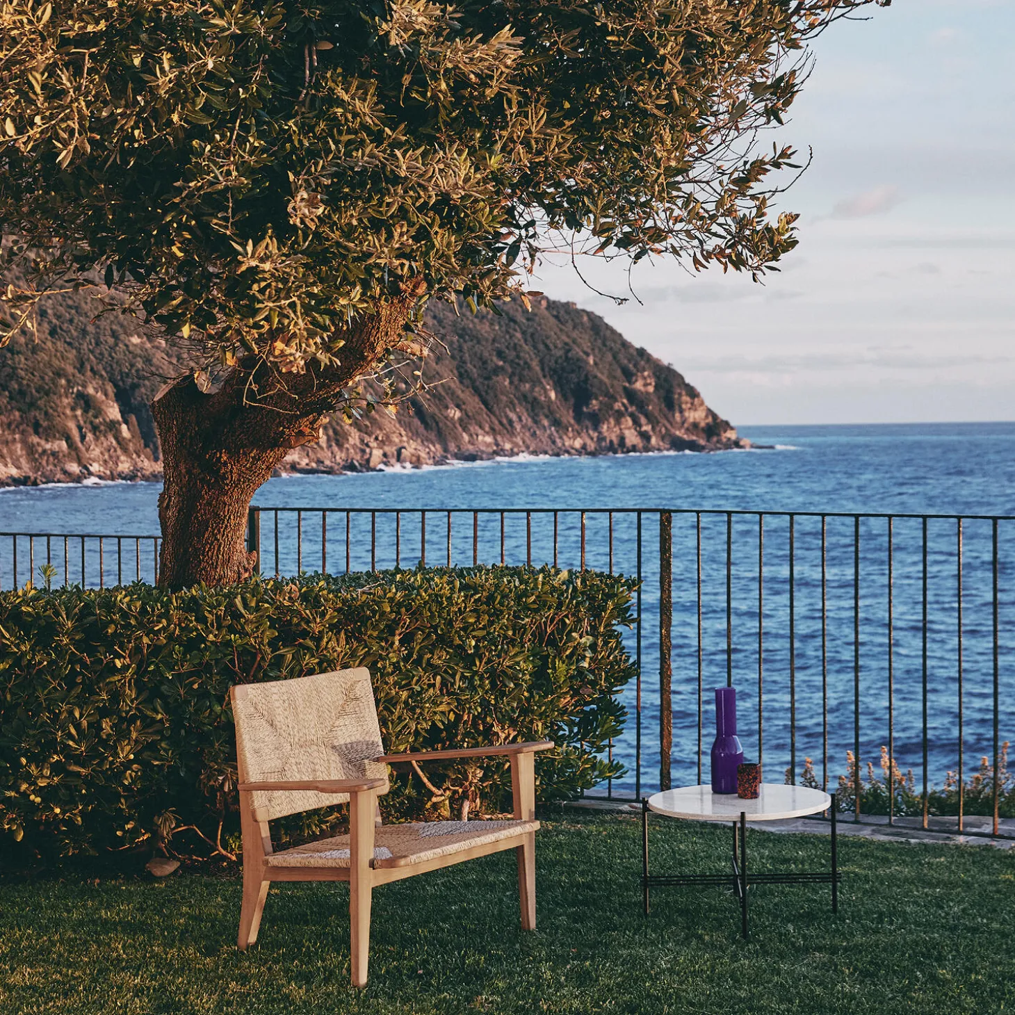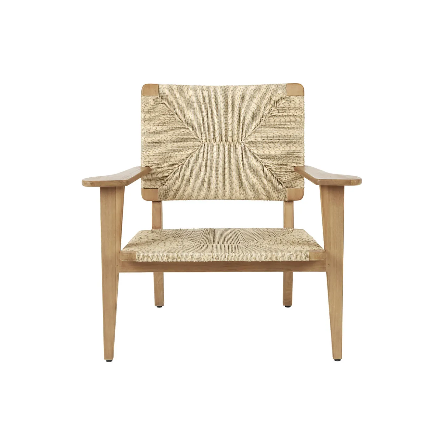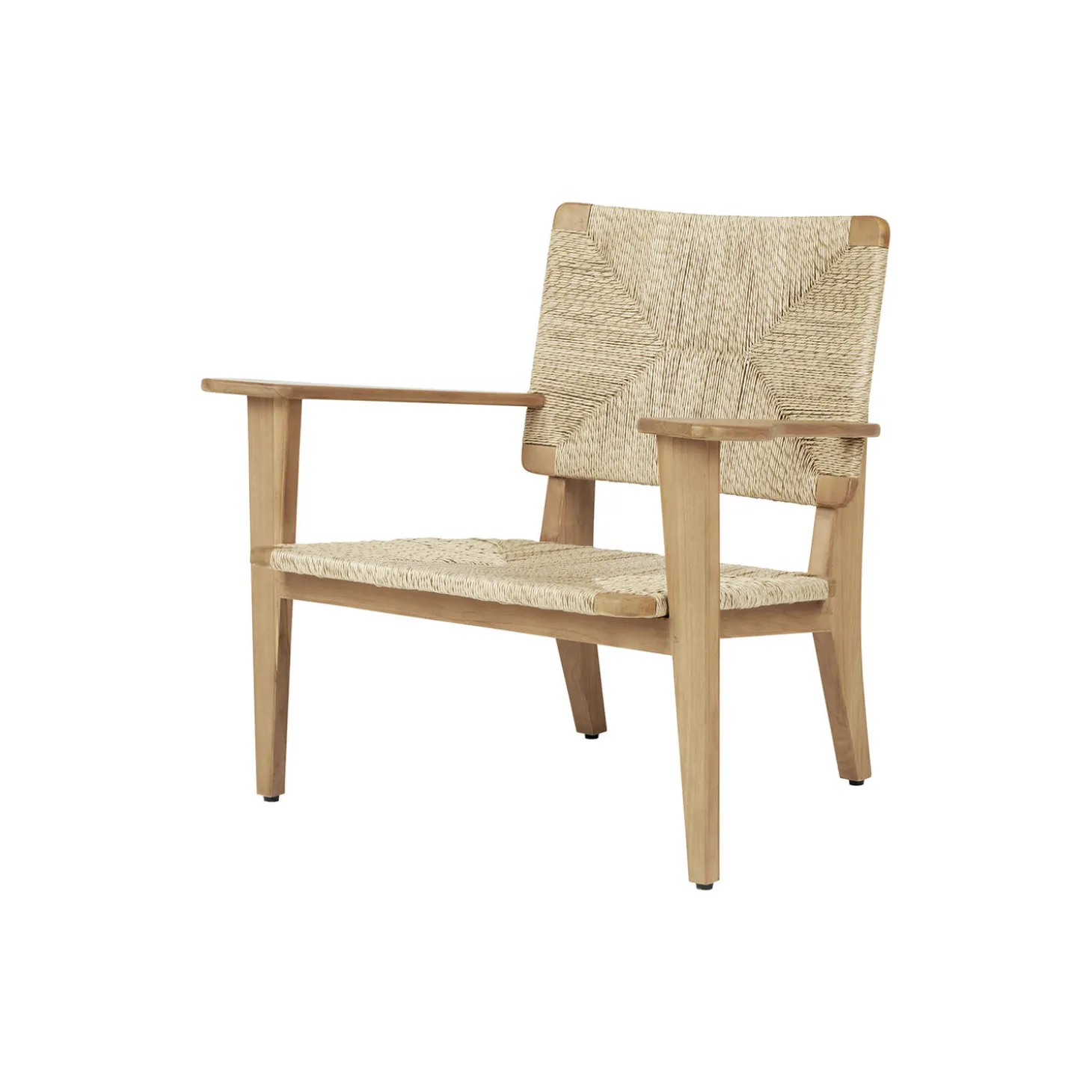 F-Chair Outdoor Lounge Chair i teak med sæde og ryg i flet fra GUBI. Farve: teak. Mål: H: 81 x B: 86 x D: 71 cm. Siddehøjde: 38 cm. Design: Marcel Gascoin.