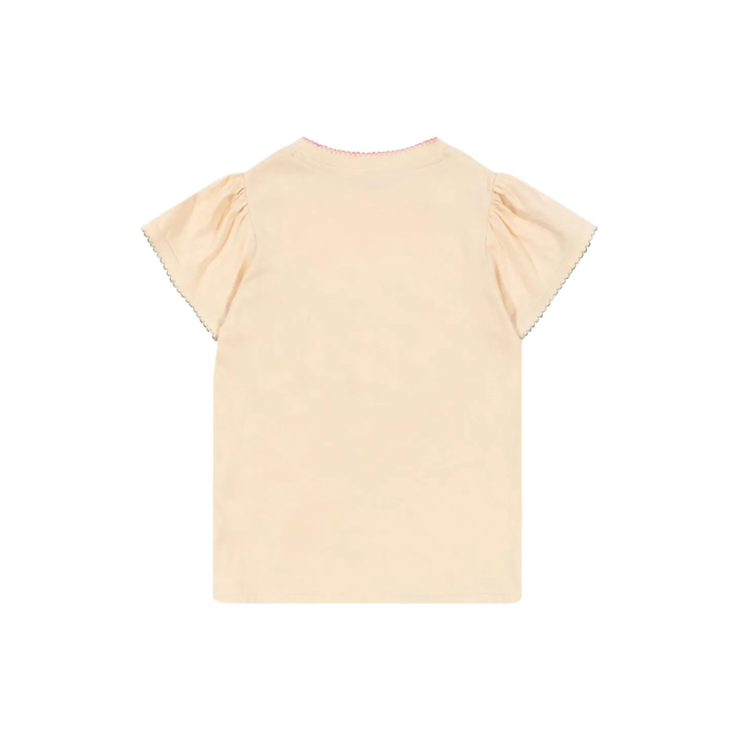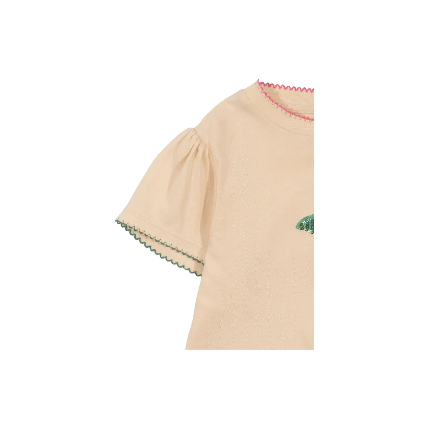 Soft cotton tee with puff sleeves. The tee features snap buttons on the left shoulder up to 18 months for easier dressing. On sizes 2 years and up, the tee features a regular round neck with rib detailing. Material: 100% organic cotton. GOTS, Organic, certified by CU1094701.