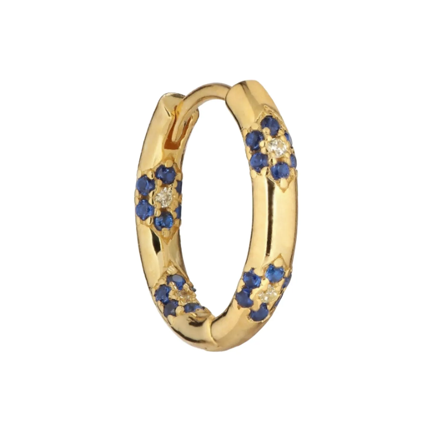 Huggie ørering med små blomster med sten i farverne safir og lys gul. Sælges enkeltvis.