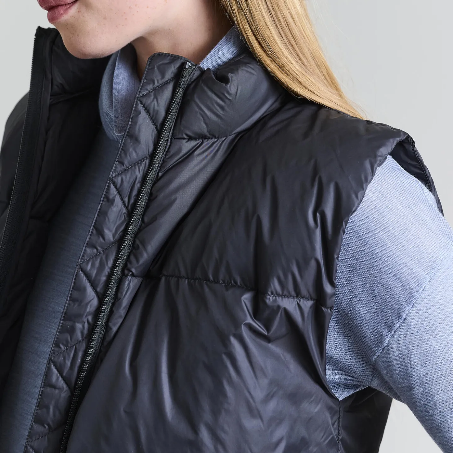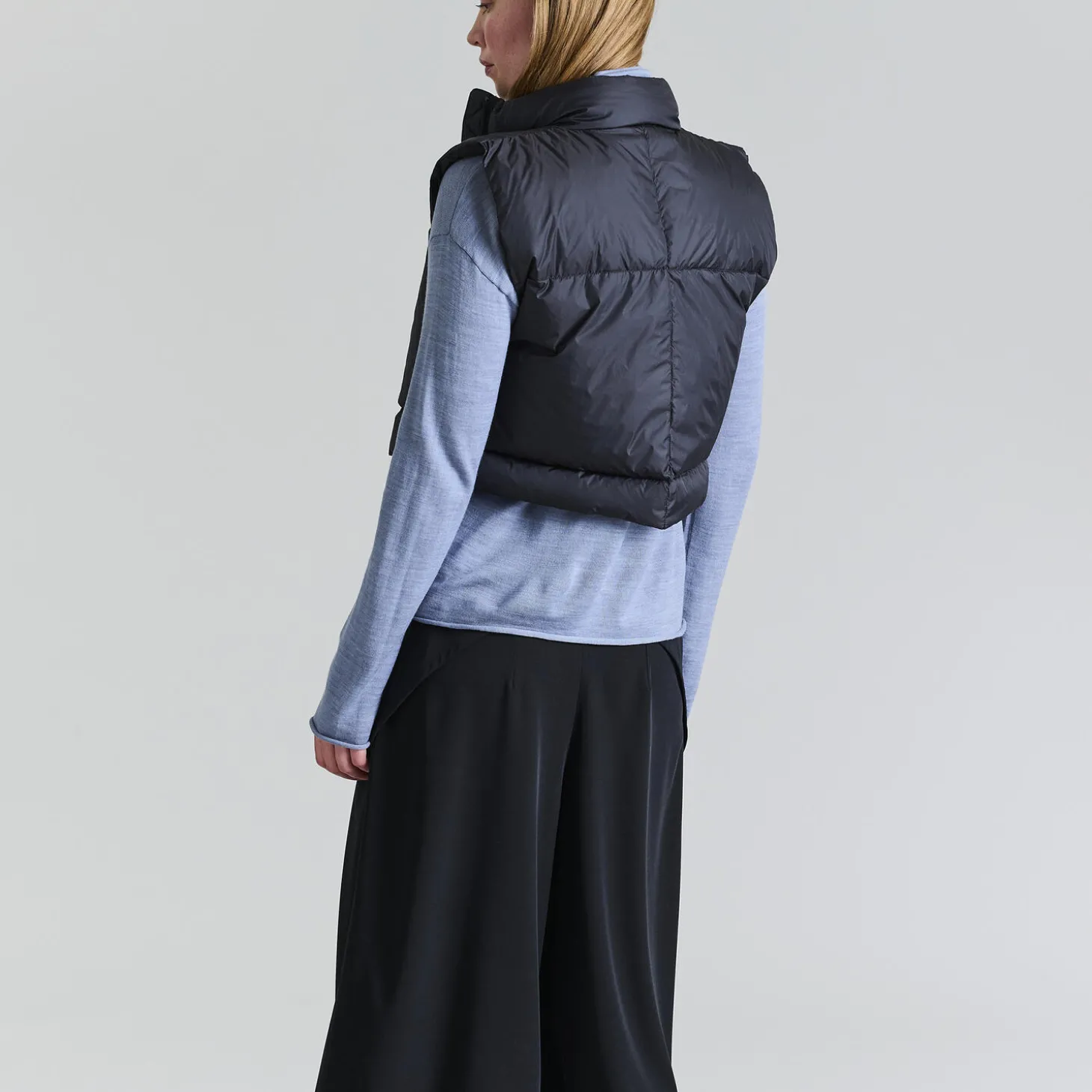 Kort vest i en blød og superlet dunkvalitet. Vesten har et enkelt snit, og den er både elegant og praktisk at tage over fx en skjorte, cardigan, jakke eller bluse, når det er køligt i vejret. Det er som at have en sky på – dog en del lunere. En stilsikker måde at holde sig varm på.