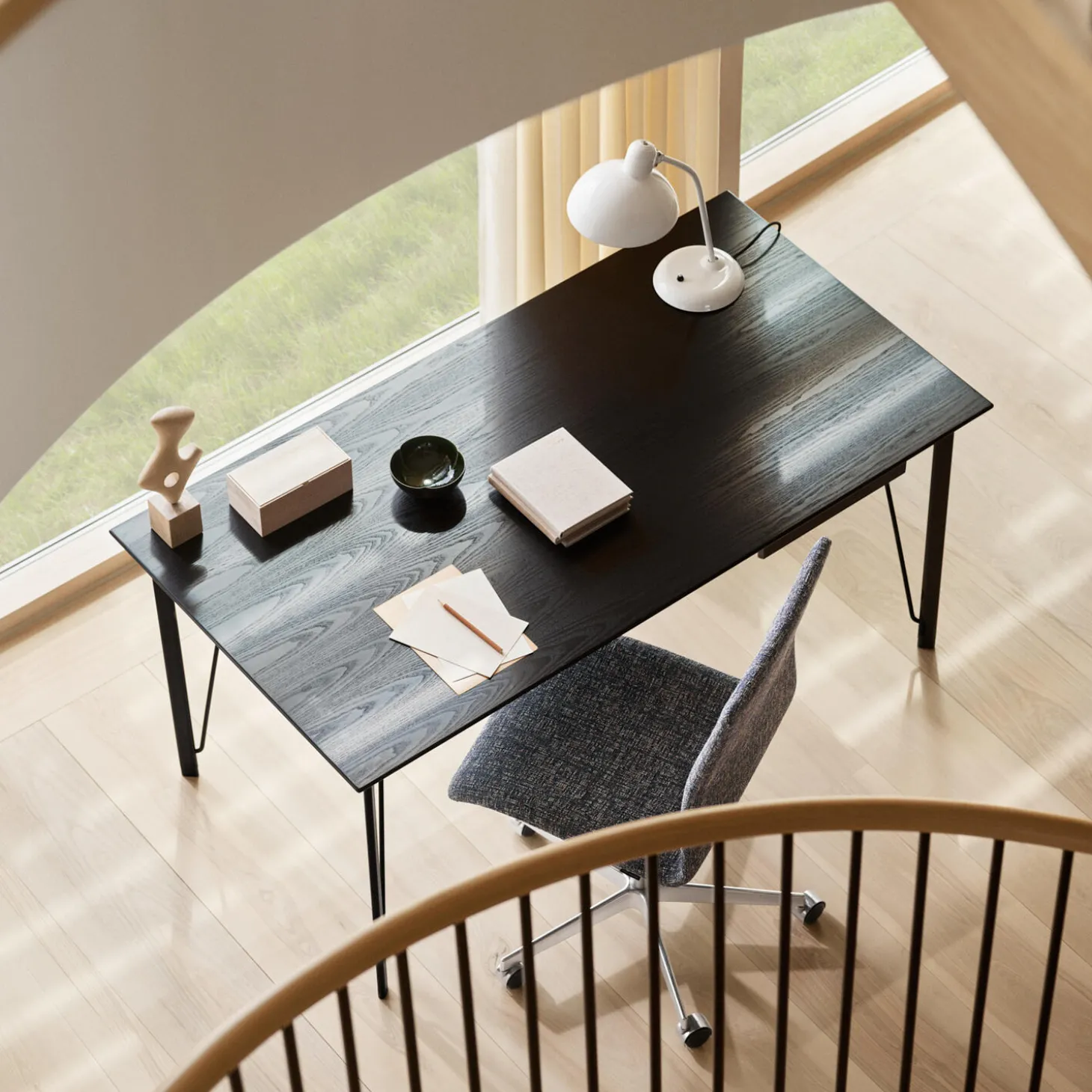 FH3605™ skrivebord i sortfarvet asketræsfinér, MDF og pulverlakeret stål fra Fritz Hansen. Farve: black ash/black. Mål: H: 72 x L: 152 x B: 80 cm. Design: Arne Jacobsen.