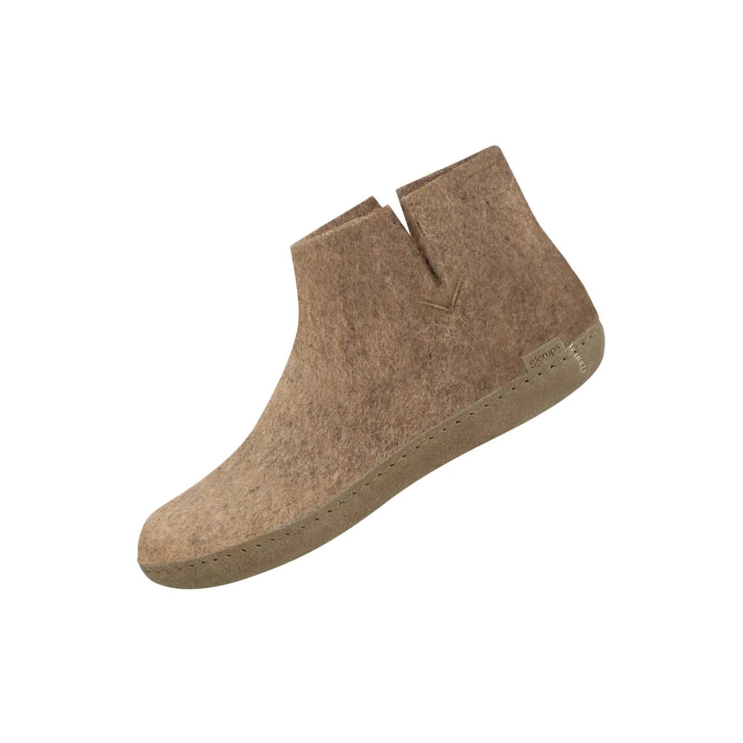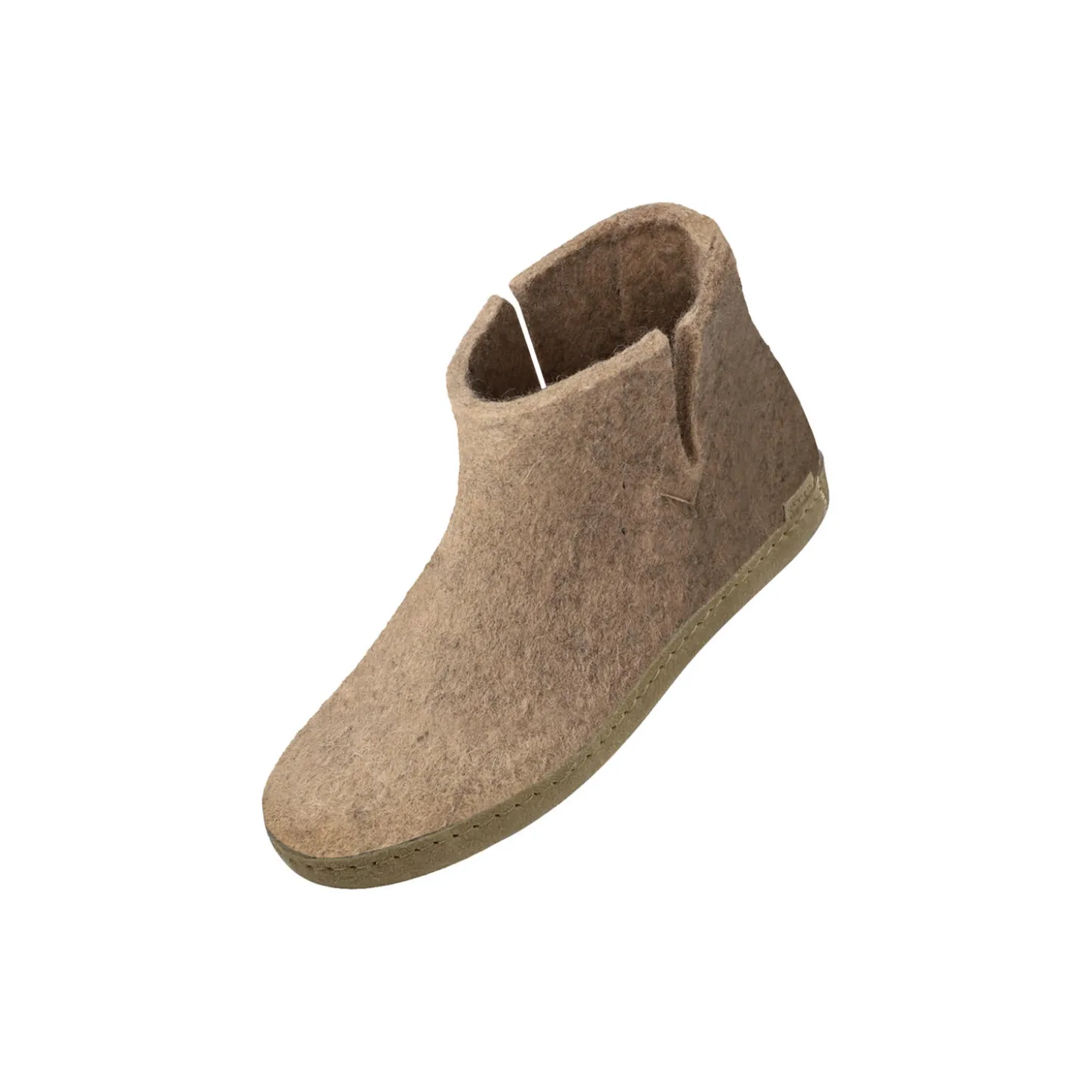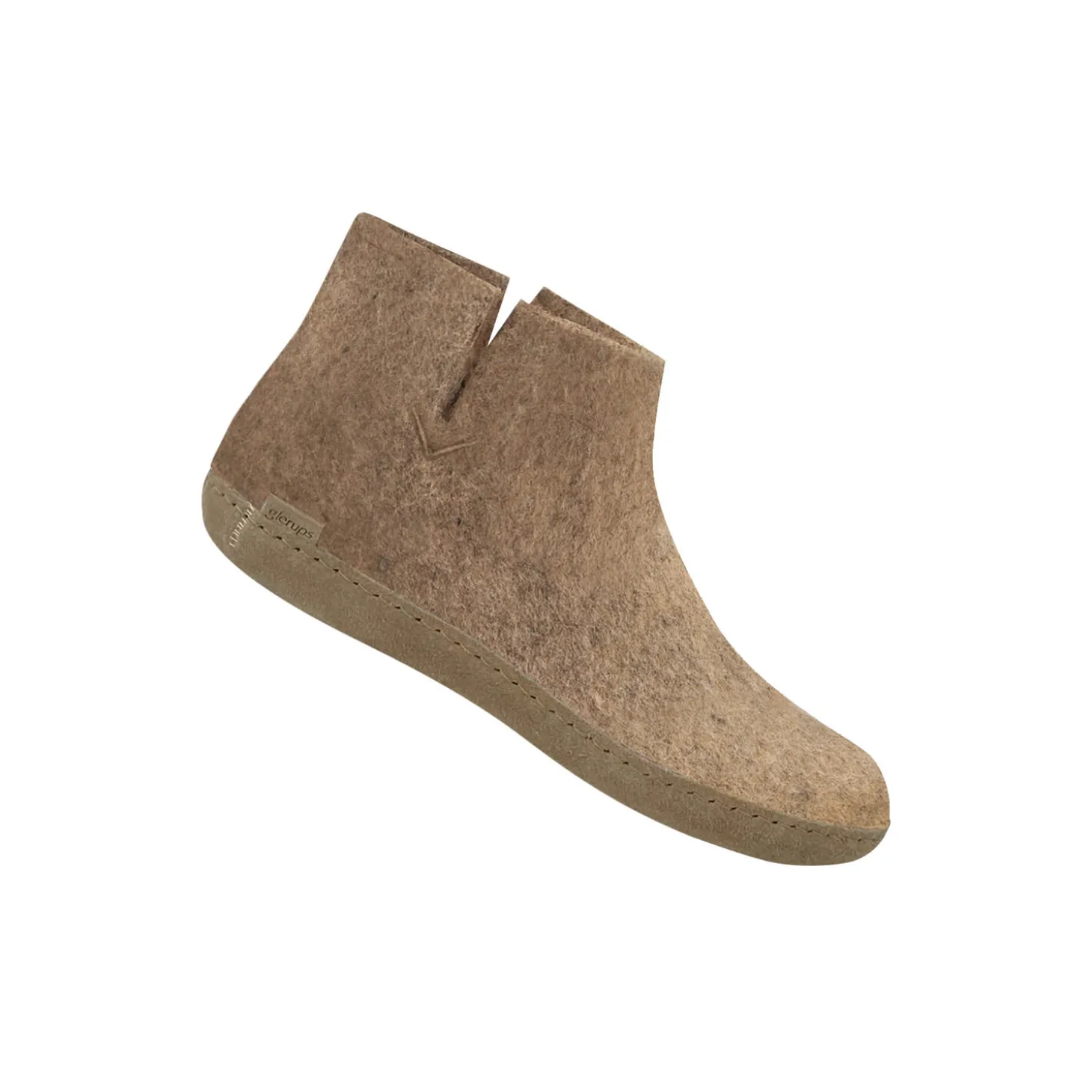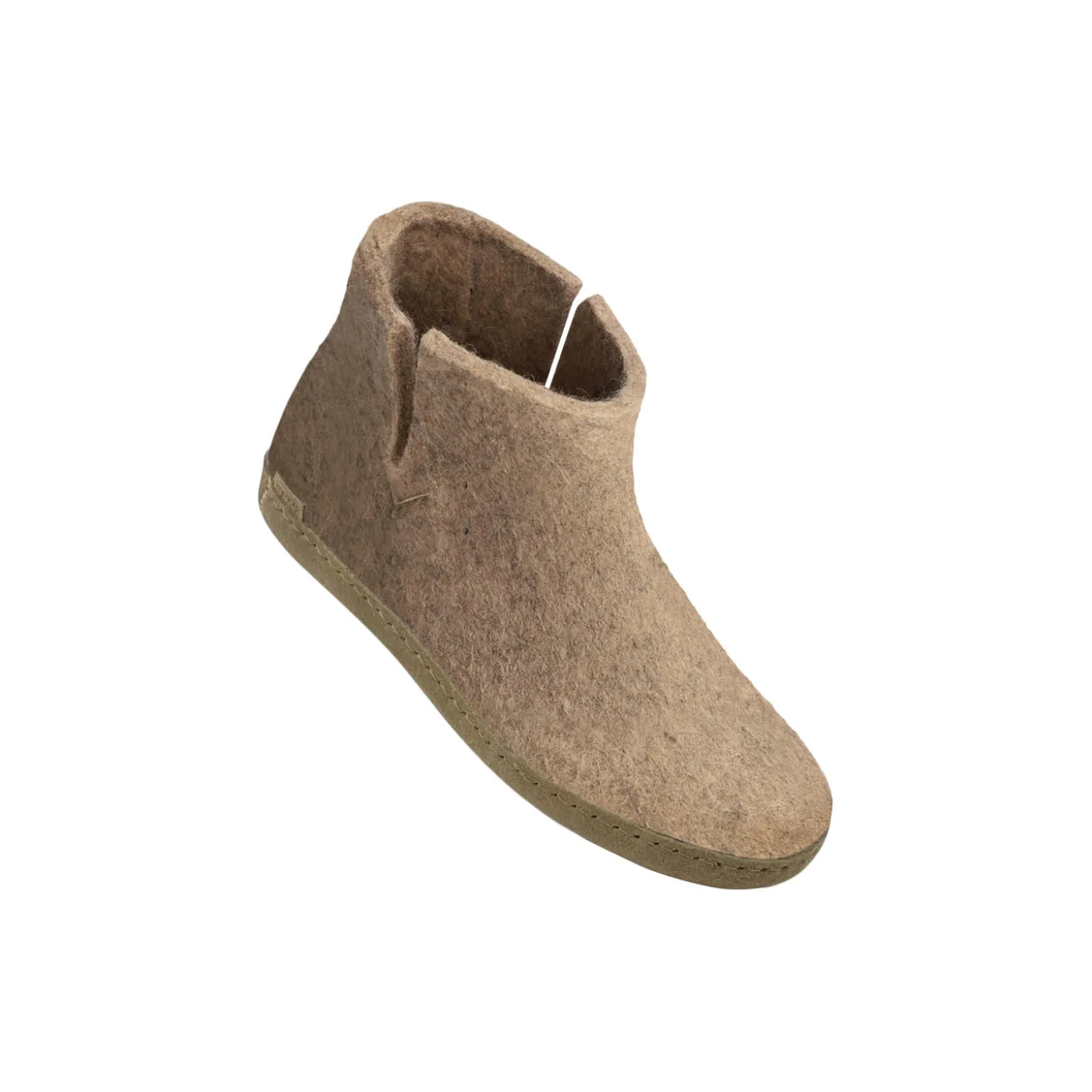 Filt ankelsko af 100% ren naturlig uld med en sål af blødt vegetabilsk garvet kalveskind. Formen på støvlen følger fodens konturer og sikrer, at støvlen bliver på plads. Skaftet slutter ved anklen. Støvlen er fleksibel og holder foden varm og tør, på grund af uldens egenskaber, da den har stor evne til at absorbere fugt.